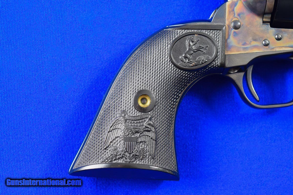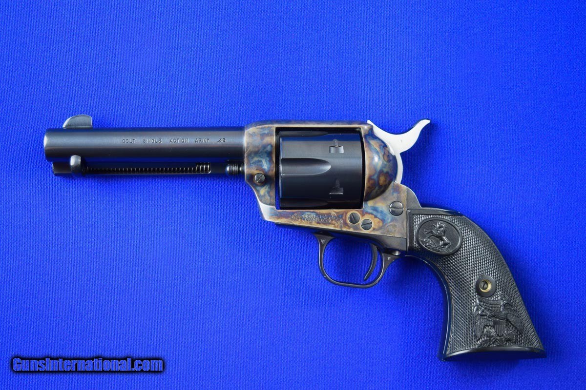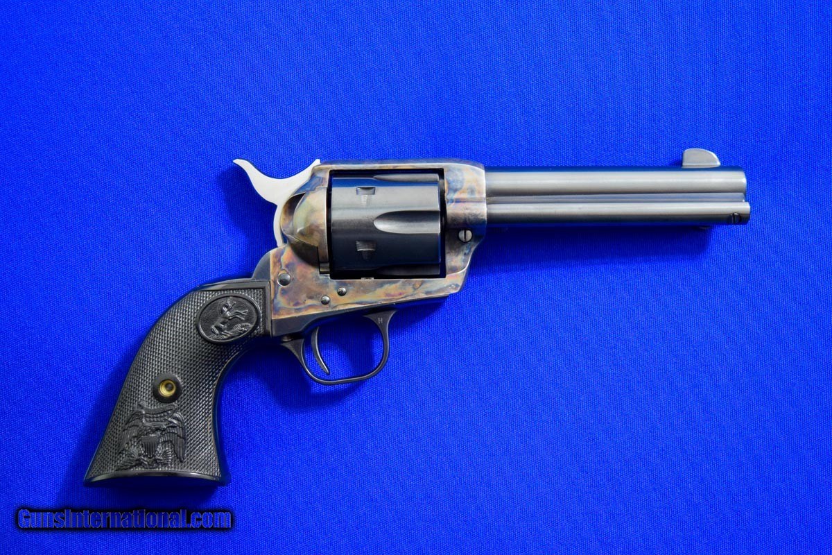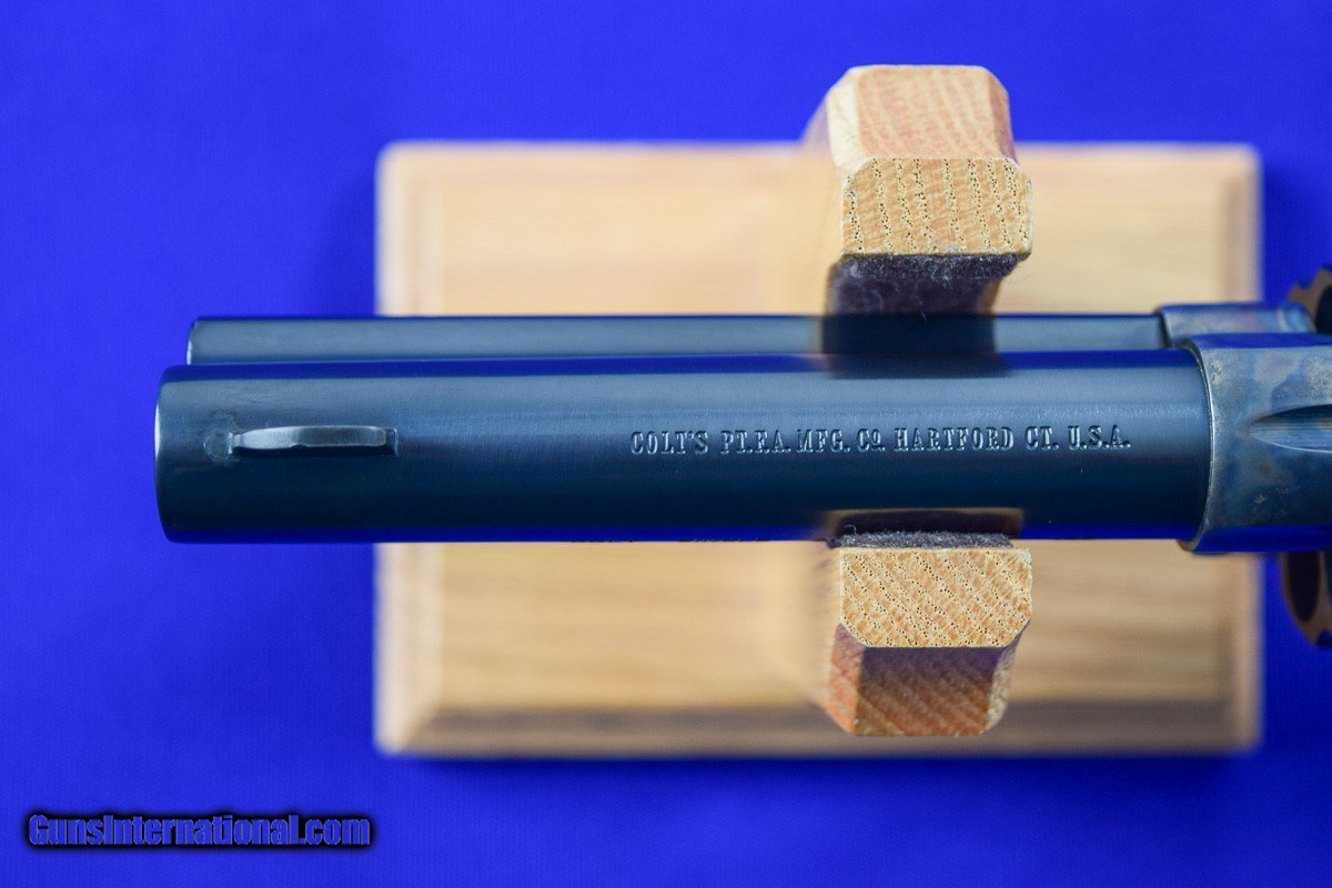 Description: Colt Single Action Army 3rd Generation Model P1840 in 45 Colt, SA30XXX manufactured 1980. Features 4 ¾” bbl with color casehardened frame, fitted with black checkered eagle grips. Condition is NIB, complete with Colt factory woodgrain box with matching end label numbered to the revolver, hang tag & all papers. Big Iron Firearms & Collectibles is a family owned & operated business. We are a licensed FFL Dealer & stand behind all of our listings. We try to replicate all aspects of the firearm in our photos & if you’re not completely satisfied, we will refund 100% of the purchase price during the 3 day inspection period. We Do Not Charge Credit Card Fees, all major credit cards are accepted. We offer a 2% discount on sales price for items purchased with a money order, cashier or personal check, with item held until cleared. Will M. at 260-319-6961 SOLD |