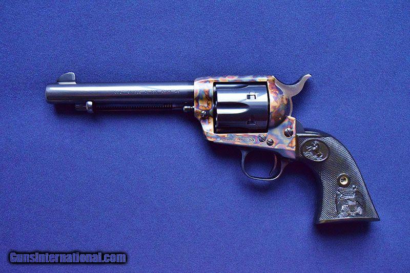 Description: Colt Single Action Army 3rd Generation Model P1850 in 45 Colt, S17XXXA, manufactured 1997. Features 5 1/2” blue barrel with color casehardened frame, fitted with black checkered eagle grips. Condition is NIB, complete with Colt factory blue box with white shipping sleeve with matching end label numbered to the revolver, hang tag & papers. Big Iron Firearms & Collectibles is a family owned & operated business. We are a licensed FFL Dealer & stand behind all of our listings. We try to replicate all aspects of the firearm in our photos & if you’re not completely satisfied, we will refund 100% of the purchase price during the 3 day inspection period. We Do Not Charge credit card fees, all major credit cards are accepted. We offer a 2% discount on sales price for items purchased with a money order, cashier or personal check, with item held until cleared. Will M. at 260-319-6961 SOLD |