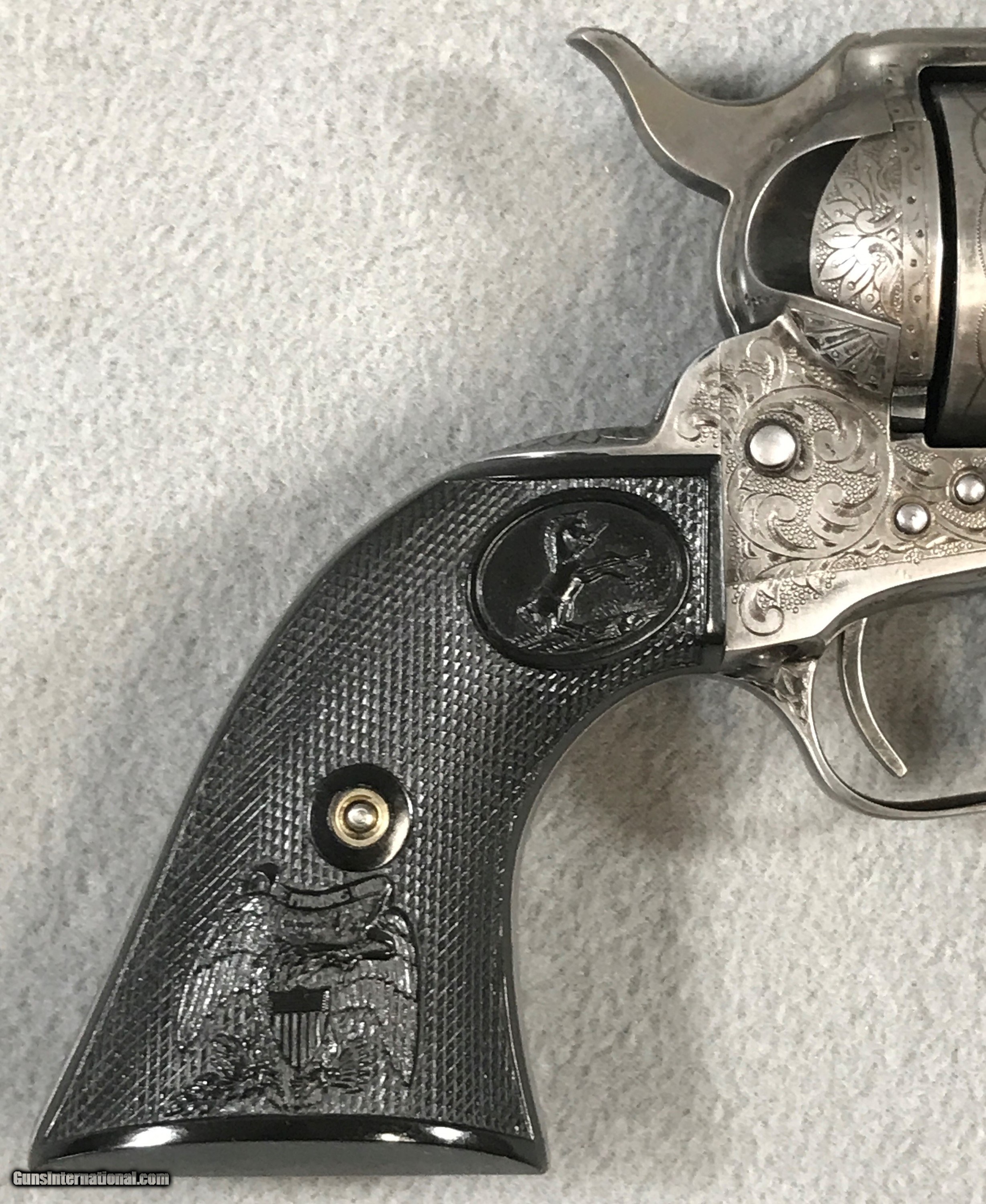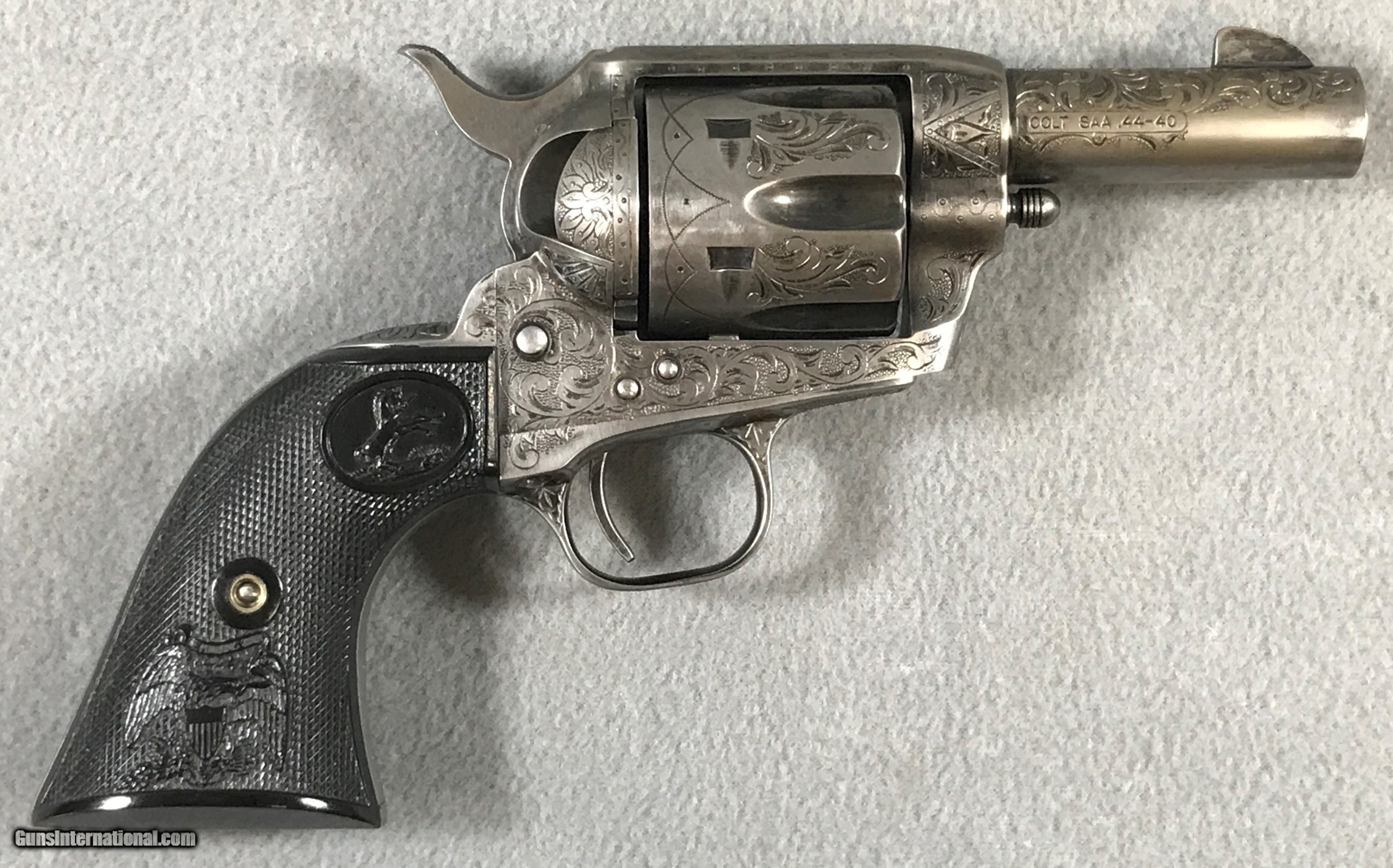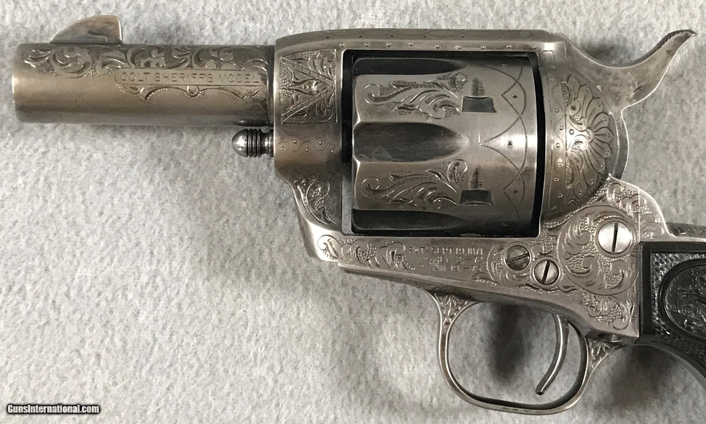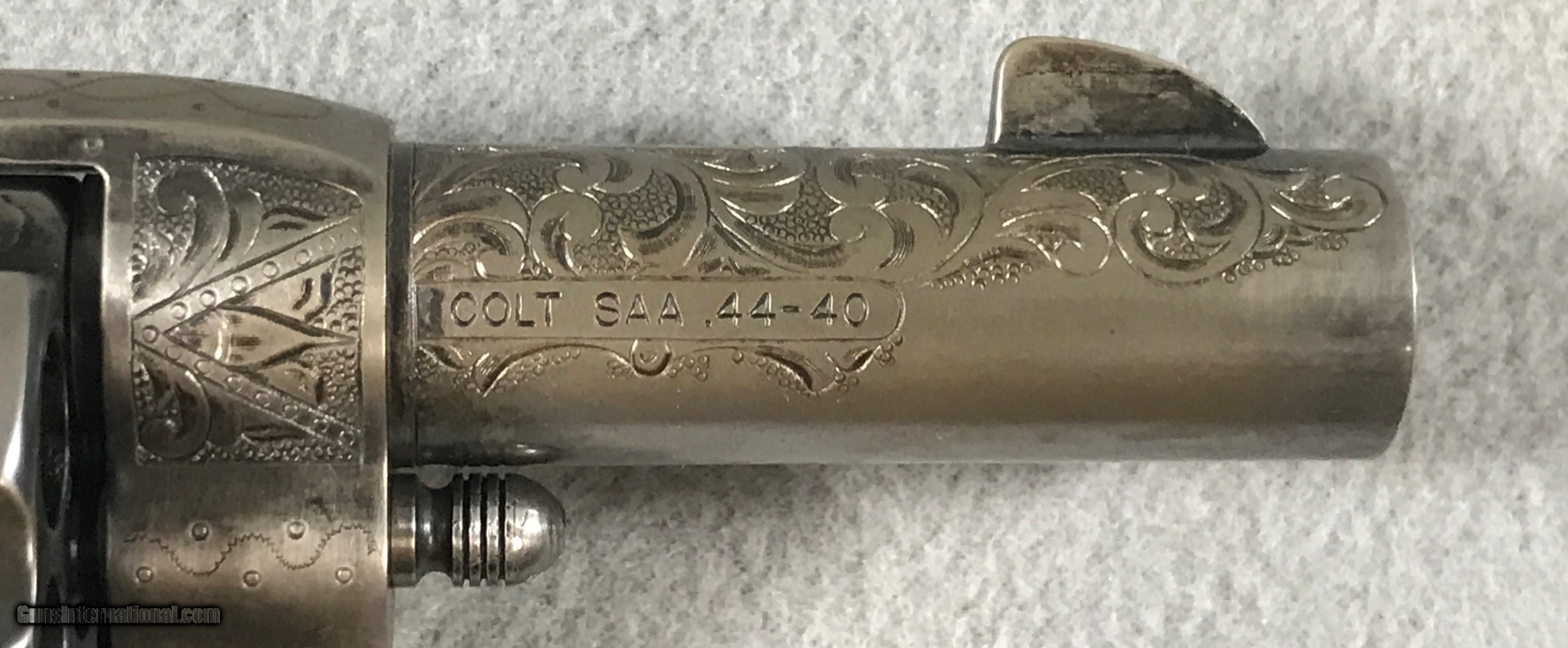 Description: Colt Single Action Army 3rd Generation Sheriff's Model .44-40 WCF Black Powder Frame 3" Barrel 33oz Engraved by Phil L Quigley. Antique or Distressed Finish applied after engraving. Colt Black Plastic Grips Gun is in excellent as refinished condition. It has had an antique or distressed finish applied after engraving. There are traces of original blue in the protected areas. There may be minor handling marks. S&H $100.00 SOLD Handgun Caliber: .44-40 Winchester (.44 WCF) Manufacturer: COLT Model: SAA SHERIFF'S MODEL Serial Number: S60479A Barrel Length: 3 Ejectors: NONE Condition: EXCELLENT Metal Condition: EXCELLENT Bore Condition: EXCELLENT Action: SINGLE ACTION Finish: ANTIQUE / DISTRESSED Weight: 33oz Sights: FIXED Manufacture Date: 2009 Engraving: FULL COVERAGE |