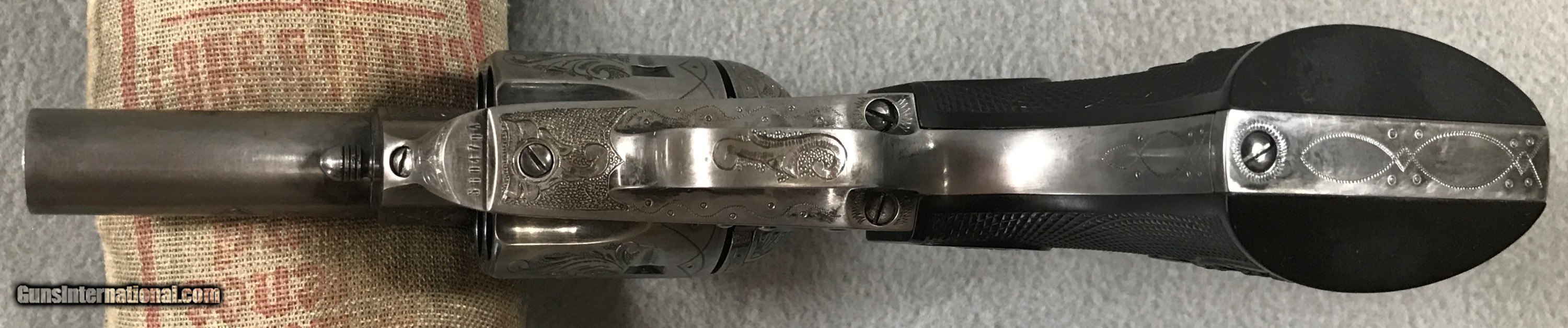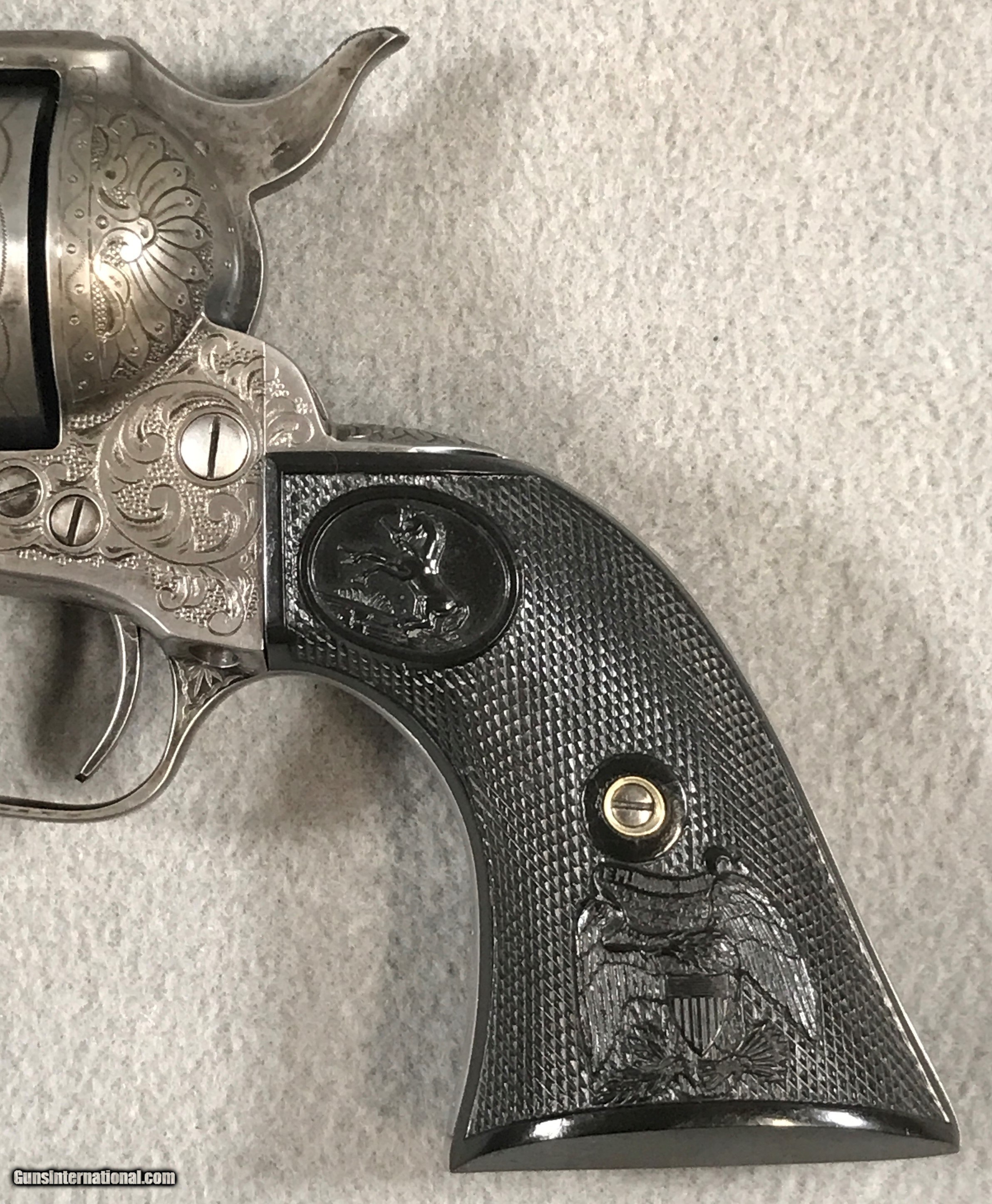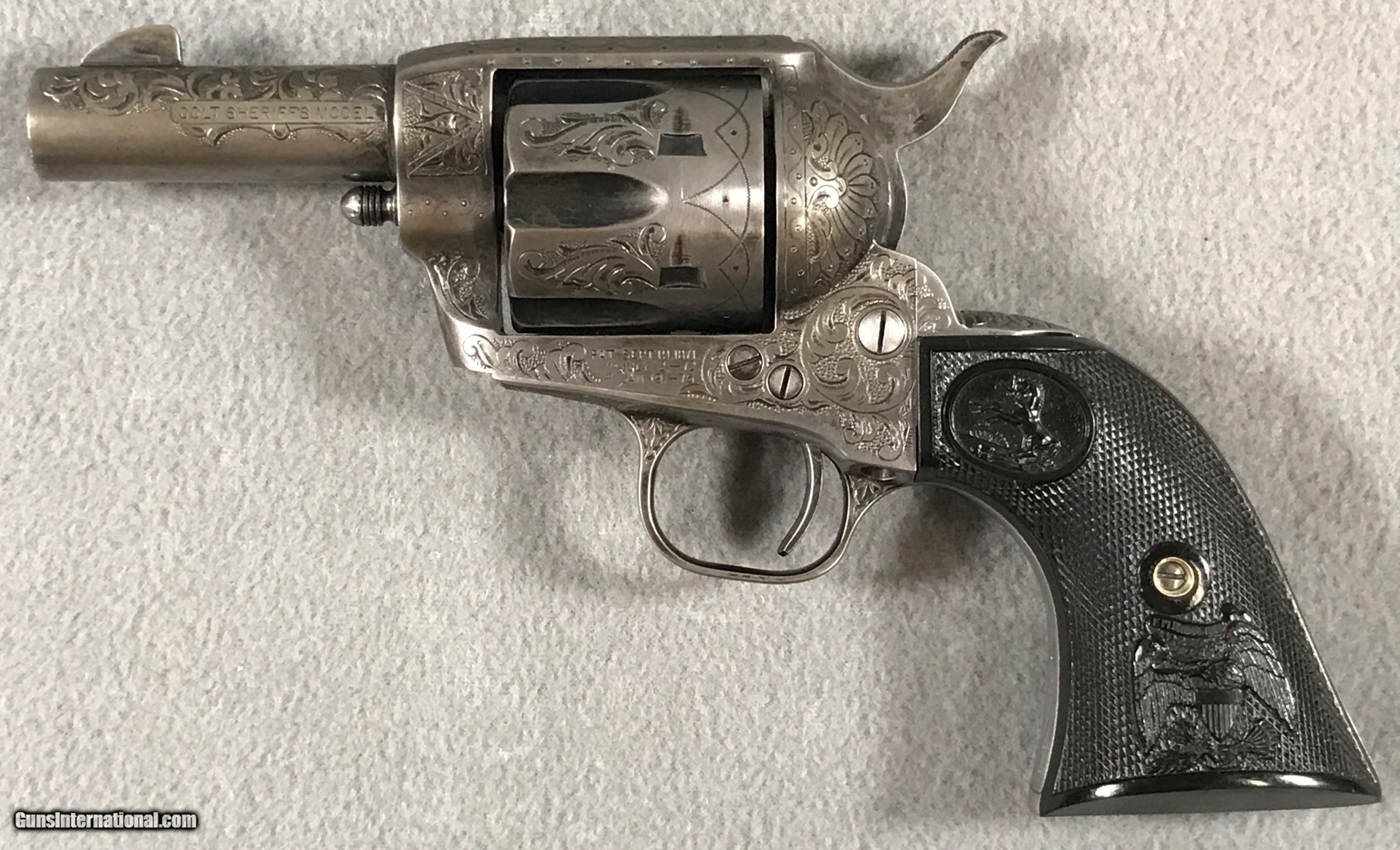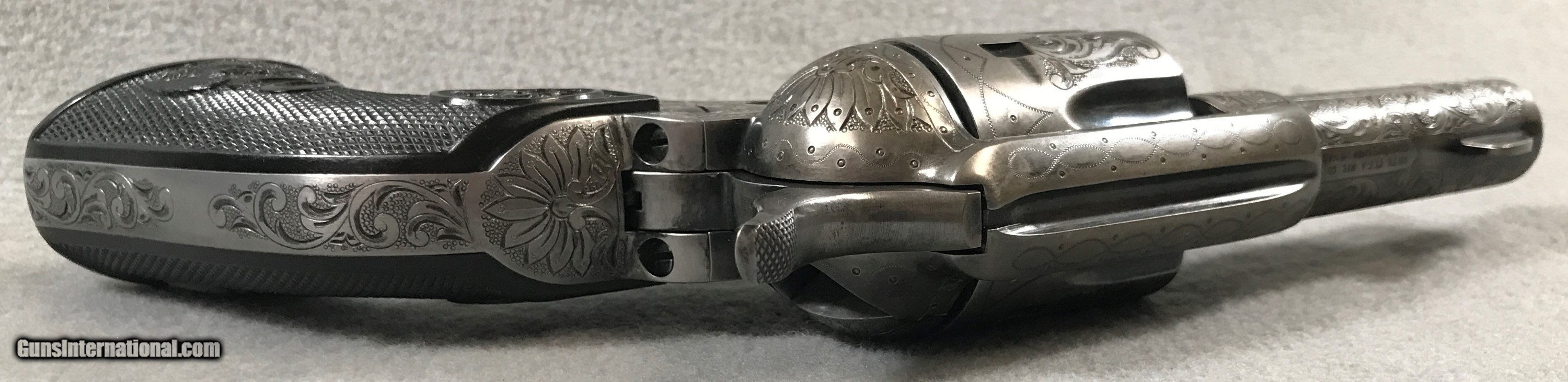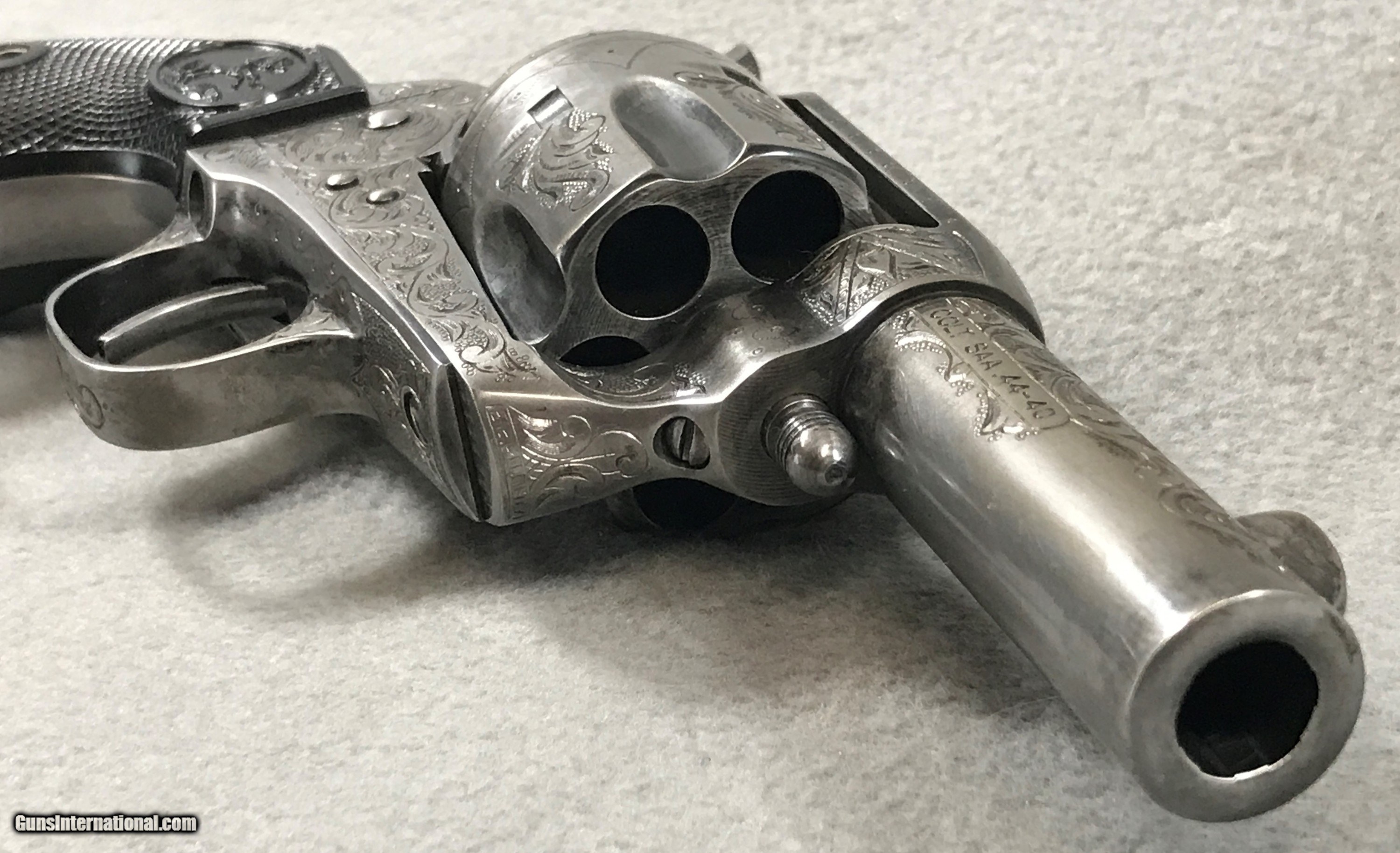 Description: Colt Single Action Army 3rd Generation Sheriff's Model .44-40 WCF Black Powder Frame 3" Barrel 33oz Engraved by Phil L Quigley. Antique or Distressed Finish applied after engraving. Colt Black Plastic Grips Gun is in excellent as refinished condition. It has had an antique or distressed finish applied after engraving. There are traces of original blue in the protected areas. There may be minor handling marks. S&H $100.00 SOLD Handgun Caliber: .44-40 Winchester (.44 WCF) Manufacturer: COLT Model: SAA SHERIFF'S MODEL Serial Number: S60479A Barrel Length: 3 Ejectors: NONE Condition: EXCELLENT Metal Condition: EXCELLENT Bore Condition: EXCELLENT Action: SINGLE ACTION Finish: ANTIQUE / DISTRESSED Weight: 33oz Sights: FIXED Manufacture Date: 2009 Engraving: FULL COVERAGE |