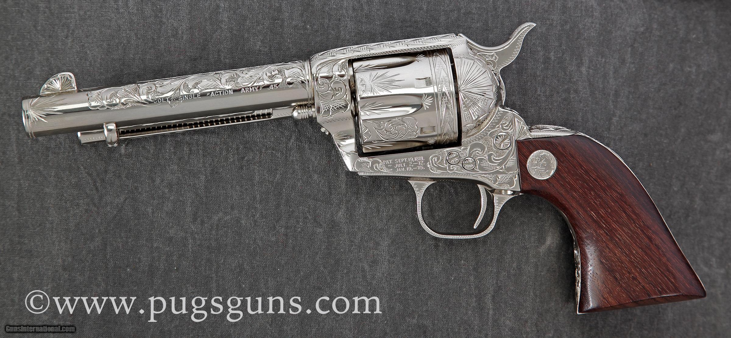 Description: Custom shop gun. Engraved with white cardboard outter box and blue display box SOLD Manufacturer: Colt Model: SAA 3rd Gen Custom Shop Serial Number: SA90691 Caliber Info: 45 LC Barrels: 5.5 Action: PR |
