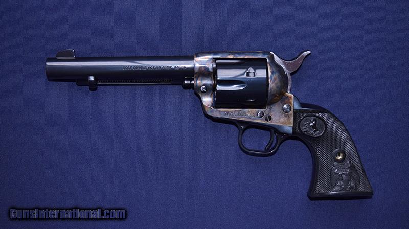 Description: Colt 3rd Generation Single Action Army .44-40, SA49XXX, Model P-1950 featuring 5 1/2" bbl., blue finish with color case hardened frame . Revolvers chambered for .44-40 are the rarest of the 3rd generation standard calibers & were not part of the line until 1980. A total of 2,628 revolvers (not including Sheriff’s Models) were manufactured in this caliber. The P-1950 was the rarest model of the .44-40 caliber revolvers, only 5 were manufactured in this configuration, 4 assembled in 1983 & 1 assembled in January of 1984 noted on page 101 of Wilkerson’s “The Post-War Colt Single Action Revolver, 1976-1986.” Of the 5 revolvers manufactured it is believed that only one shipped from the Colt factory on accident being that this model was for a special project. Complete with Colt factory woodgrain box numbered to the revolver & papers. In near new condition with only light handling/storage marks. The box is fair with some heavy exterior wear especially at the edges. SOLD |