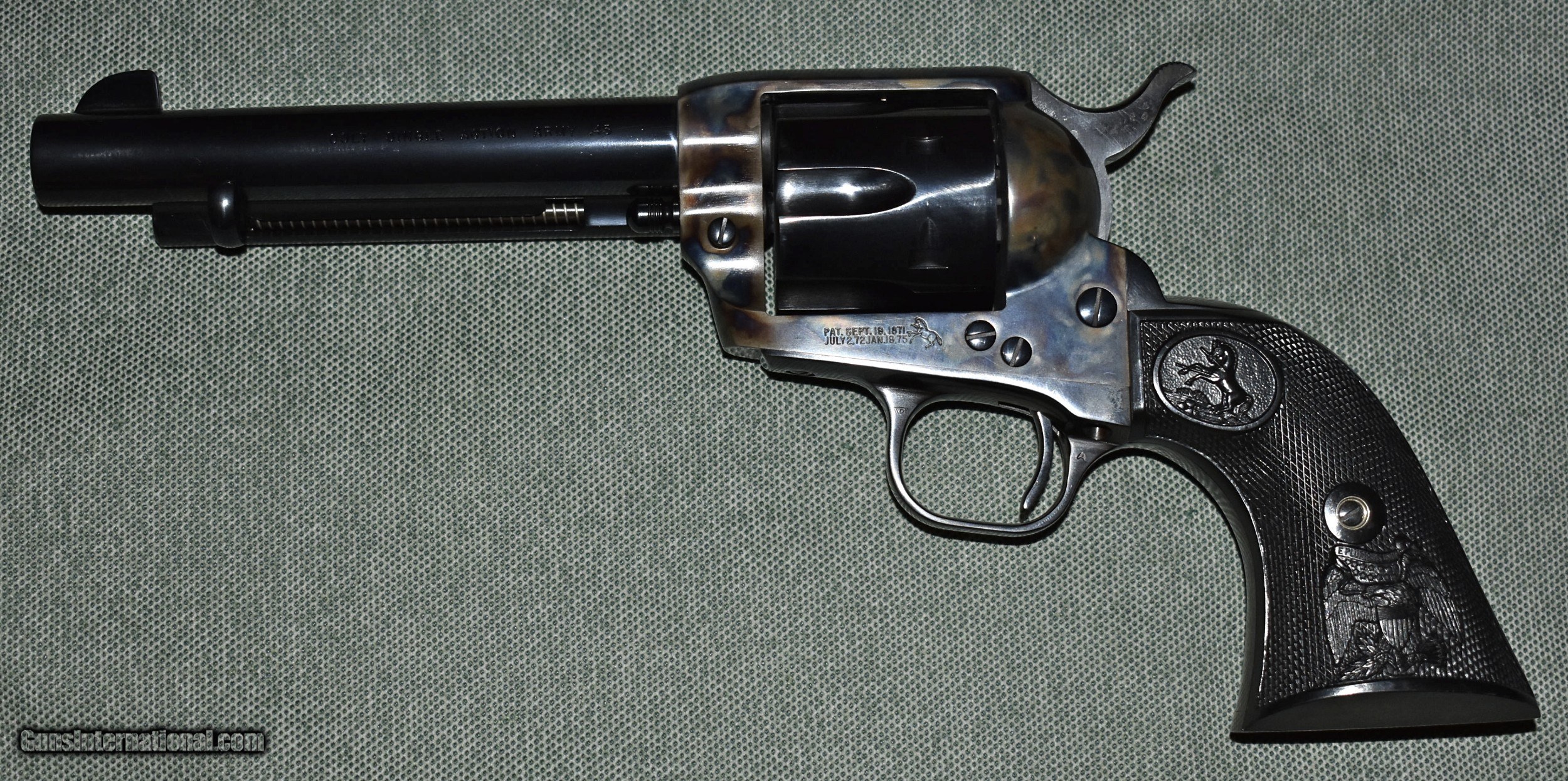 Description: Colt 3rd generation single action army in 45 Colt. This revolver has a 51/2" barrel and is in excellent original condition. It retains 100% of the frame case color and 99% of the barrel and cylinder blue. It has a faint turn line but no other signs of wear. A great SAA to shoot and enjoy. It comes with a Galco holster that is like new and the original box.. SOLD Handgun Caliber: .45 Colt Manufacturer: Colt Model: Single Action Army Serial Number: 558334A Barrel Length: 51/2 Condition: excellent Metal Condition: excellent Wood Condition: mint Bore Condition: mint Action: Revolver Extras: Galco holster |