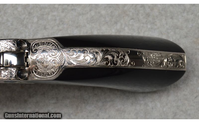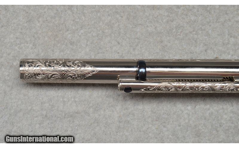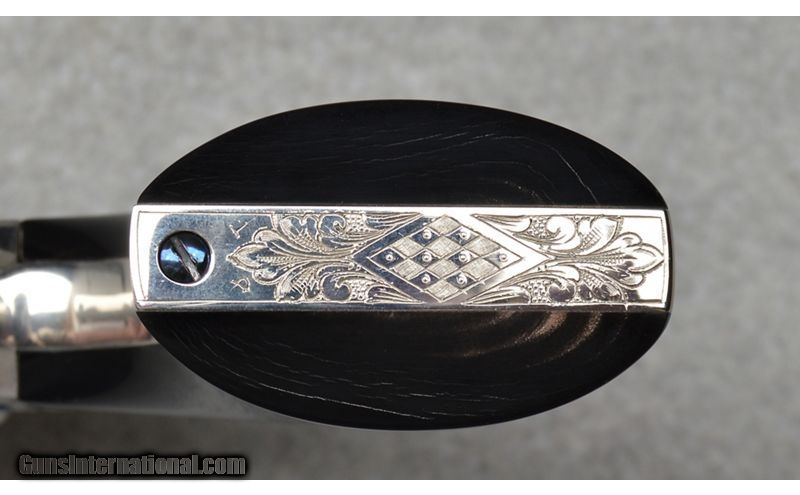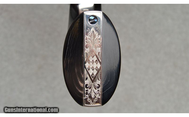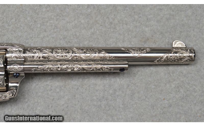 Description: This Denise Thirion engraved Colt Single Action Army, 3rd Generation revolver features 85% coverage floral scroll engraving with initials found on the bottom of the grip frame. Fitted with Buffalo Horn grips, this Colt includes the Blue Colt box and shipping sleeve. This Colt's original nickle finish is in excellent condition with limited handling marks. SN: S36479A Made in: 2004 .38 S&W Special SOLD Metal Condition: Excellent Wood Condition: Excellent Bore Condition: Clean Barrels: 7 1/2 Butt Pad: Horn Grips Weight: 2 lb 13 oz Item Location: Fort Worth, TX |