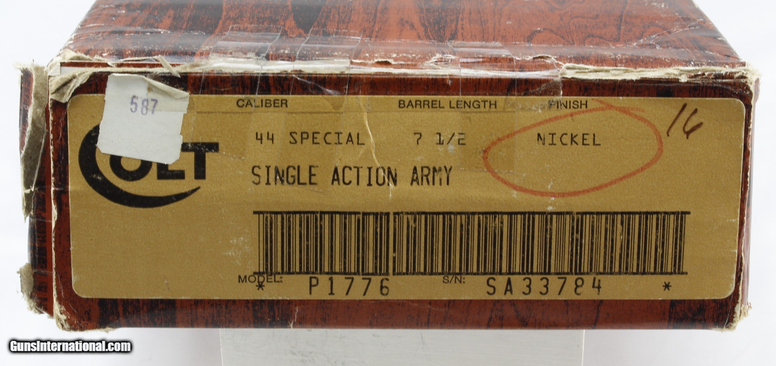 Description: Colt SAA 3rd Gen. Revolver in .44 Spl. SN #SA33784. Mfg. in 1980. 7 1/2" barrel with an "Unfired", other than testing, bore. The Polished Nickel finish is in excellent "Like New" condition as are the Walnut grips. Comes in the original box without paperwork. Box shows some wear. Nice Colt SAA in great condition. More photos available upon request. Ships to Lower 48 W/ Insurance $40.00. SOLD Handgun Caliber: .44 Special Manufacturer: Colt Model: SAA 3rd Gen. Serial Number: SA33784 Barrel Length: 7 1/2 Condition: AS NEW Metal Condition: AS NEW Wood Condition: AS NEW Bore Condition: UNFIRED Finish: Nickel |