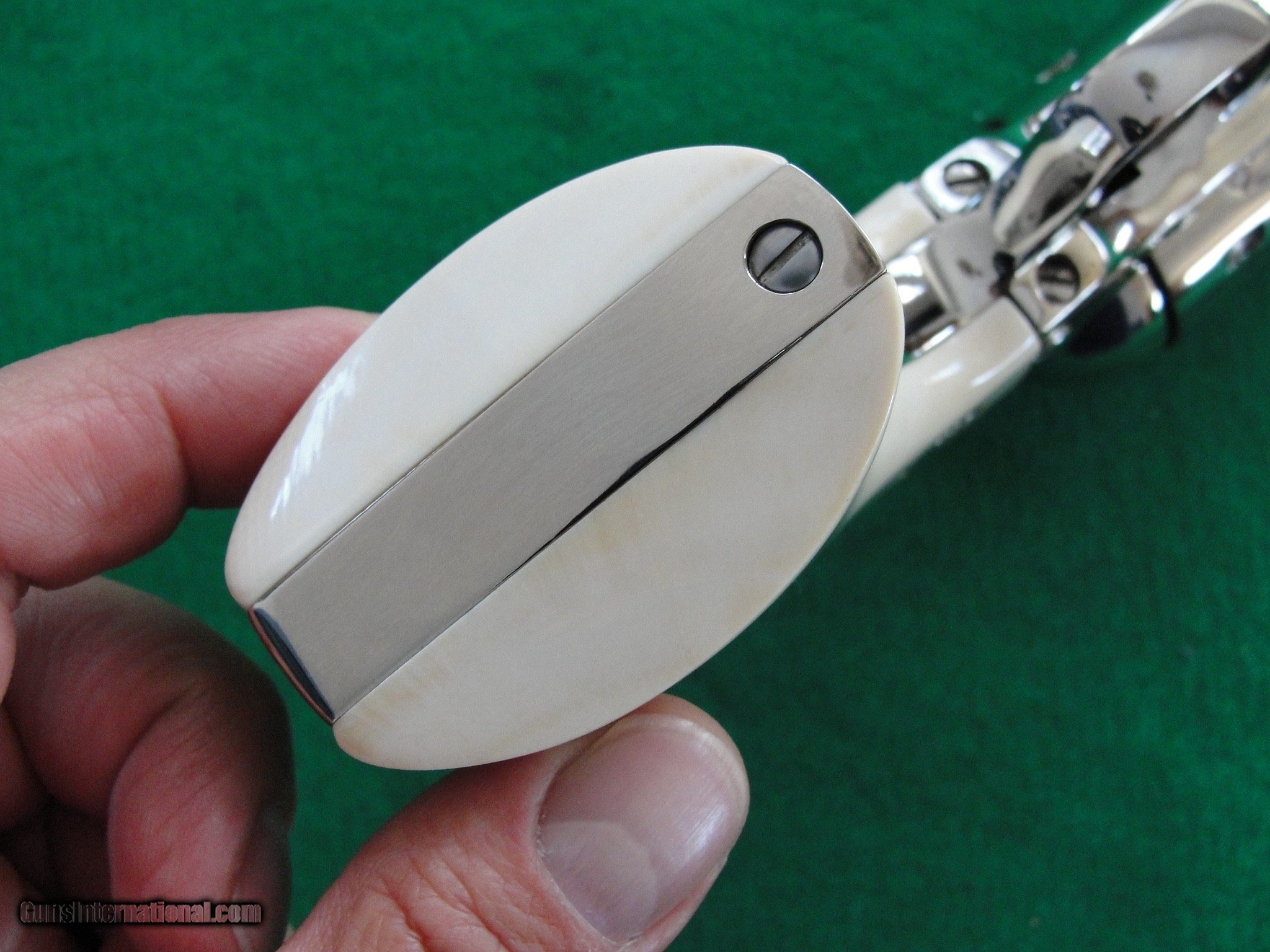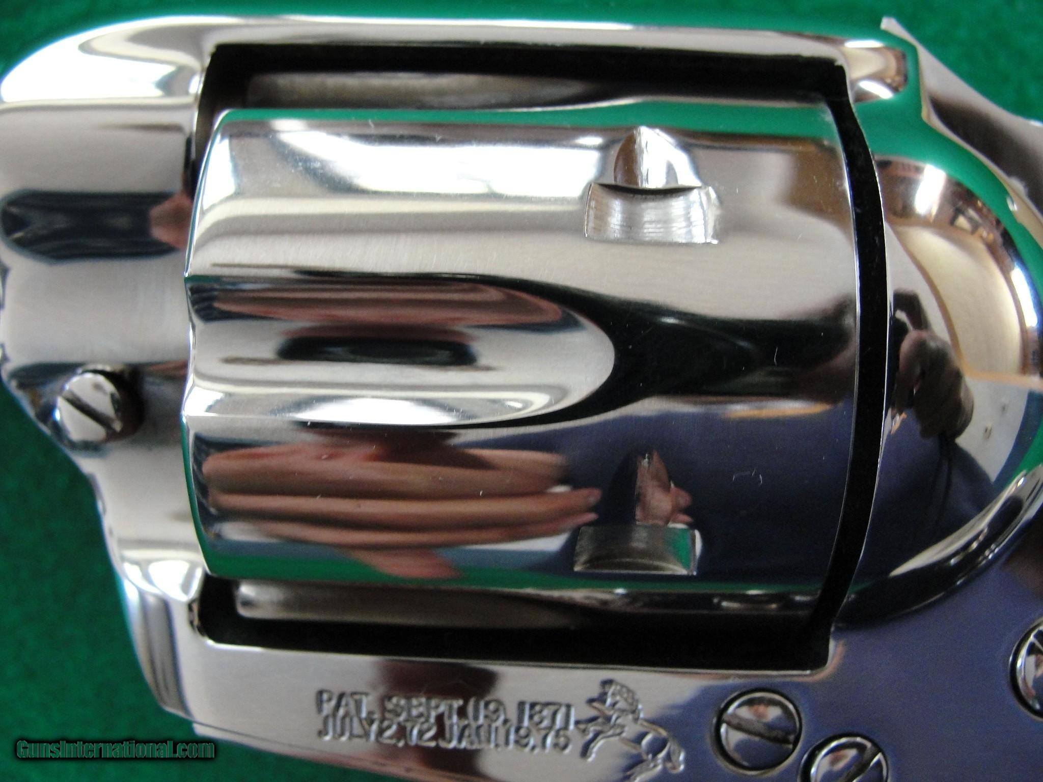 Description: *SOLD* Stunningly beautiful condition, collector quality package. Appears unfired. Period. No turn ring detected on the cylinder. Original box with matching end label. Box shows wear and tear, but still intact. Ser#SA919xx made 1989 Colt 3rd Gen Single Action Army Nickel 5-1/2" 44-40 cal Ivory Grips Email or call for more details. CA sales welcome. SOLD Handgun Caliber: .44-40 Winchester (.44 WCF) |