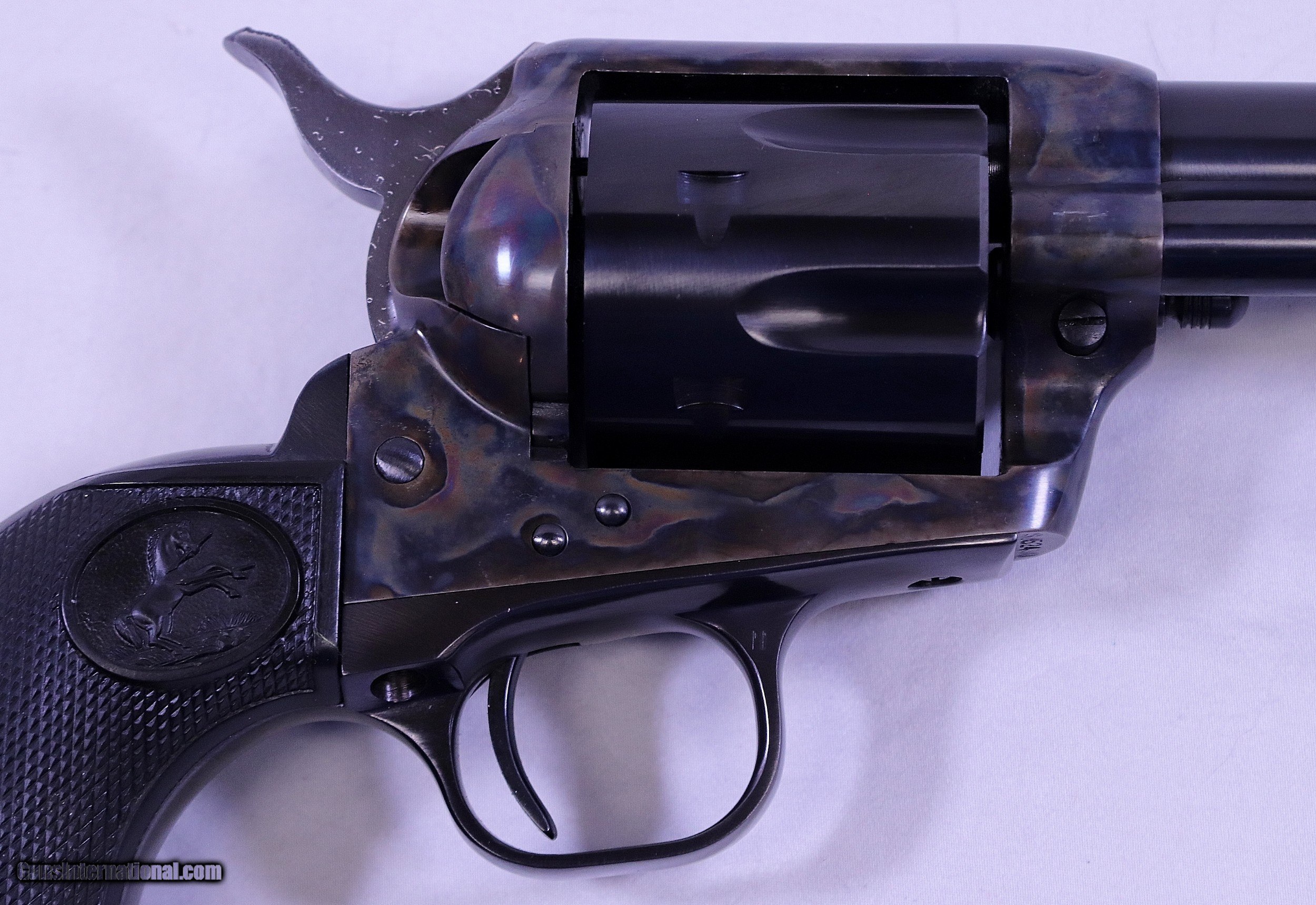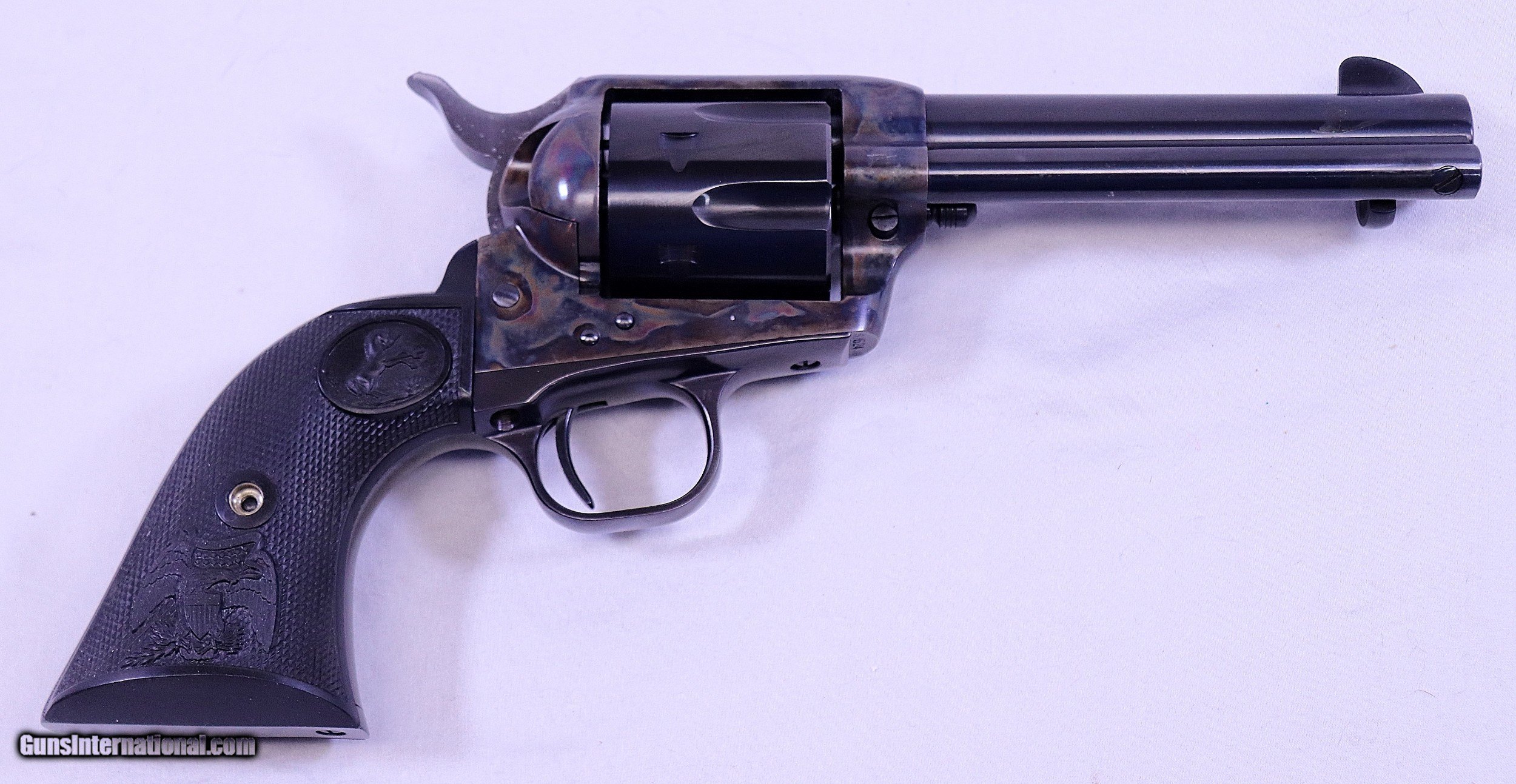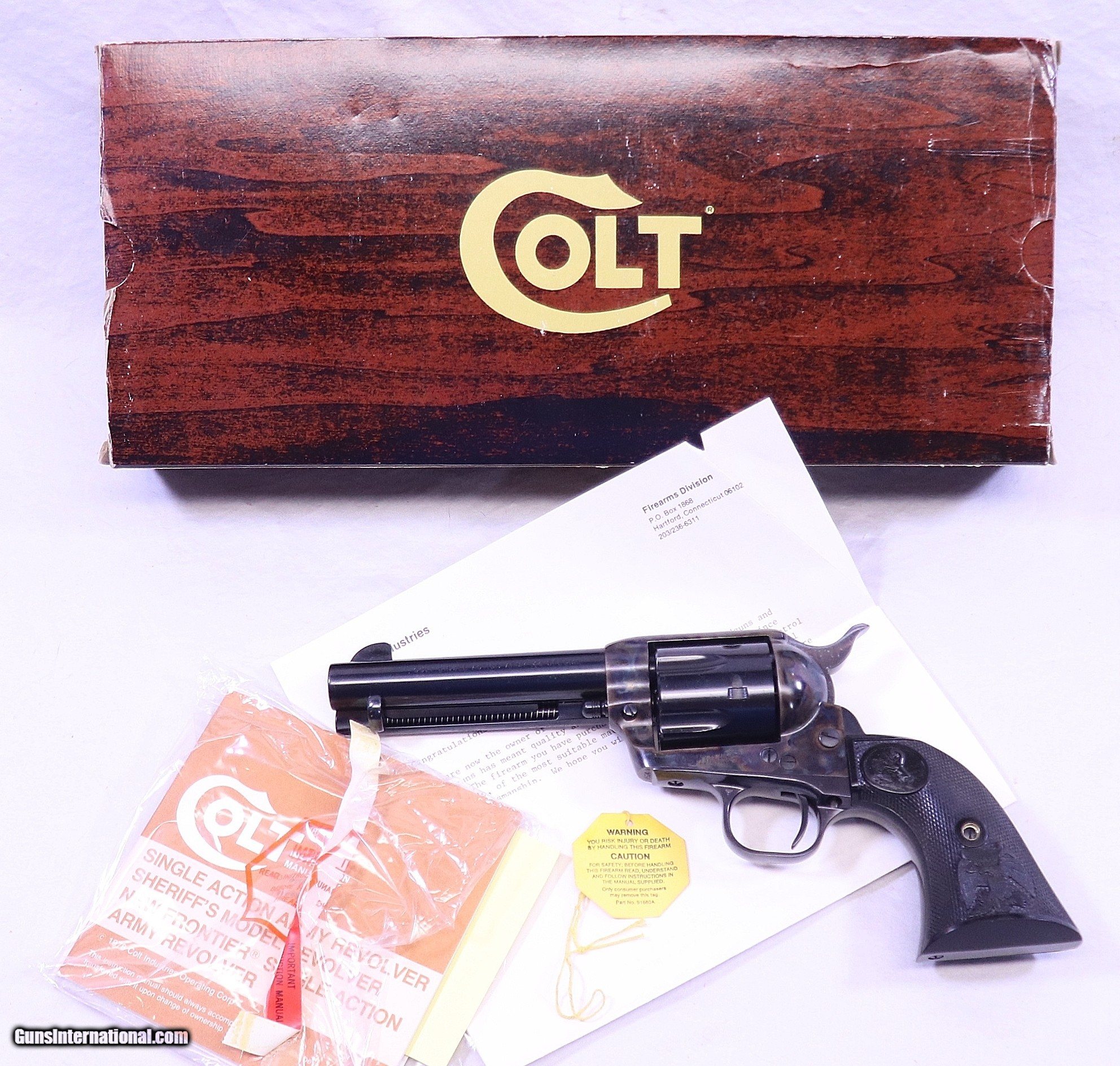 Description: This Colt SAA was Mfg’d. in 1981 and remains in excellent un-fired condition. The finish is in excellent as new original condition. The bore and action are as new as well. It is in the original box with the Manual, Hang Tag, and other paperwork. This is a beautiful 3rd Gen. Single Action Army revolver in .44 Spl. with a 4 ¾” Barrel. Serial Number SA52430. FFL Required. Please check my other Listings for an Identical matching Second gun. It is not sequential serial numbered (SA54220) but otherwise identical in all ways. Beaver Creek Arms TERMS & CONDITIONS Objective: As a collector of 35 years and Licensed Firearms Dealer since 1989 I have a clear definition of a satisfactory transaction. I will be paid as we agreed to, and you will be satisfied with your purchase. My goal is to establish a client list of satisfied repeat customers who will recommend me to other collectors. It’s just that simple. Exiled Saudi princes with secret funds needing change from an over paid purchase need not apply. Notice: ALL Federal, State, & Local firearms laws will be followed. I will take NO shortcuts in the process of a legal sale or transfer, so please don’t ask. SHIPPING: Normally shipments are made via U.S.P.S. Priority Mail, Insured, with a return receipt. Typical Packing, Shipping and Insurance cost for a handgun is $30.00, and for a Long Gun is $45.00. Checks are to be made out to “Steve Clark” Address: 380 Beaver Creek Road, Dillsburg, PA 17019 FIREARMS: Modern firearms, post 1898, can only be shipped to a Type 01 Federal Firearms License address. Curio-Relic firearms, as defined by the BATF list, can usually be shipped to a Type 03 Collectors License address. Some states have additional restrictions such as CA, CT, DC, IL, NJ and NY. A signed valid FFL license copy either mailed or emailed will be required for shipment to only the license address. Antique firearms, pre 1898 do not require a Federal License. For purchase, a copy of a Government Issued Identification (Driver’s License, Etc.), showing date of birth and current address will be required. GUARANTEE: Your complete satisfaction is assured, see objective above. If you are not satisfied, please contact me within 3 days of receipt. Please don’t fire the weapon, safety, function and accuracy are NOT Guaranteed. Any weapon offered by Beaver Creek Arms is never test fired nor is there any representation the gun is functional and safe to fire. These guns are sold for collectors and only represented as used firearms that must be checked by a competent person, observe all the necessary safety precautions prior to attempting to load and fire one of these weapons RETURNS: Returns must be made within 3 days of receipt. They must be received in exactly the same condition with no parts exchanged. If it has been altered, damaged, or fired, a refund will not be made. Packing, shipping and insurance cost will not be refunded. All layaway purchases are returnable for merchandise credit only. PAYMENT: Bank check, Personal check, and Money Orders are preferred. Visa and MasterCard are accepted with a 3% processing fee. For Visa and MasterCard orders please provide the account number, code number, expiration date, name on card, phone number and card billing address. This information can be phoned in, or E-Mailed. All orders must be paid in advance, C.O.D. orders are not accepted. Checks, both Bank and Personal must clear before the order will be shipped, usually a 2 week delay. LAYAWAYS: A 20% deposit is required. Balance is due in 60 days. Deposits are non-refundable and are forfeited after 60 days. Layaway sales are returnable for merchandise credit only. SALES TAX: Pennsylvania state sales tax is 6% for in state purchases. The payment of other states sales tax, if applicable, for shipped items is the buyer’s responsibility. DISCREET: Client information will remain Confidential. Your privacy is protected. SOLD |