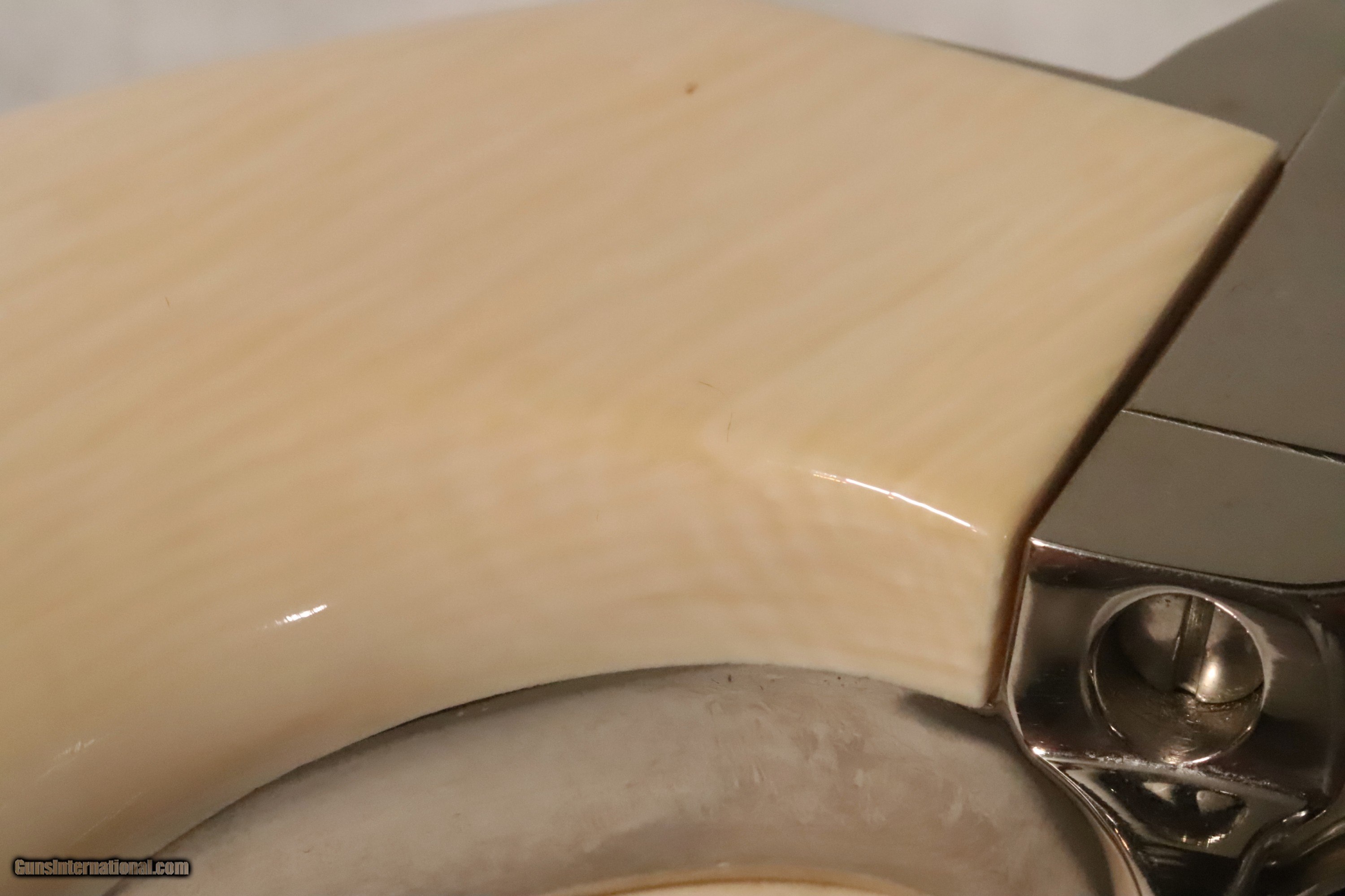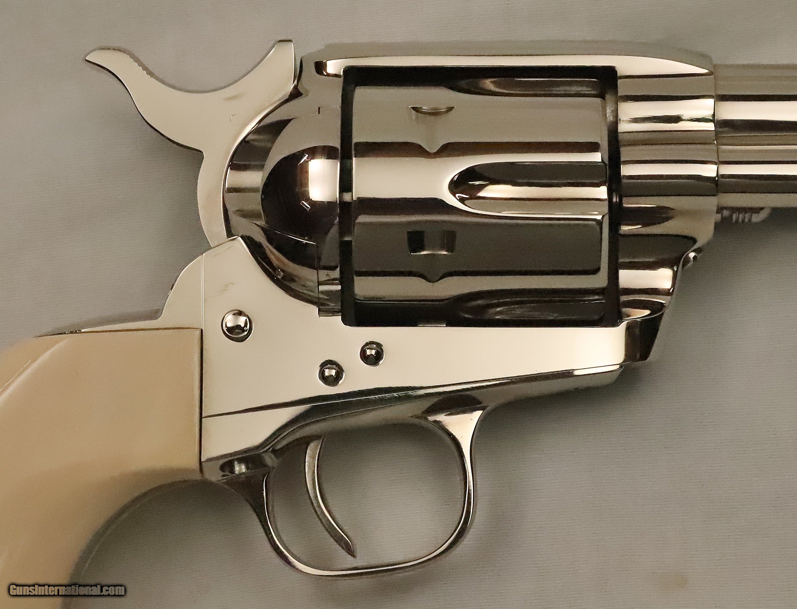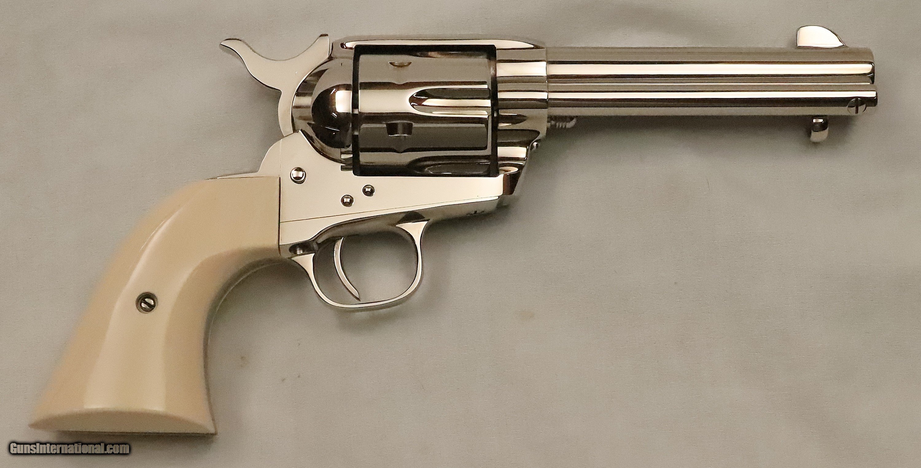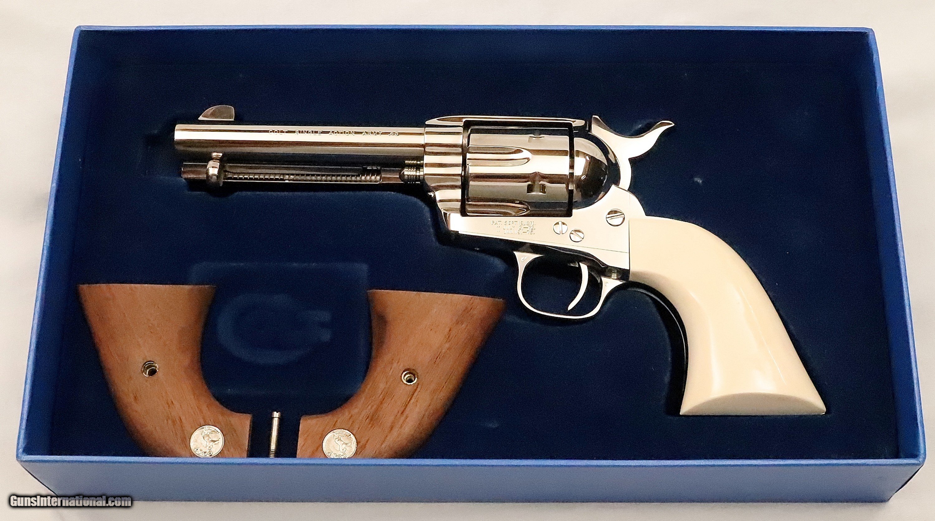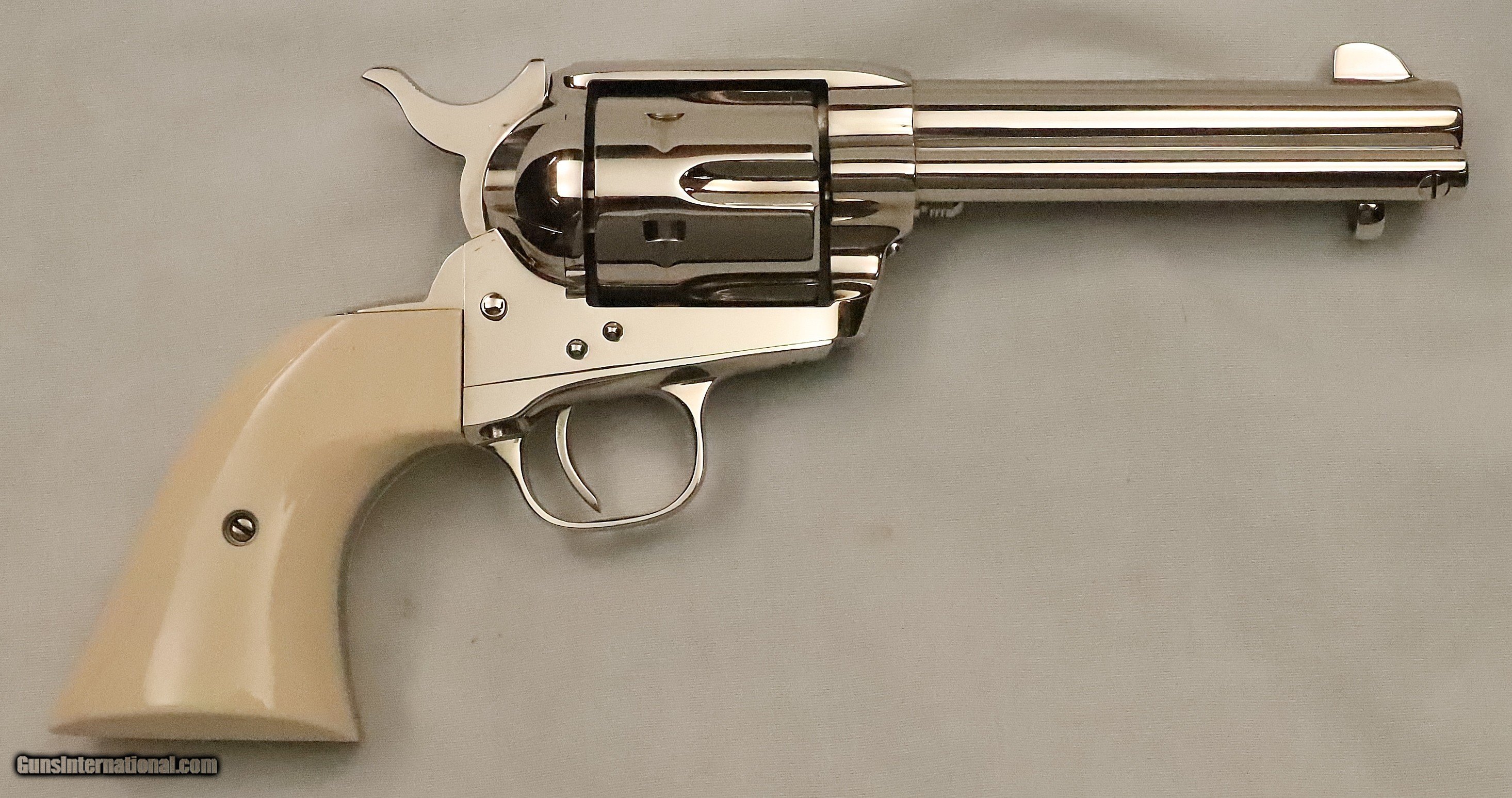 Description: This Colt SAA was Manufactured in 1994 and remains in AS NEW un-fired, un-turned condition. The Nickel plating with Ivory grips make a stunning traditional look. It is in the original box with the Manual, Hang Tag, and other paperwork. The revolver was shipped from Colt with Walnut Medallion grips. The original grips are included, and later, the Ivory grips were added. This is a beautiful Single Action Army revolver in .45 Caliber with a 4 ¾” Barrel. Serial Number S06617A. FFL Required. Beaver Creek Arms TERMS & CONDITIONS Objective: As a collector of 35 years and Licensed Firearms Dealer since 1989 I have a clear definition of a satisfactory transaction. I will be paid as we agreed to, and you will be satisfied with your purchase. My goal is to establish a client list of satisfied repeat customers who will recommend me to other collectors. It’s just that simple. Exiled Saudi princes with secret funds needing change from an over paid purchase need not apply. Notice: ALL Federal, State, & Local firearms laws will be followed. I will take NO shortcuts in the process of a legal sale or transfer, so please don’t ask. SHIPPING: Shipments are made via U.S.P.S. Priority Mail, Insured, with a return receipt. Packing, Shipping and Insurance cost for this handgun is $40.00. Checks are to be made out to “Steve Clark” Address: 380 Beaver Creek Road, Dillsburg, PA 17019 Availability: All items are in stock and available for immediate shipment. Please call or email and an Item will be held up to a week with your Name, Address, & Phone Number. Items marked Reserved are being held for awaiting payment or on layaway. If you are interested in a reserved item, please call or E-Mail to be placed on a backup list. FIREARMS: Modern firearms, post 1898, can only be shipped to a Type 01 Federal Firearms License address. Curio-Relic firearms, as defined by the BATF list, can usually be shipped to a Type 03 Collectors License address. Some states have additional restrictions. A signed valid FFL license copy either mailed or emailed will be required for shipment to only the license address. GUARANTEE: Your complete satisfaction is assured, see objective above. If you are not satisfied, please contact me within 3 days of receipt. Please don’t fire the weapon, safety, function and accuracy are NOT Guaranteed. Any weapon offered by Beaver Creek Arms is never test fired nor is there any representation the gun is functional and safe to fire. These guns are sold for collectors and only represented as used firearms that must be checked by a competent person, observe all the necessary safety precautions prior to attempting to load and fire one of these weapons RETURNS: Returns must be made within 3 days of receipt. They must be received in exactly the same condition with no parts exchanged. If it has been altered, damaged, or fired, a refund will not be made. Packing, shipping and insurance cost will not be refunded. All layaway purchases are returnable for merchandise credit only. PAYMENT: Bank check, Personal check, and Money Orders are preferred. Visa and MasterCard are accepted with a 4% processing fee. LAYAWAYS: A 20% deposit is required. Balance is due in 30 days. Deposits are non-refundable and are forfeited after 40 days. Layaway sales are returnable for merchandise credit only. SALES TAX: Pennsylvania state sales tax is 6% for in state purchases. The payment of other states sales tax, if applicable, for shipped items is the buyer’s responsibility. DISCREET: Client information will remain Confidential. Your privacy is protected. SOLD |