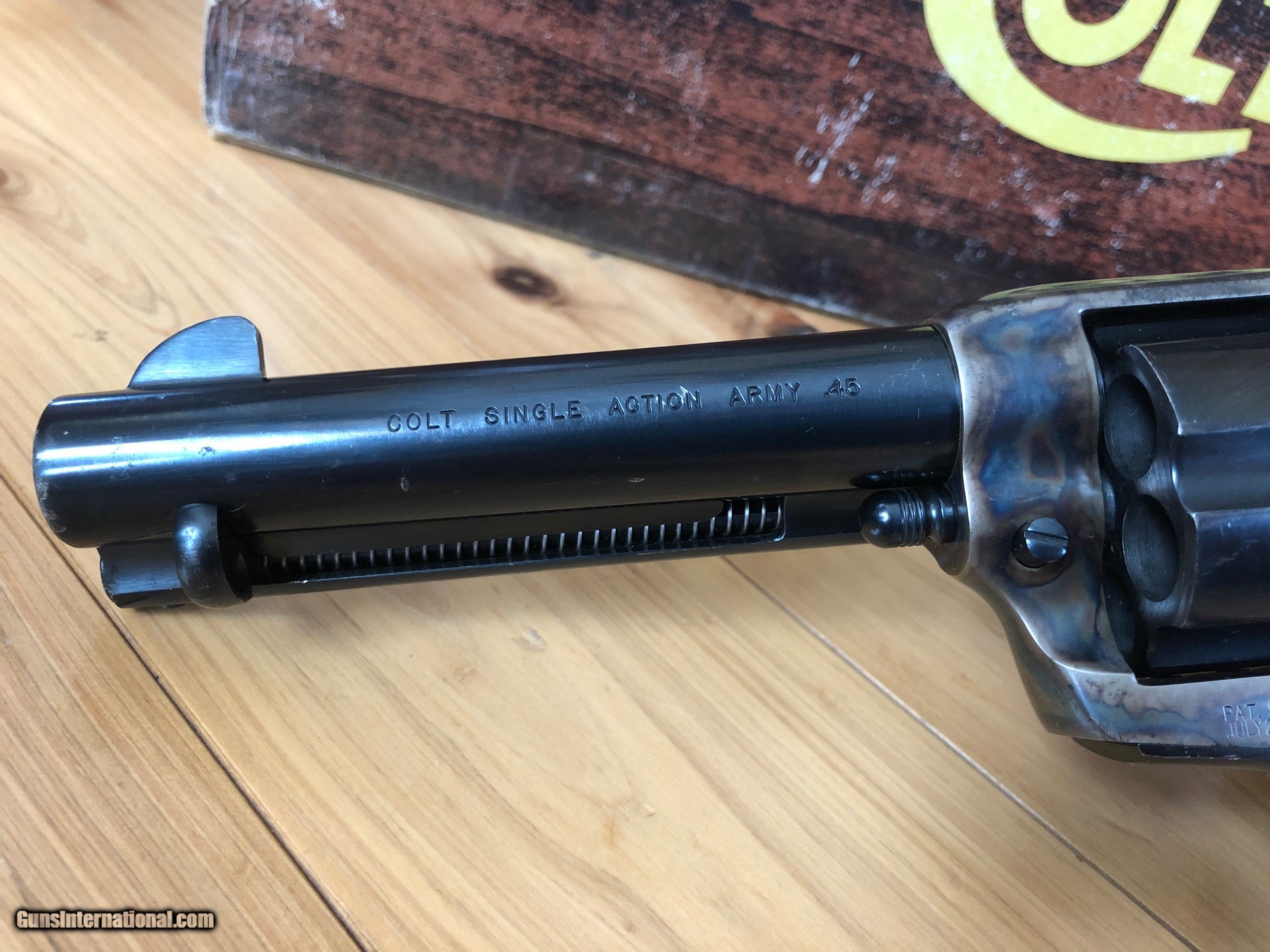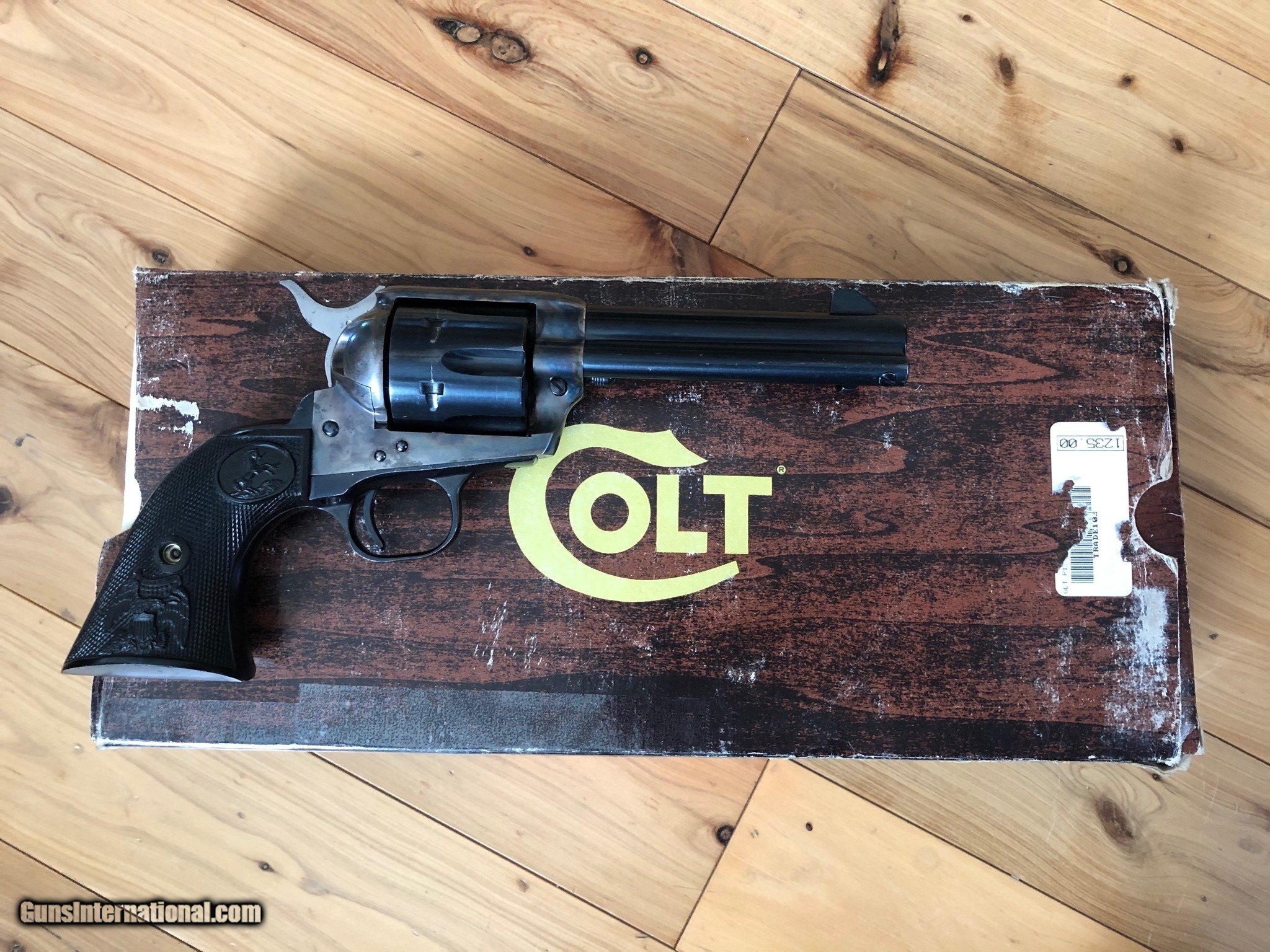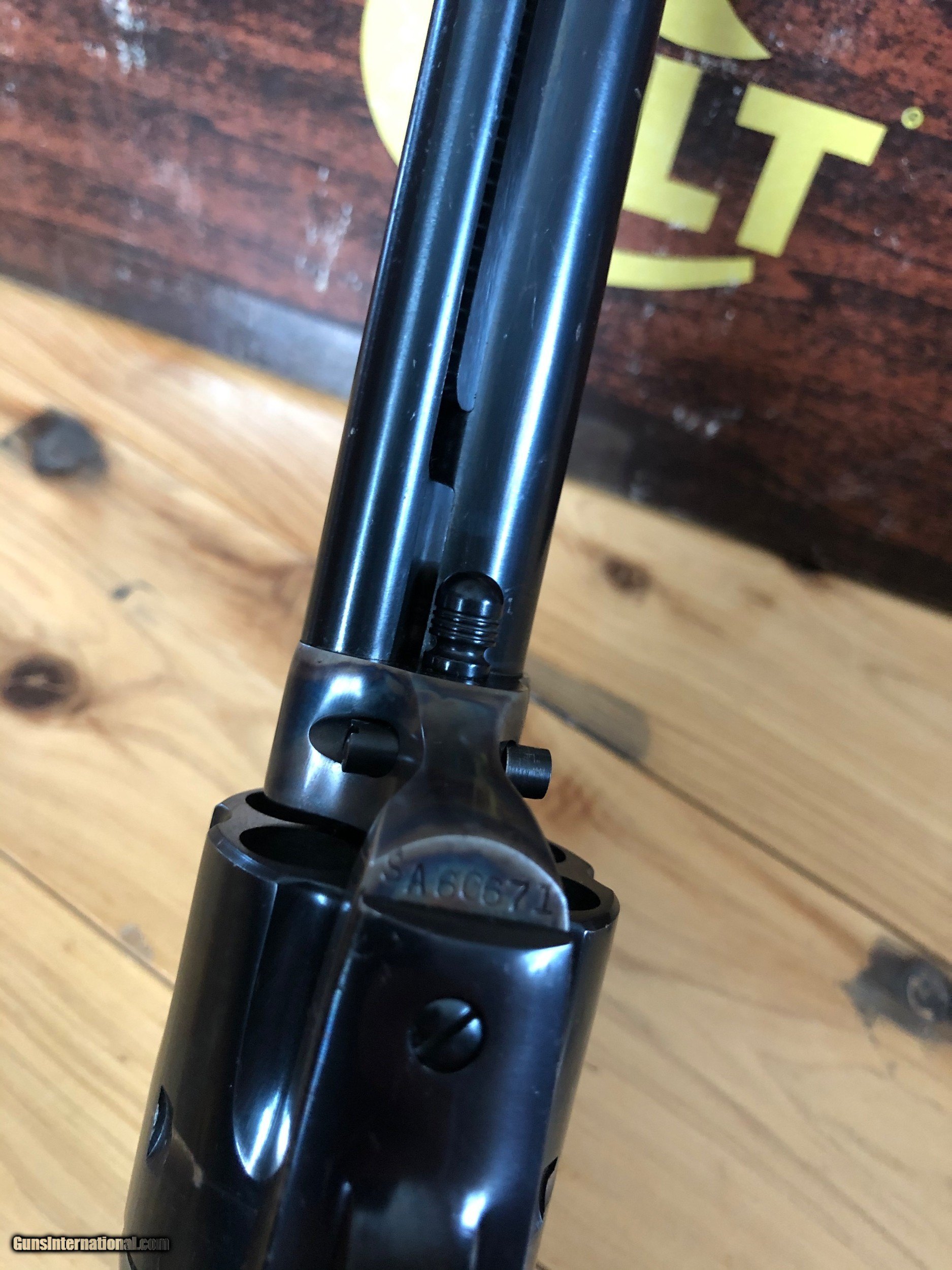 Description: SOLD PENDING FUNDS Colt SAA blue and color case hardened 45 Colt with 4 3/4" barrel. Colors on this one are nice and quality good. Manufacturered in 1982 serial number SA66671. Gun is in great condition (see pics) and functions great. Handling marks but see cylinder face to see what you think if fired or not. Box is rough but it does come with its box. Listing at a good price to start. This is a nice single action at a good price. Shipping is $45 ffl to ffl insurance extra. No sales to anywhere illegal. I accept postal mo, certified check, personal check (item held till funds clear). Don't miss this one it's nice. Thanks for looking and see my other listings. SOLD |