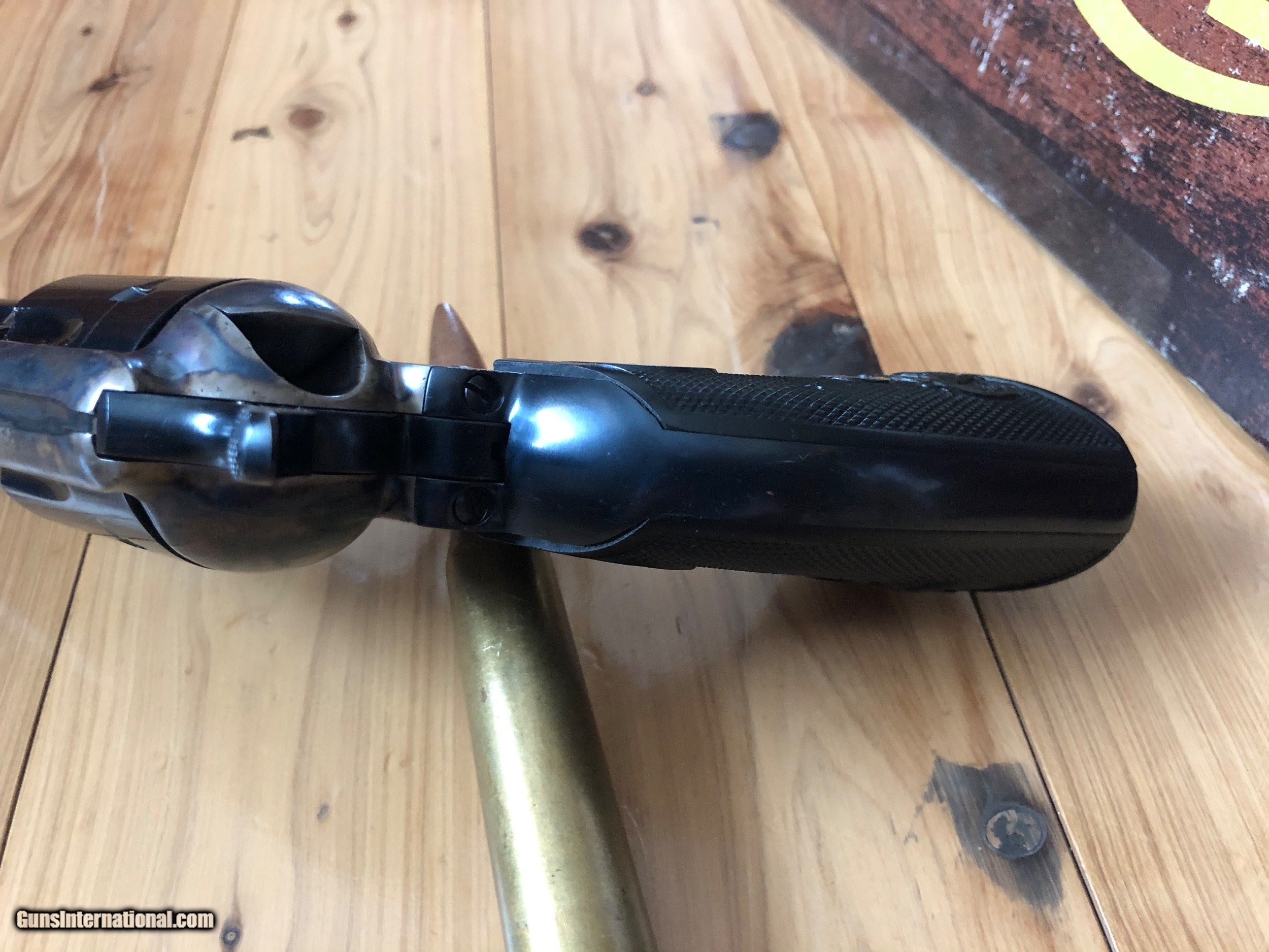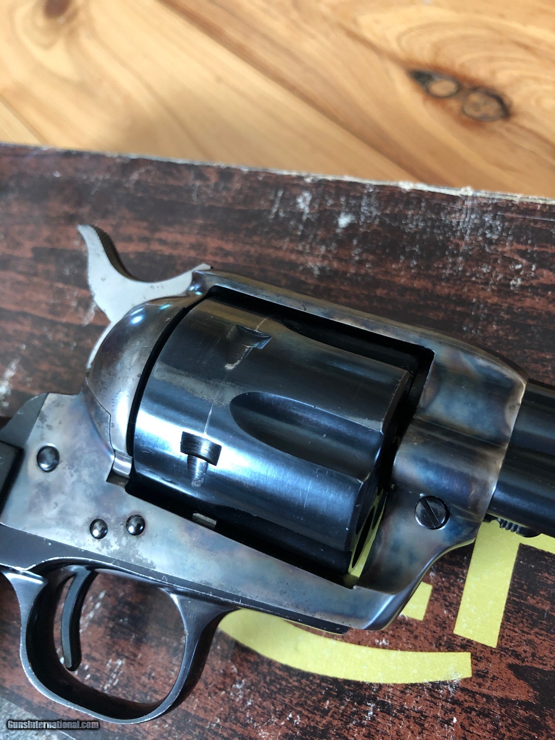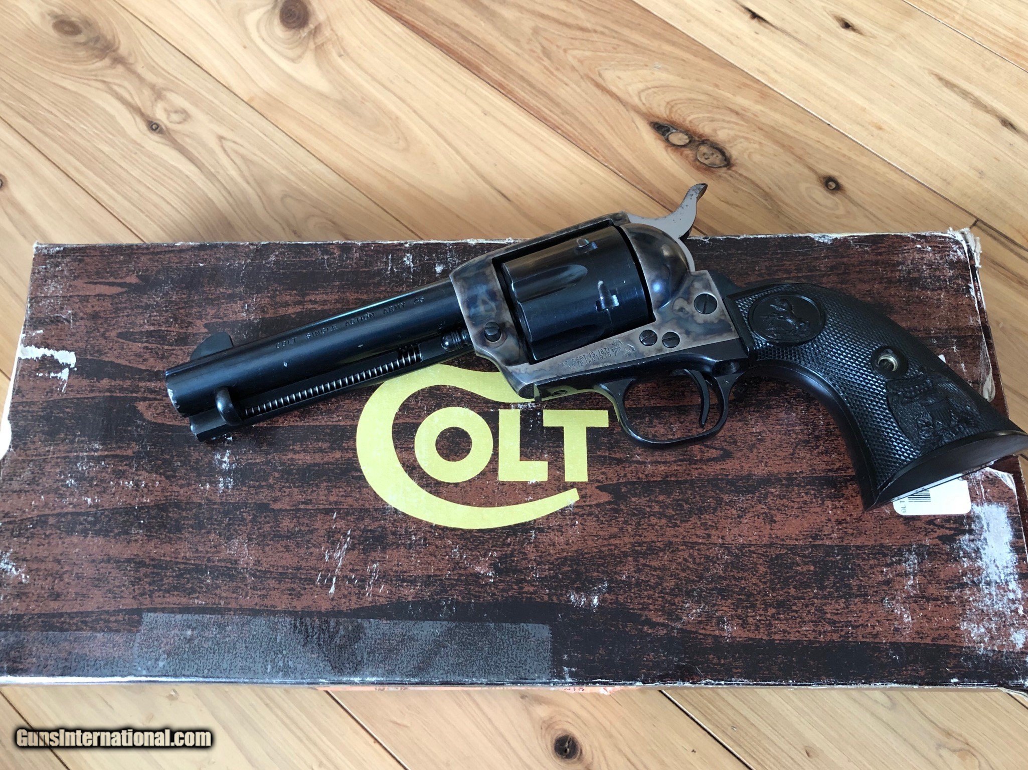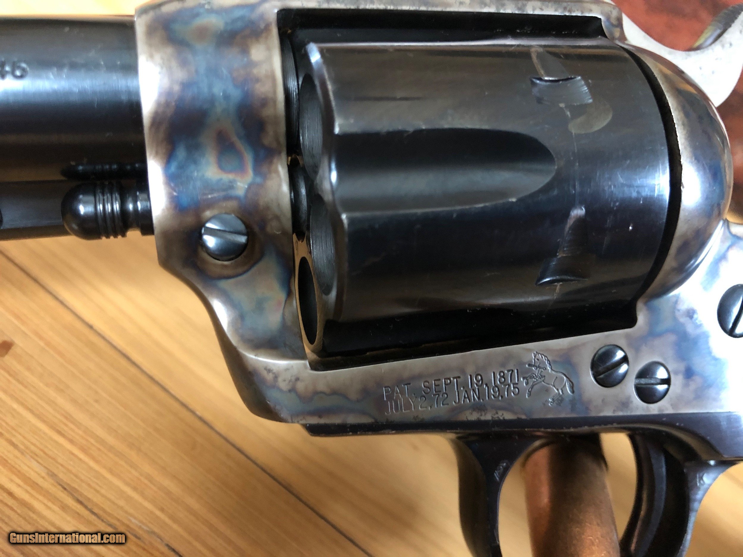 Description: SOLD PENDING FUNDS Colt SAA blue and color case hardened 45 Colt with 4 3/4" barrel. Colors on this one are nice and quality good. Manufacturered in 1982 serial number SA66671. Gun is in great condition (see pics) and functions great. Handling marks but see cylinder face to see what you think if fired or not. Box is rough but it does come with its box. Listing at a good price to start. This is a nice single action at a good price. Shipping is $45 ffl to ffl insurance extra. No sales to anywhere illegal. I accept postal mo, certified check, personal check (item held till funds clear). Don't miss this one it's nice. Thanks for looking and see my other listings. SOLD |