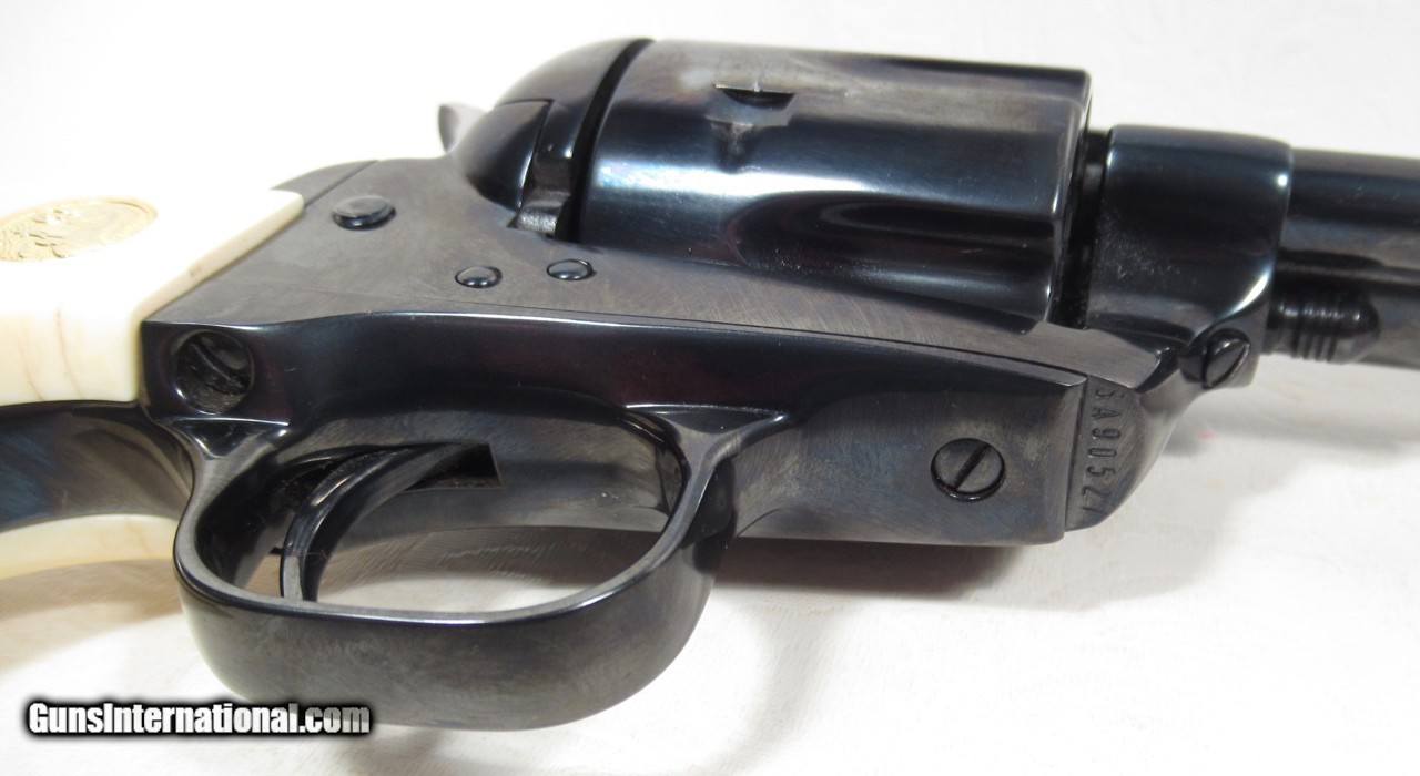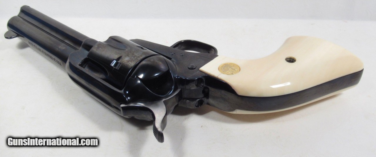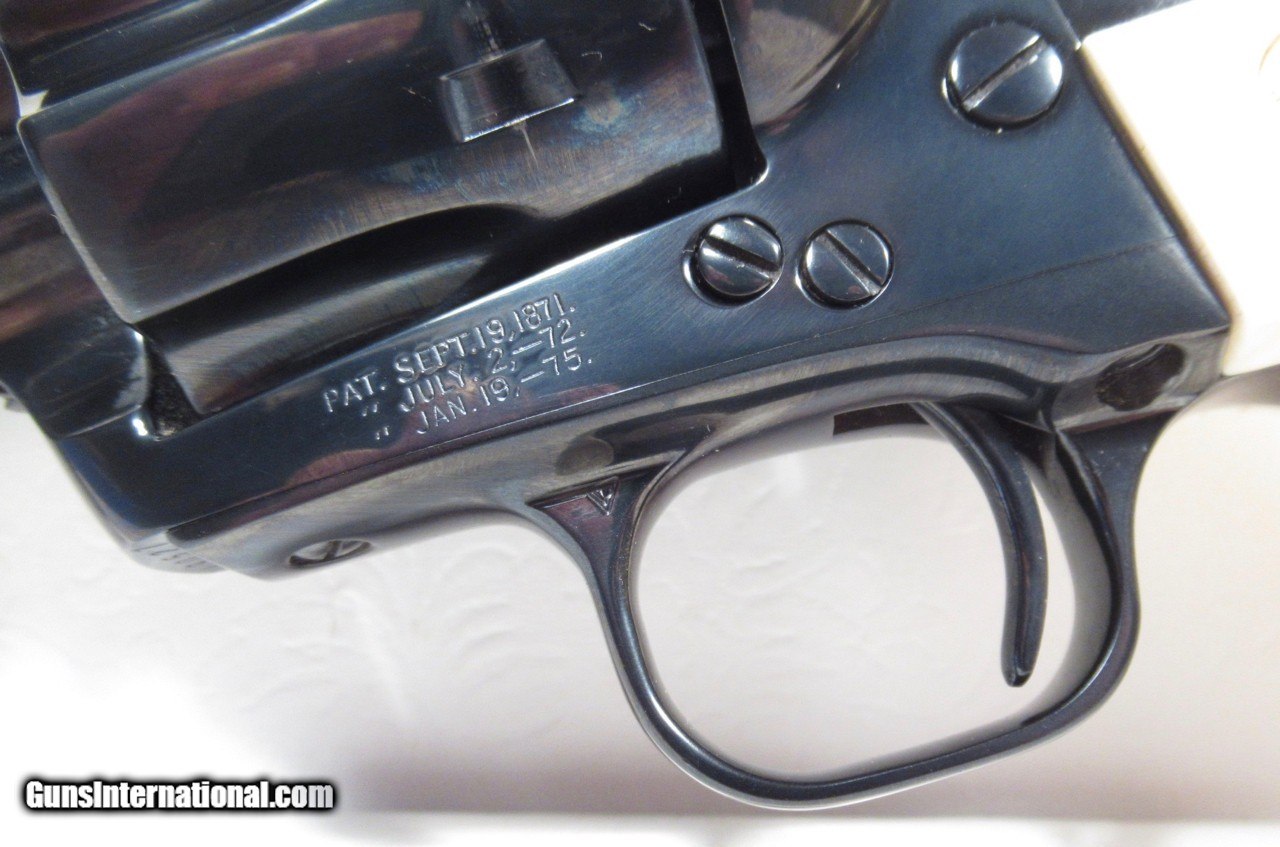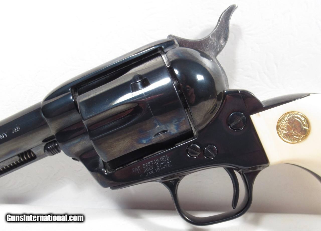 Description: Colt Single Action Army; Serial No. SA90527; 45 Caliber; 4 ¾” Barrel; All Blue Black Powder Frame with Colt Factory Ivory Grips (Pre-Ban); Made in 1988; Appears to be New in Original Box; See All Photos for Condition; No Texts. Call or Email Only; PERSONAL PROPERTY of Harold Wieser; Price: $3,475 + $45 S&H Via FedEx Express; Price includes insured shipping; return policy: three days inspection from the date the item is received; full refund of shipping both ways ONLY IF THE ITEM IS MISREPRESENTED. SOLD Manufacturer: Colt Model: 1873 Serial Number: SA90527 |