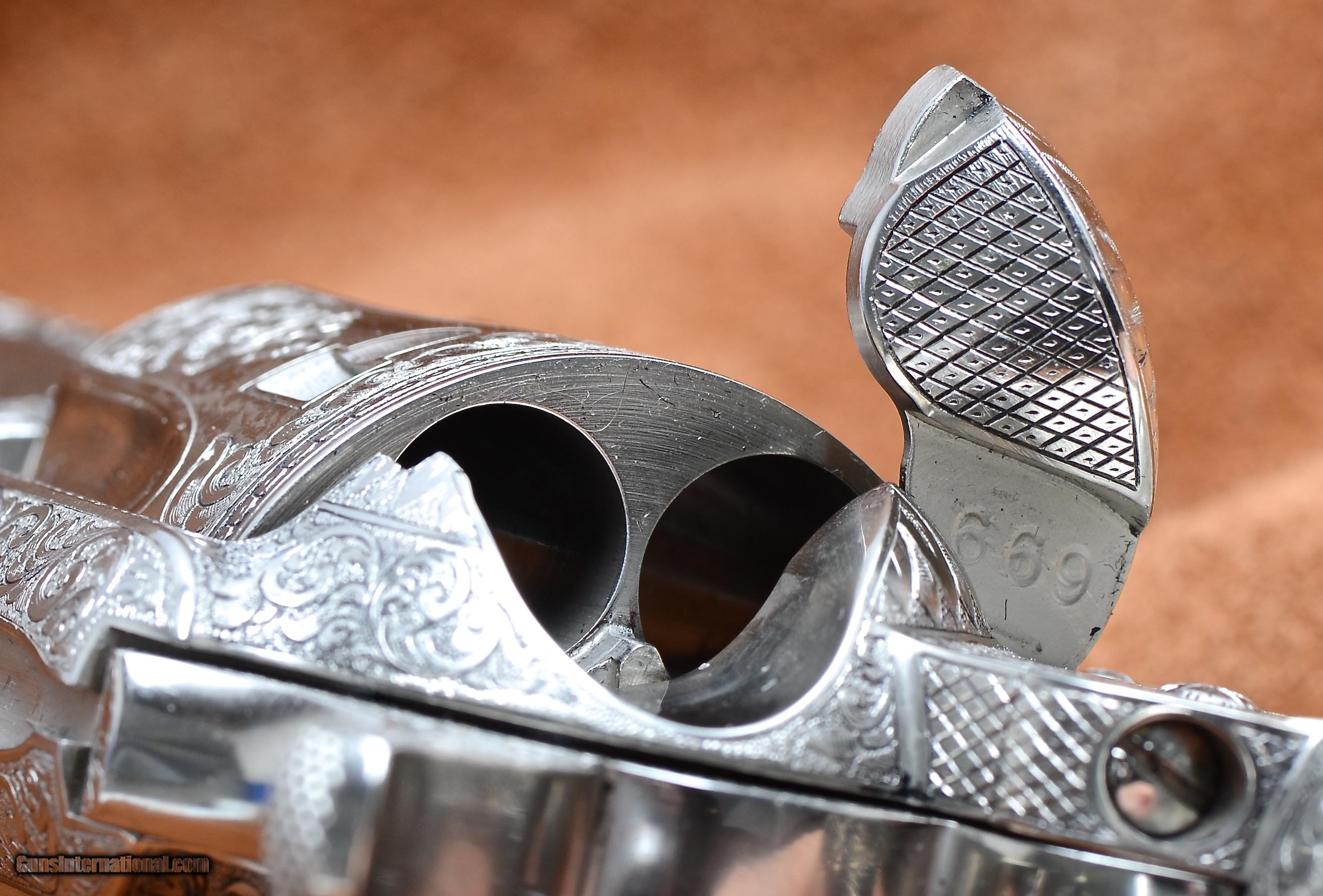 Description: Colt SAA profusely, elaborately and masterfully engraved in a classic, early 1900’s pattern, by well known master engraver E L “Larry” Peters. This revolver started out as a third generation Colt 5 ½” blue with unspecified grips. After Mr. Peters completed the engraving the revolver was perfectly fitted with flawless one piece ivory grips and all metal parts were finished in bright nickel. It remains unfired, in absolutely perfect condition and comes in the original Colt two-piece blue box with outer white box. $5,500.00 S67669A SOLD |