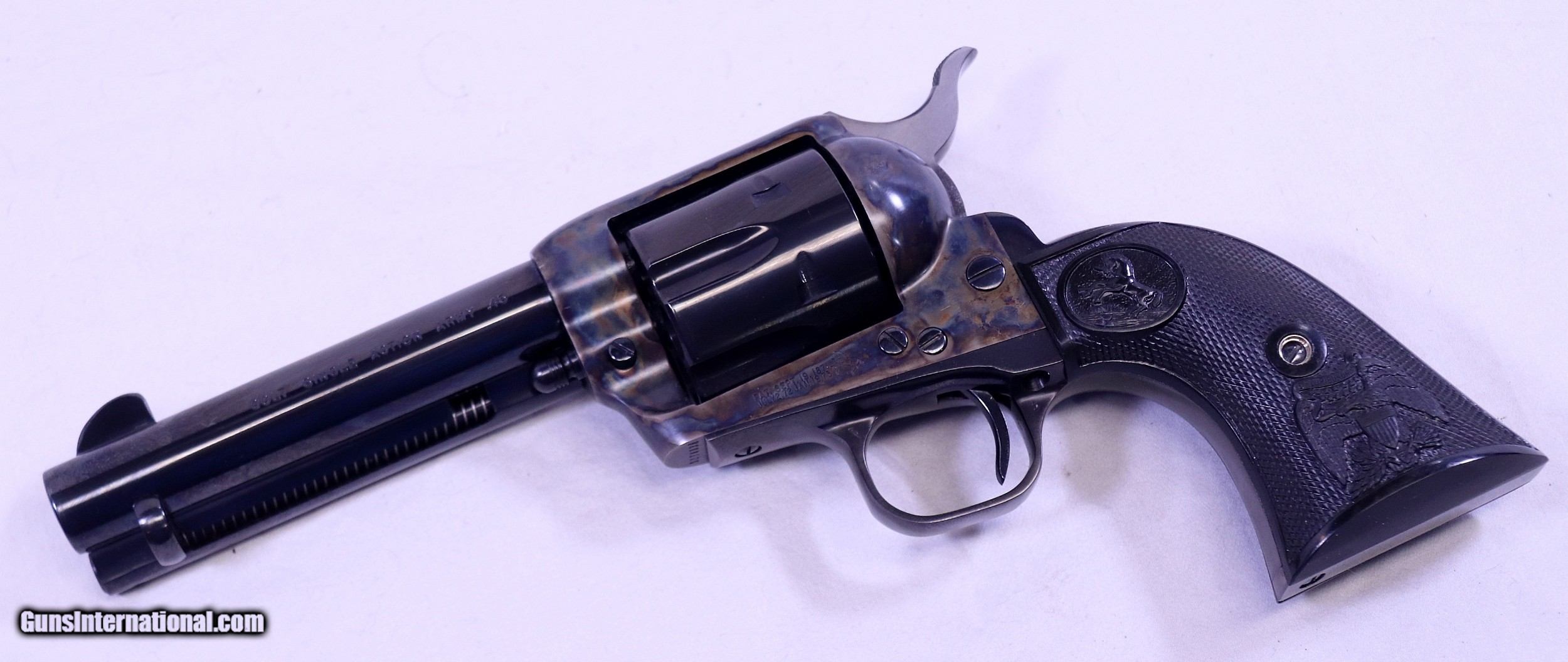 Description: This Colt appears to be Factory New in Box. The exterior metal surfaces are flawless and the action is as new. It may have been fired a few times, but no evidence remains. This is an easy Colt to describe accurately, just picture a NEW gun and you have it. Cal. .45 Colt with a 4 ¾” barrel. Serial Number: S27403A. FFL Required. Beaver Creek Arms TERMS & CONDITIONS Objective: As a collector of 35 years and Licensed Firearms Dealer since 1989 I have a clear definition of a satisfactory transaction. I will be paid as we agreed to, and you will be satisfied with your purchase. My goal is to establish a client list of satisfied repeat customers who will recommend me to other collectors. It’s just that simple. Exiled Saudi princes with secret funds needing change from an over paid purchase need not apply. Notice: ALL Federal, State, & Local firearms laws will be followed. I will take NO shortcuts in the process of a legal sale or transfer, so please don’t ask. SHIPPING: Normally shipments are made via U.S.P.S. Priority Mail, Insured, with a return receipt. Typical Packing, Shipping and Insurance cost for a handgun is $30.00, and for a Long Gun is $45.00. Checks are to be made out to “Steve Clark” Address: 380 Beaver Creek Road, Dillsburg, PA 17019 FIREARMS: Modern firearms, post 1898, can only be shipped to a Type 01 Federal Firearms License address. Curio-Relic firearms, as defined by the BATF list, can usually be shipped to a Type 03 Collectors License address. Some states have additional restrictions such as CA, CT, DC, IL, NJ and NY. A signed valid FFL license copy either mailed or emailed will be required for shipment to only the license address. Antique firearms, pre 1898 do not require a Federal License. For purchase, a copy of a Government Issued Identification (Driver’s License, Etc.), showing date of birth and current address will be required. GUARANTEE: Your complete satisfaction is assured, see objective above. If you are not satisfied, please contact me within 3 days of receipt. Please don’t fire the weapon, safety, function and accuracy are NOT Guaranteed. Any weapon offered by Beaver Creek Arms is never test fired nor is there any representation the gun is functional and safe to fire. These guns are sold for collectors and only represented as used firearms that must be checked by a competent person, observe all the necessary safety precautions prior to attempting to load and fire one of these weapons RETURNS: Returns must be made within 3 days of receipt. They must be received in exactly the same condition with no parts exchanged. If it has been altered, damaged, or fired, a refund will not be made. Packing, shipping and insurance cost will not be refunded. All layaway purchases are returnable for merchandise credit only. PAYMENT: Bank check, Personal check, and Money Orders are preferred. Visa and MasterCard are accepted with a 3% processing fee. For Visa and MasterCard orders please provide the account number, code number, expiration date, name on card, phone number and card billing address. This information can be phoned in, or E-Mailed. All orders must be paid in advance, C.O.D. orders are not accepted. Checks, both Bank and Personal must clear before the order will be shipped, usually a 2 week delay. LAYAWAYS: A 20% deposit is required. Balance is due in 60 days. Deposits are non-refundable and are forfeited after 60 days. Layaway sales are returnable for merchandise credit only. SALES TAX: Pennsylvania state sales tax is 6% for in state purchases. The payment of other states sales tax, if applicable, for shipped items is the buyer’s responsibility. DISCREET: Client information will remain Confidential. Your privacy is protected. SOLD |