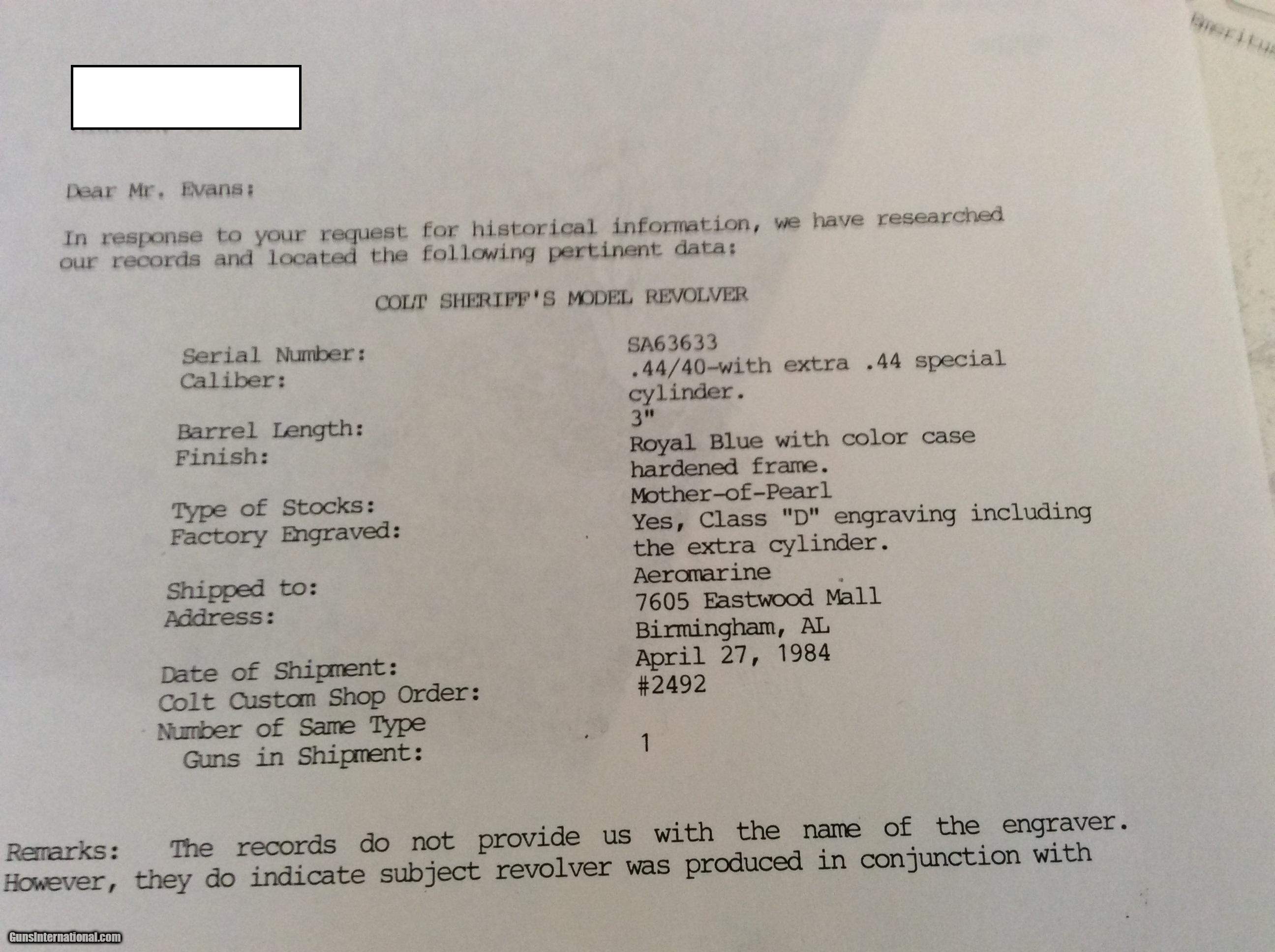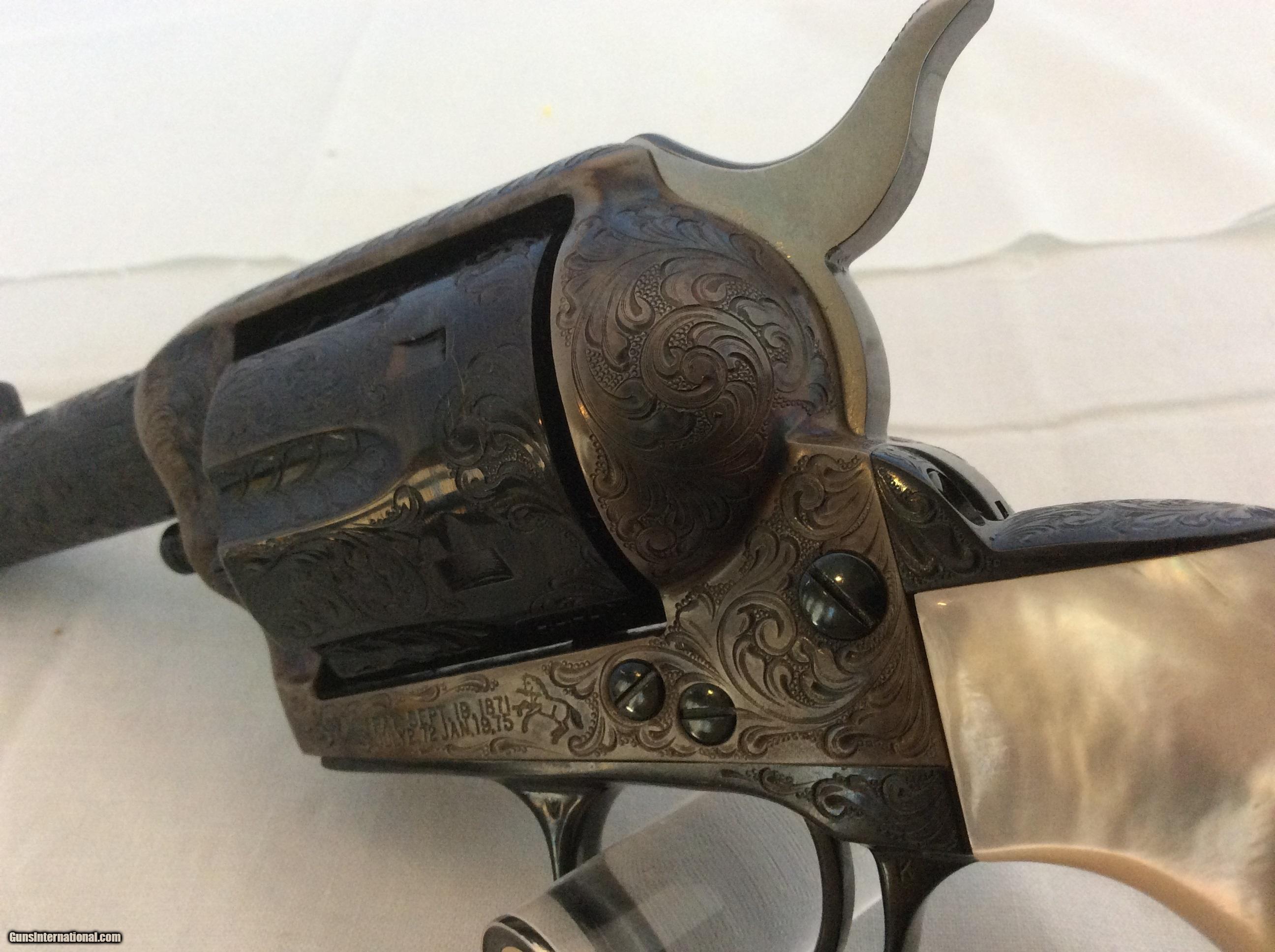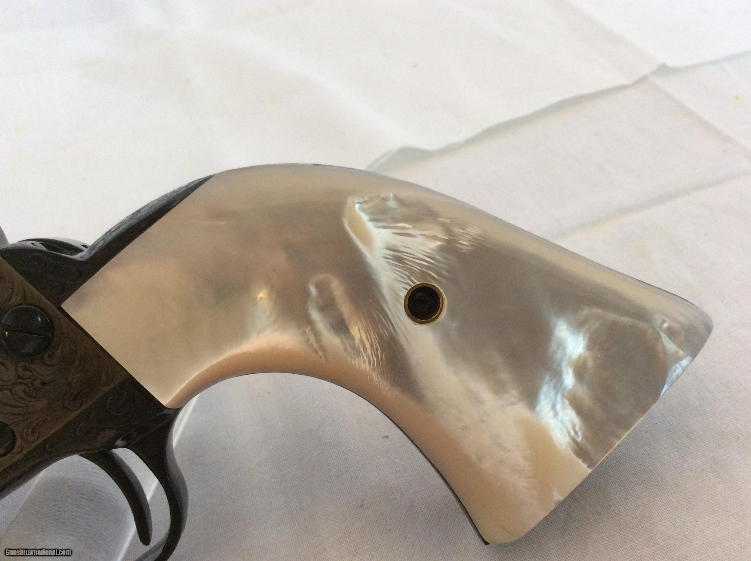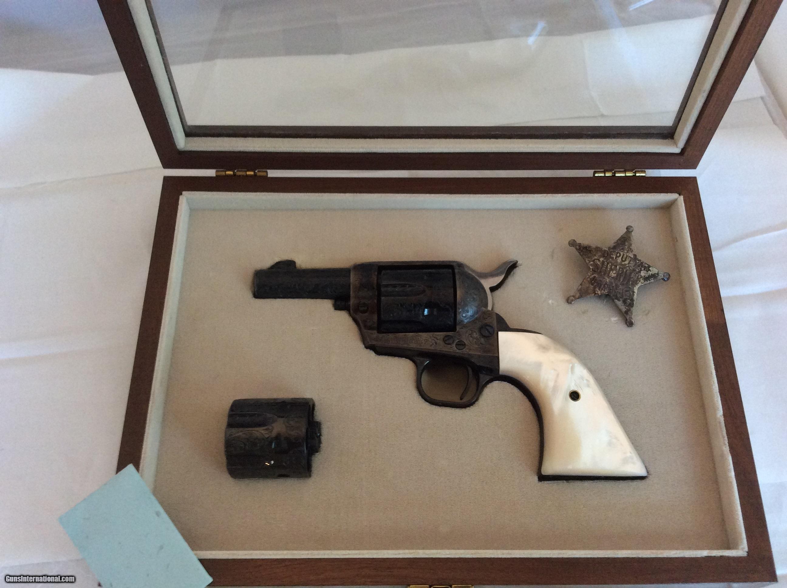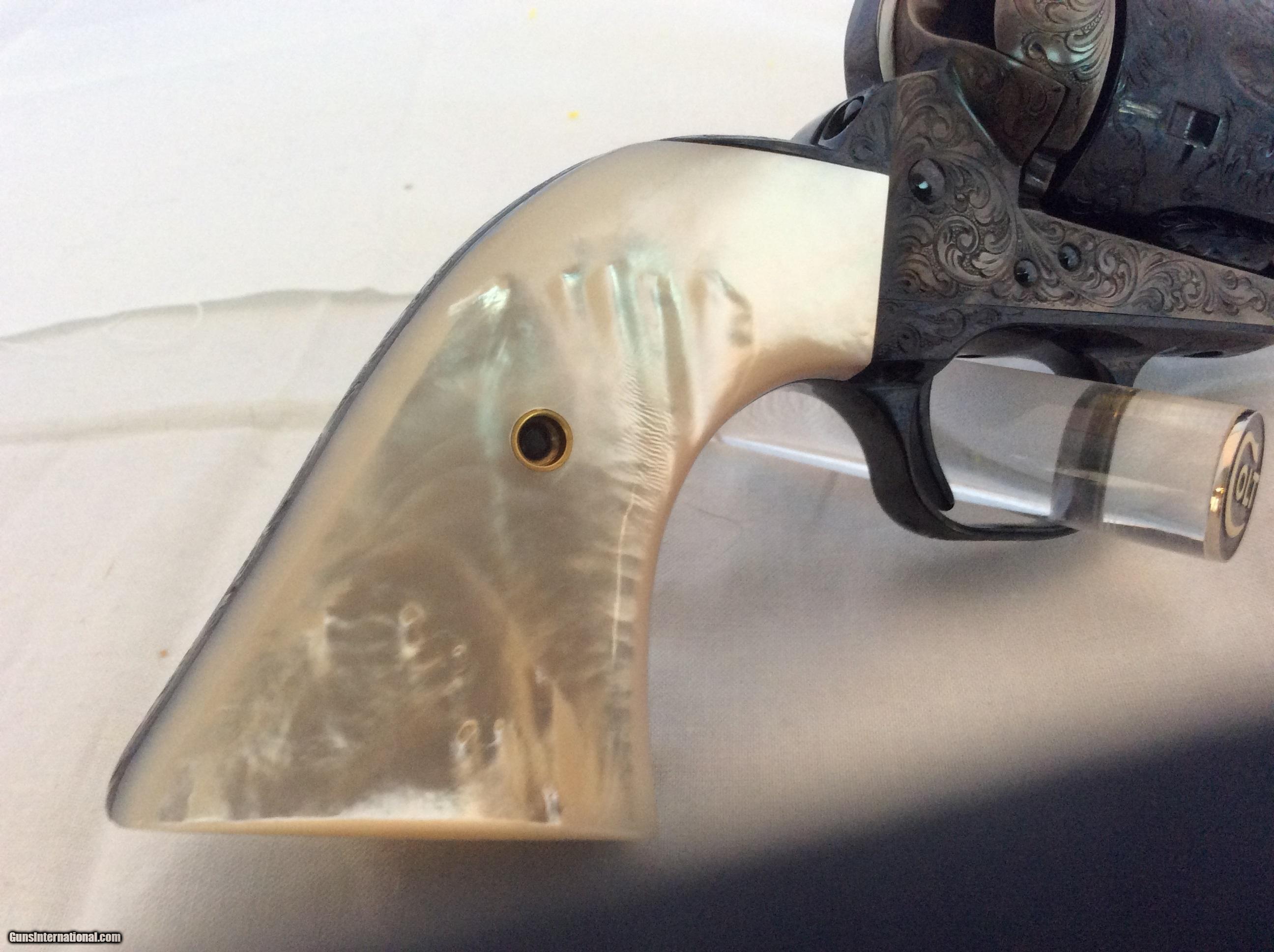Description: Colt SAA Colt Custom Shop 3” Sheriff Model Blue Level “D” factory engraved one of one created. Chambered in .44 Spl./ 44-40 with two engraved cylinders. This is a new in the box and wood and Glass case, Colt Custom Shop Blue SAA with Colt Custom Shop factory Level D engraving and real Mother of Pearly stocks. Wow! She is a beaut. Comes in a Wood and Glass Factory display case as shown. Factory new and never turned. Never seen another like it or close to it. Custom shop label states one of one. Anywhere else you would find these in the high fives or sixes. This one is accompanied by a Colt letter describing the works. FFL to FFL transfers. Any kind of funds will work. We now take credit cards and layaway. Price includes shipping. See more at packarms SOLD Manufacturer: Colt Model: SAA Sheriff Caliber Info: 44/40 .44Spl Condition: NIB Metal Condition: NIB Wood Condition: NIB Bore Condition: NIB |