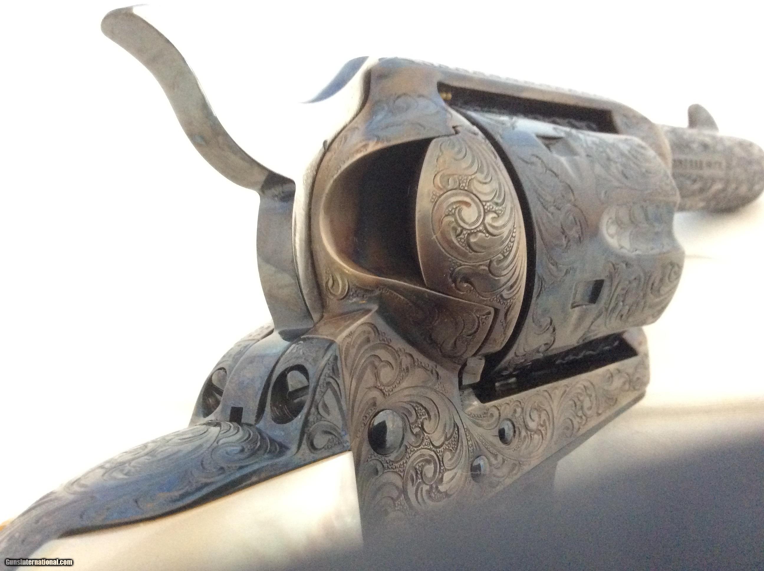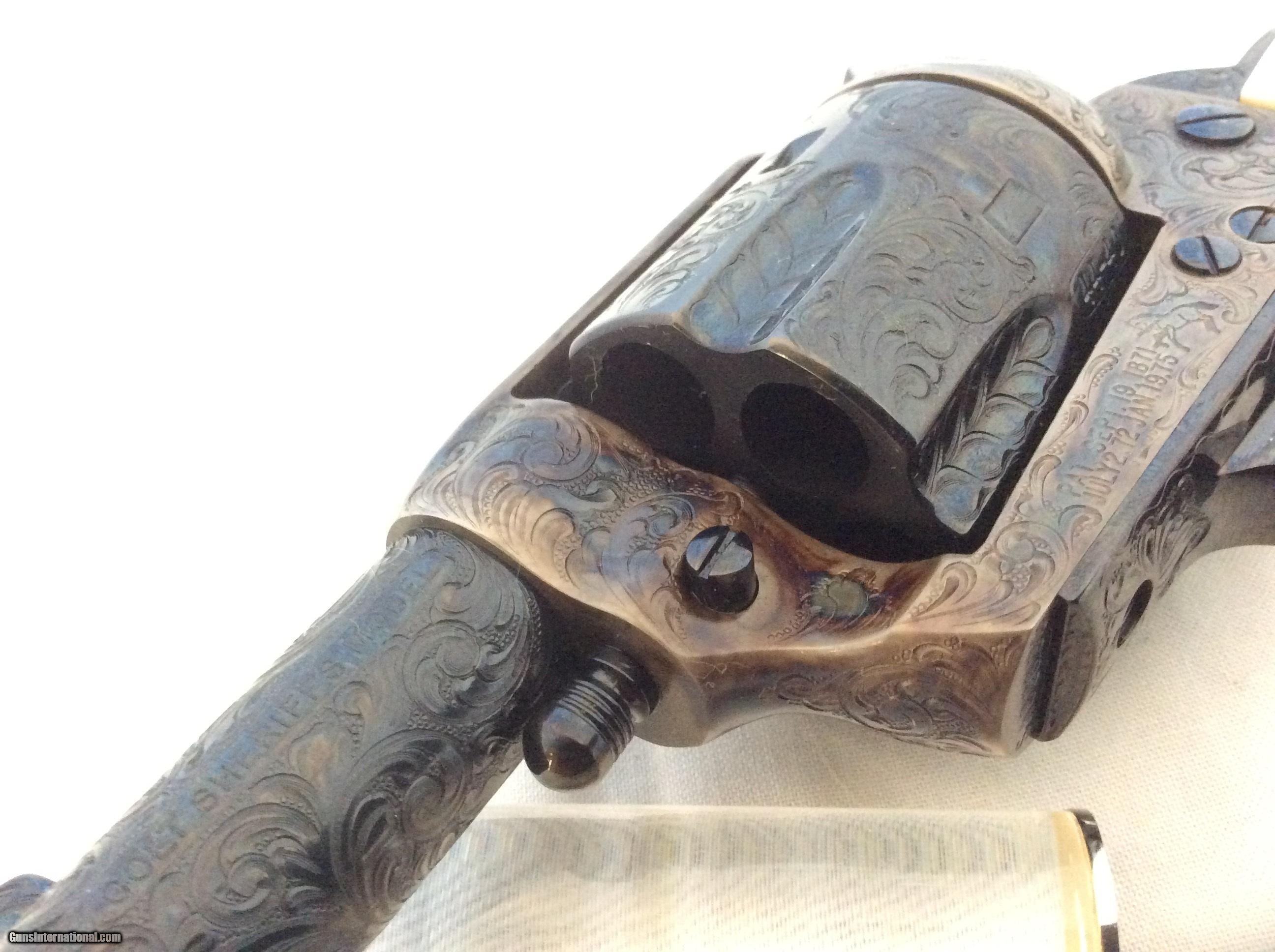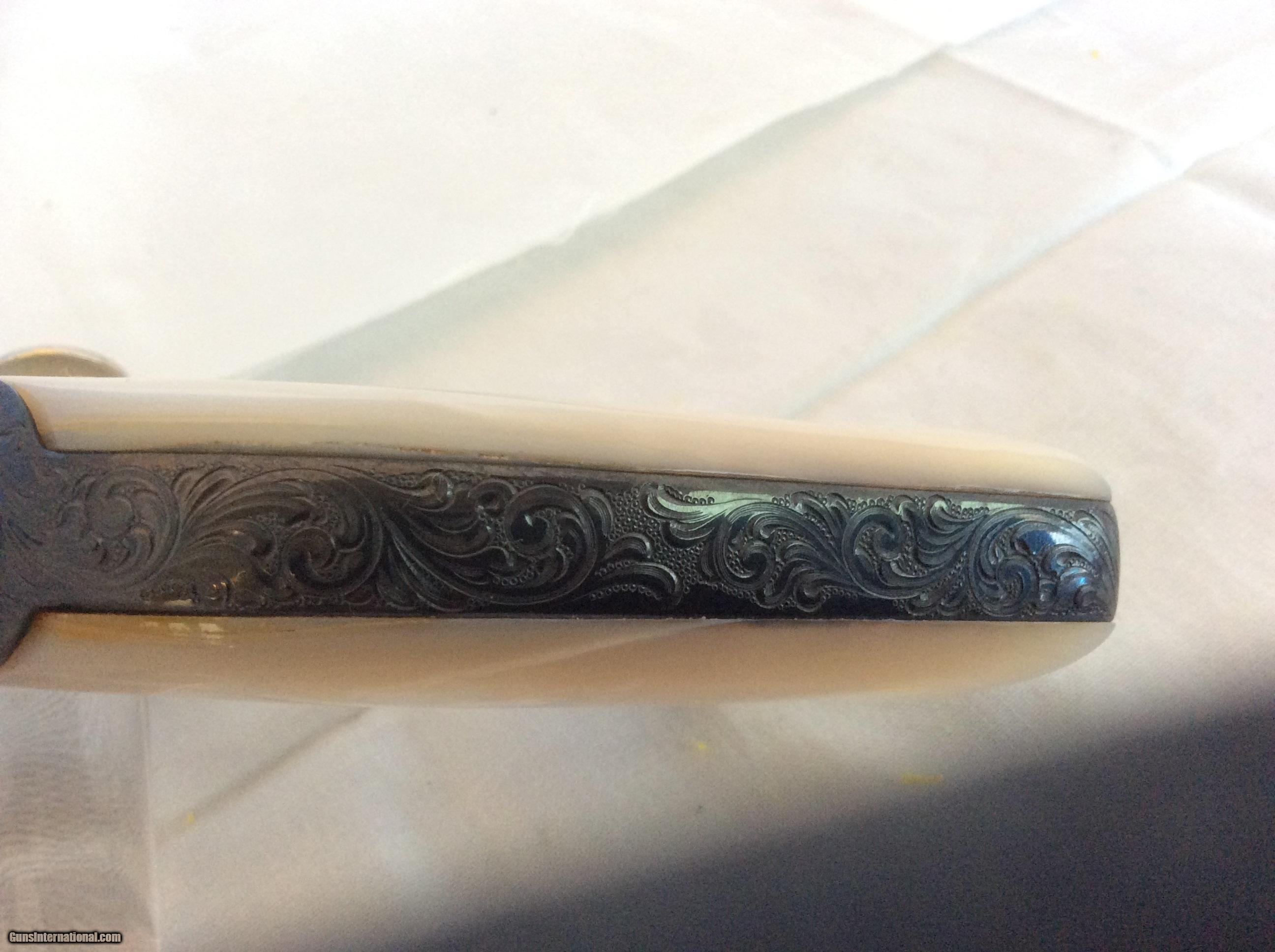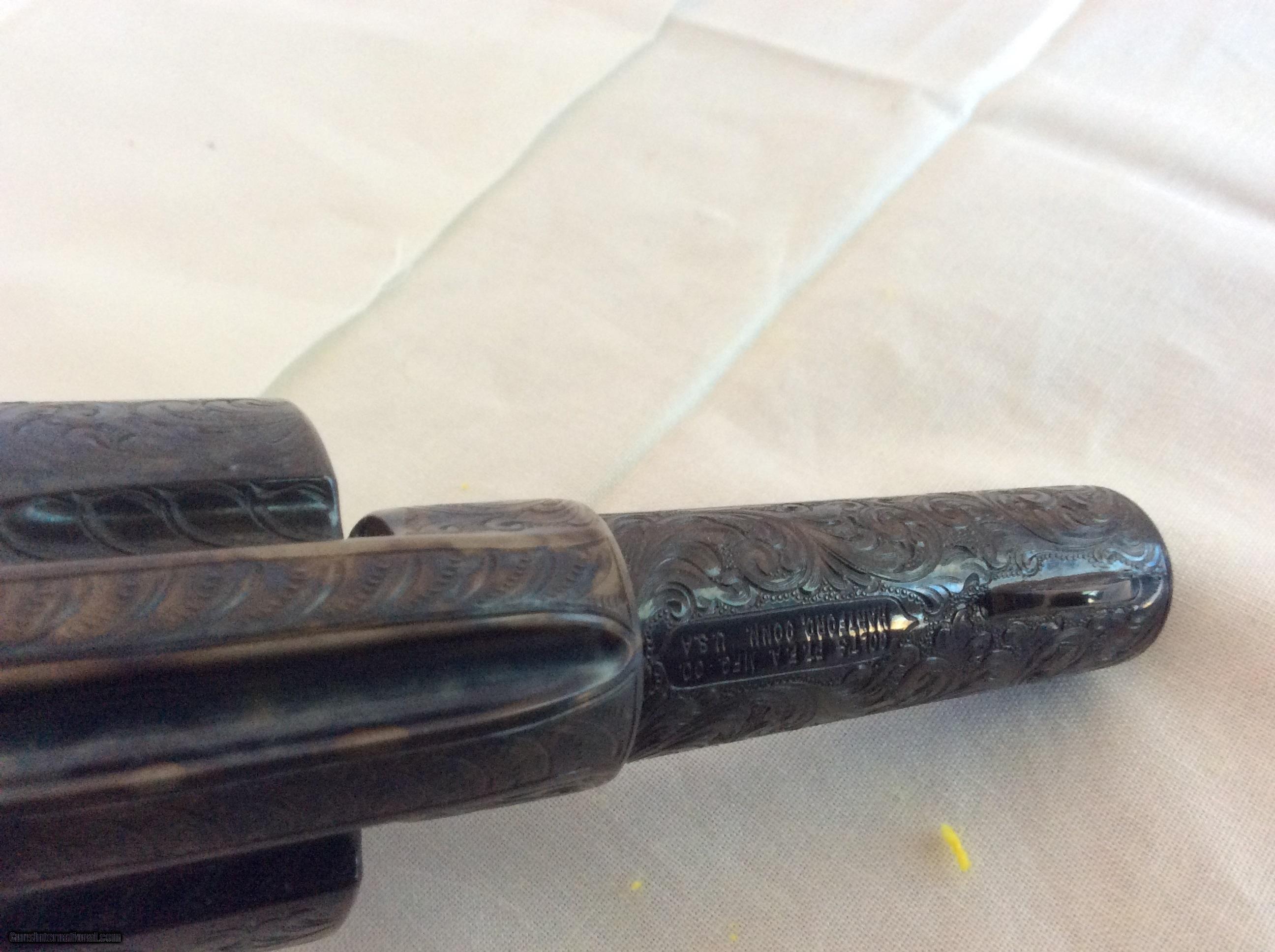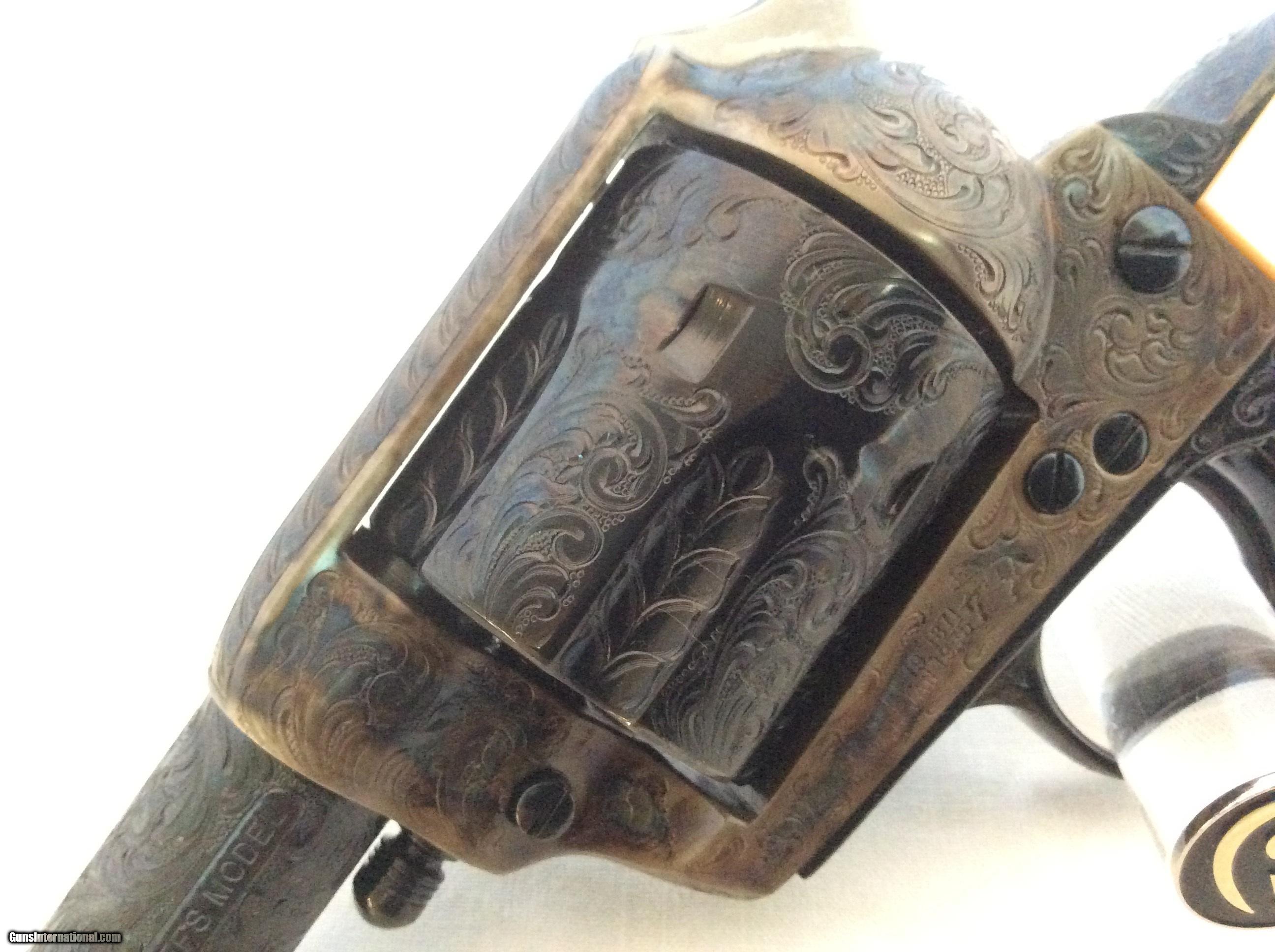 Description: Colt SAA Colt Custom Shop 3” Sheriff Model Blue Level “D” factory engraved one of one created. Chambered in .44 Spl./ 44-40 with two engraved cylinders. This is a new in the box and wood and Glass case, Colt Custom Shop Blue SAA with Colt Custom Shop factory Level D engraving and real Mother of Pearly stocks. Wow! She is a beaut. Comes in a Wood and Glass Factory display case as shown. Factory new and never turned. Never seen another like it or close to it. Custom shop label states one of one. Anywhere else you would find these in the high fives or sixes. This one is accompanied by a Colt letter describing the works. FFL to FFL transfers. Any kind of funds will work. We now take credit cards and layaway. Price includes shipping. See more at packarms SOLD Manufacturer: Colt Model: SAA Sheriff Caliber Info: 44/40 .44Spl Condition: NIB Metal Condition: NIB Wood Condition: NIB Bore Condition: NIB |