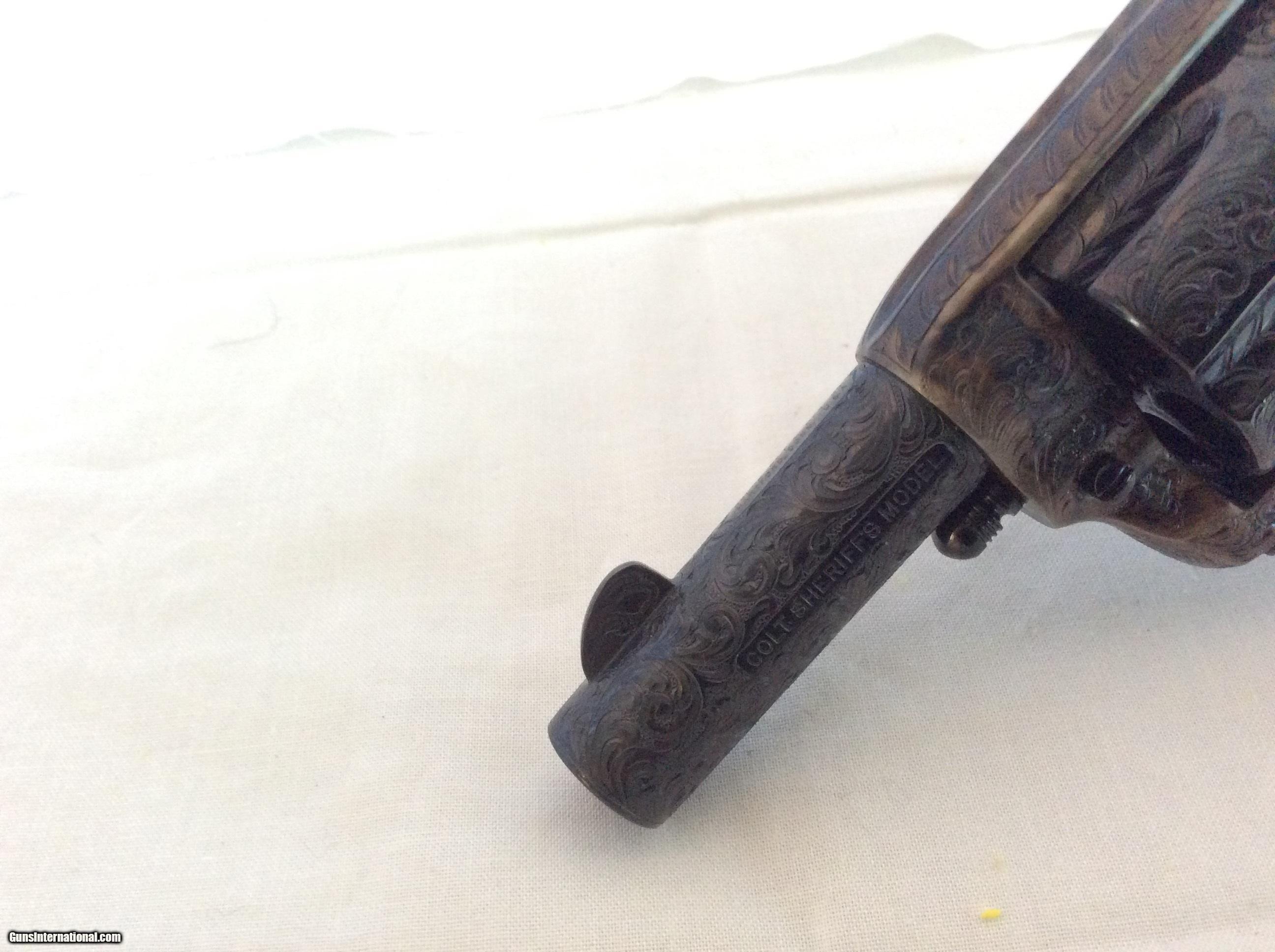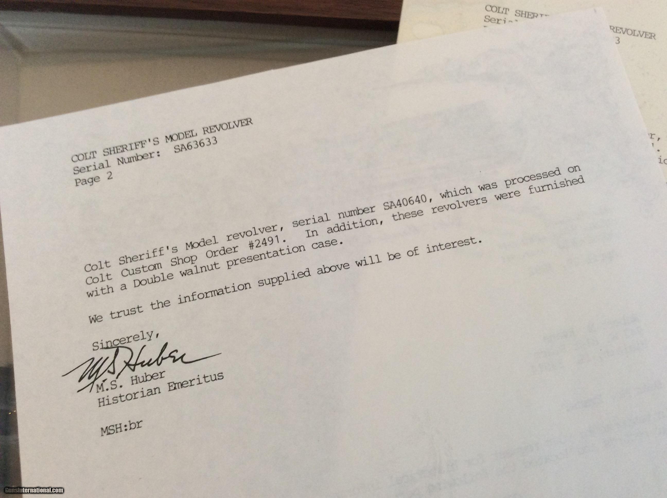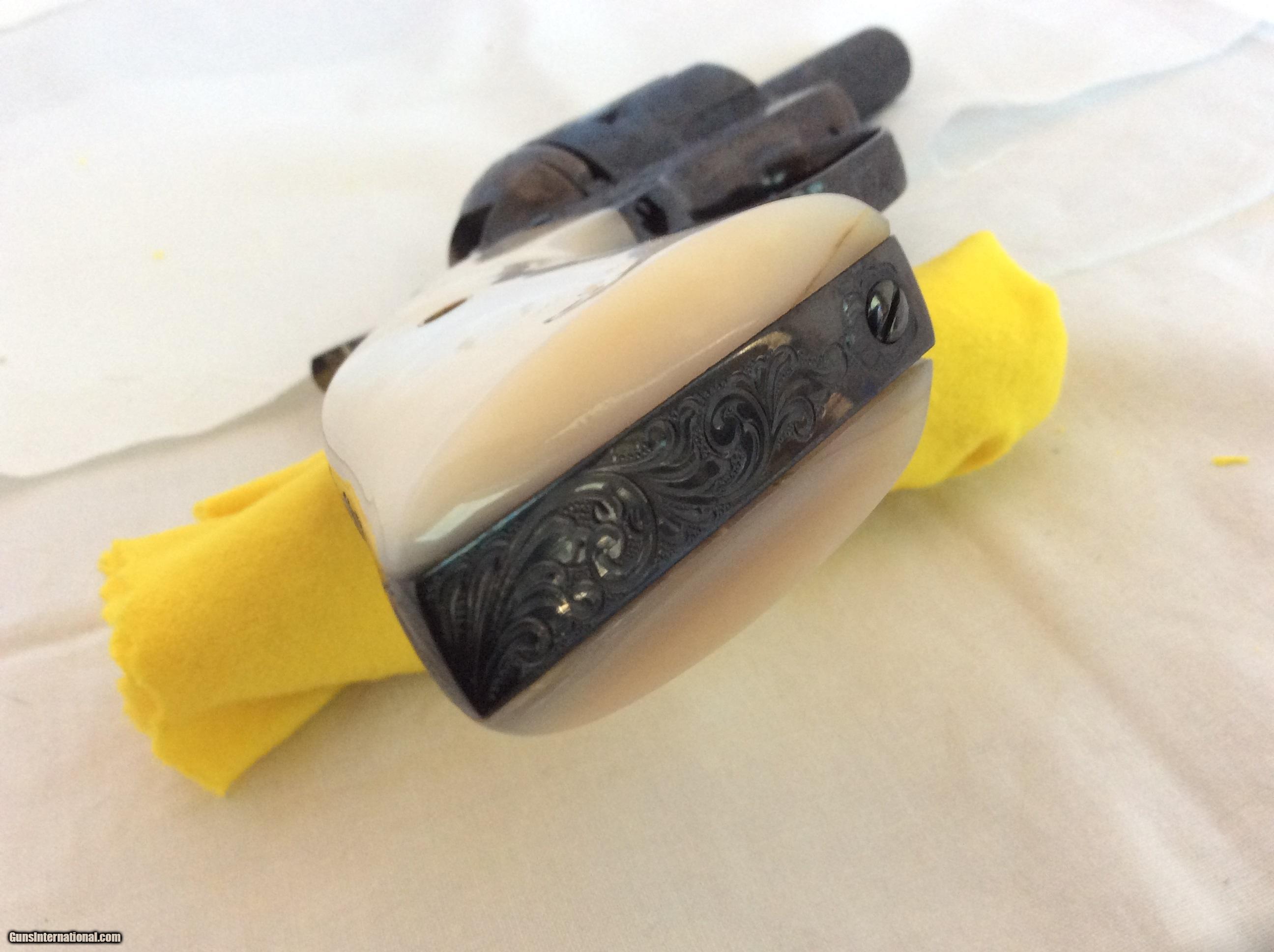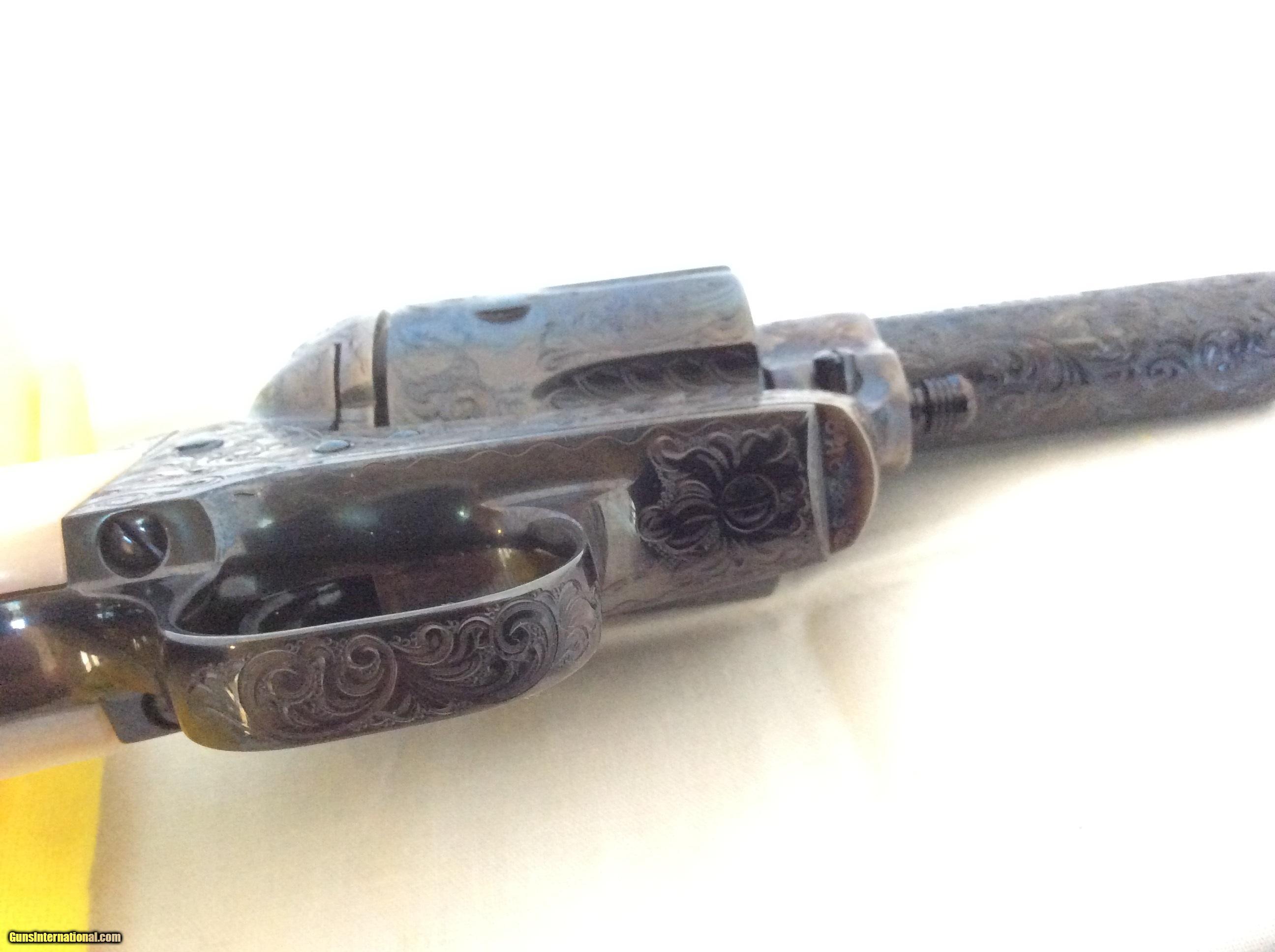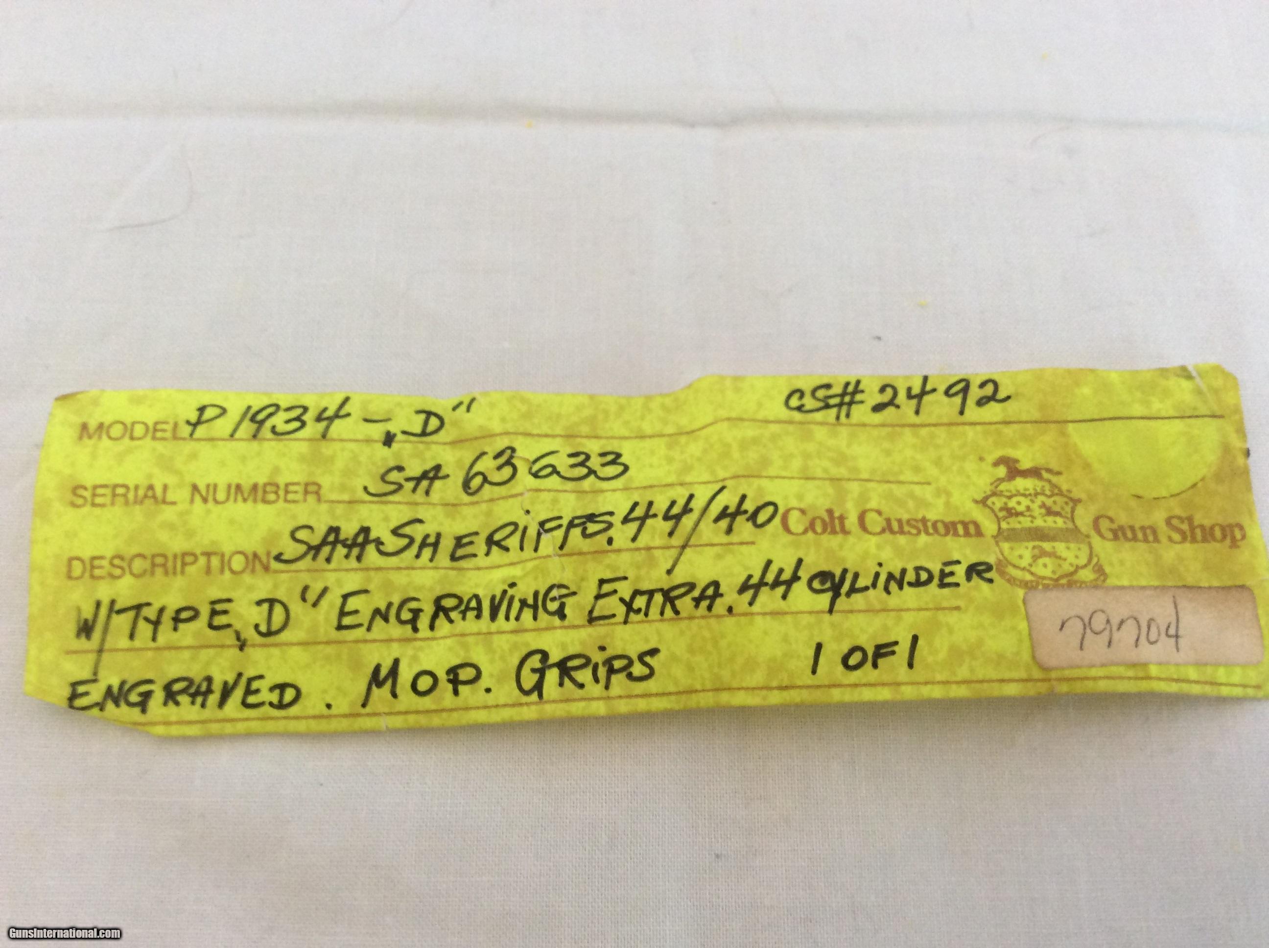Description: Colt SAA Colt Custom Shop 3” Sheriff Model Blue Level “D” factory engraved one of one created. Chambered in .44 Spl./ 44-40 with two engraved cylinders. This is a new in the box and wood and Glass case, Colt Custom Shop Blue SAA with Colt Custom Shop factory Level D engraving and real Mother of Pearly stocks. Wow! She is a beaut. Comes in a Wood and Glass Factory display case as shown. Factory new and never turned. Never seen another like it or close to it. Custom shop label states one of one. Anywhere else you would find these in the high fives or sixes. This one is accompanied by a Colt letter describing the works. FFL to FFL transfers. Any kind of funds will work. We now take credit cards and layaway. Price includes shipping. See more at packarms SOLD Manufacturer: Colt Model: SAA Sheriff Caliber Info: 44/40 .44Spl Condition: NIB Metal Condition: NIB Wood Condition: NIB Bore Condition: NIB |