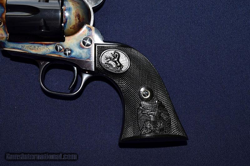 Description: Colt Single Action Army 3rd Generation In .44-40, 5 ½” bbl., serial number S32XXXA. Barrel, ejector rod housing, cylinder & grip frame retain 99% original blue, frame retains 99% original case-hardened finish. The checkered hard rubber eagle grips are excellent. Very nice 3rd generation Colt. SOLD |