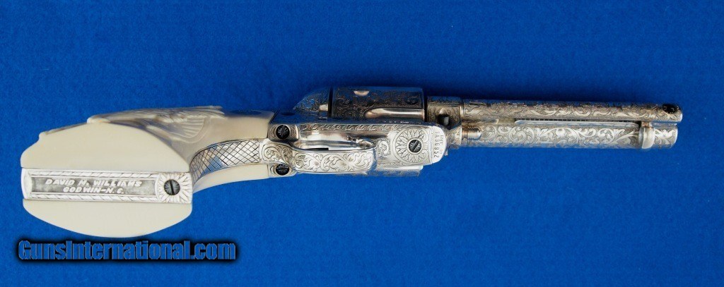 Description: Excellent Colt SAA Interpol Commemorative #89 Of 154 .45 LC WCase, 4 3/4" bbl, metal portions of the revolver are engraved - sterling silver plated, screws are engraved - blued, faux ivory grips with a high relief eagle and shield on the right grip, and a leather book style display case. The United States Historical Society authorized the production of 154 revolvers as gifted to Interpol in 1968 by David M. Williams. A former convict, Williams held more than 60 patents for firearms, to include the M-1 Carbine. The leather book style case has a gold Interpol logo on the gold bordered cover, the spine has a gold Interpol logo with "U.S. HISTORICAL SOCIETY" in gold, the interior has a fitted purple lining and a satin covered inner lid. The included Certificate of Authenticity shows the revolver is number 89 of 154. The number 154 was chosen for production as that was the number of countries involved in Interpol at the time. Add 3% for Credit Card Shipping $40.00 SOLD |