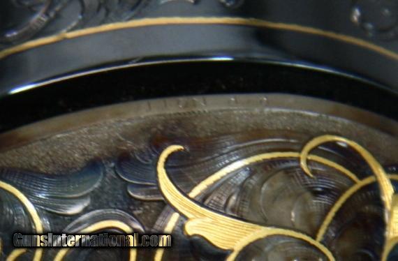Description: This consecutive serial number pair of Colt SAA Revolvers were engraved by Mr. Ron P. Nott, Master Engraver. Ron was a talented artist from Summerdale PA who passed on way too early in 2010. This set displays some of his finest work. Blue and Color Case guns with Inlayed Gold panel boarders, Gold inlayed floral scroll work, Engraved floral panels, and Ivory Grips. One of these guns won an award in 2008, and the other an award at the 2009 Firearm Engravers Guild of America Show. They were brought together and cased as you see here with an embellished oil bottle and patch box. You will note that he signed each gun on the left side bolster rim, only one is shown in the photos. They are in as new original condition and are beautiful investment grade firearms, they may have surpassed the usual definition, and the “firearm” has become a canvas for the Engravers Art. .357 Mag. Cal. with a 5 ½” Barrel. Serial Numbers: S46557A & S46558A, FFL Required. Beaver Creek Arms TERMS & CONDITIONS Objective: As a collector of 35 years and Licensed Firearms Dealer since 1989 I have a clear definition of a satisfactory transaction. I will be paid as we agreed to, and you will be satisfied with your purchase. My goal is to establish a client list of satisfied repeat customers who will recommend me to other collectors. It’s just that simple. Exiled Saudi princes with secret funds needing change from an over paid purchase need not apply. Notice: ALL Federal, State, & Local firearms laws will be followed. I will take NO shortcuts in the process of a legal sale or transfer, so please don’t ask. SHIPPING: Normally shipments are made via U.S.P.S. Priority Mail, Insured, with a return receipt. Typical Packing, Shipping and Insurance cost for a handgun is $30.00, and for a Long Gun is $45.00. Availability: All items are in stock and available for immediate shipment. Please call or email and an Item will be held up to a week with your Name, Address, & Phone Number. Items marked Reserved are being held for awaiting payment or on layaway. If you are interested in a reserved item, please call or E-Mail to be placed on a backup list. FIREARMS: Modern firearms, post 1898, can only be shipped to a Type 01 Federal Firearms License address. Curio-Relic firearms, as defined by the BATF list, can usually be shipped to a Type 03 Collectors License address. Some states have additional restrictions such as CA, CT, DC, IL, MD, NJ and NY. A signed valid FFL license copy either mailed or emailed will be required for shipment to only the license address. Antique firearms, pre 1898 do not require a Federal License. For purchase, a copy of a Government Issued Identification (Driver’s License, Etc.), showing date of birth and current address will be required. GUARANTEE: Your complete satisfaction is assured, see objective above. If you are not satisfied, please contact me within 3 days of receipt. Please don’t fire the weapon, safety, function and accuracy are NOT Guaranteed. Any weapon offered by Beaver Creek Arms is never test fired nor is there any representation the gun is functional and safe to fire. These guns are sold for collectors and only represented as used firearms that must be checked by a competent person, observe all the necessary safety precautions prior to attempting to load and fire one of these weapons RETURNS: Returns must be made within 3 days of receipt. They must be received in exactly the same condition with no parts exchanged. If it has been altered, damaged, or fired, a refund will not be made. Packing, shipping and insurance cost will not be refunded. All layaway purchases are returnable for merchandise credit only. Sales: All sales are made with the buyer’s full acceptance of the stated terms of sale. All sales are made in strict compliance with all Federal Firearms Laws. No items contained in thissite are offered for sale where prohibited by any Federal, State or Local laws. By ordering, the buyer certifies that their purchase will be in full compliance with all Federal, State and Local laws. All transactions shall be deemed to occur in Pennsylvania regardless whether by telephone, mail, internet or the physical location of the buyer. All transactions will be subject only to Federal and Pennsylvania State law. Any disputes will be resolved in a Pennsylvania Court. PAYMENT: Bank check, Personal check, and Money Orders are preferred. Visa and MasterCard are accepted with a 3% processing fee. For Visa and MasterCard orders please provide the account number, code number, expiration date, name on card, phone number and card billing address. This information can be phoned in, or E-Mailed. All orders must be paid in advance, C.O.D. orders are not accepted. Checks, both Bank and Personal must clear before the order will be shipped, usually a 2 week delay. LAYAWAYS: A 20% deposit is required. Balance is due in 60 days. Deposits are non-refundable and are forfeited after 60 days. Layaway sales are returnable for merchandise credit only. SALES TAX: Pennsylvania state sales tax is 6% for in state purchases. The payment of other states sales tax, if applicable, for shipped items is the buyer’s responsibility. DISCREET: Client information will remain Confidential. Your privacy is protected. SOLD |