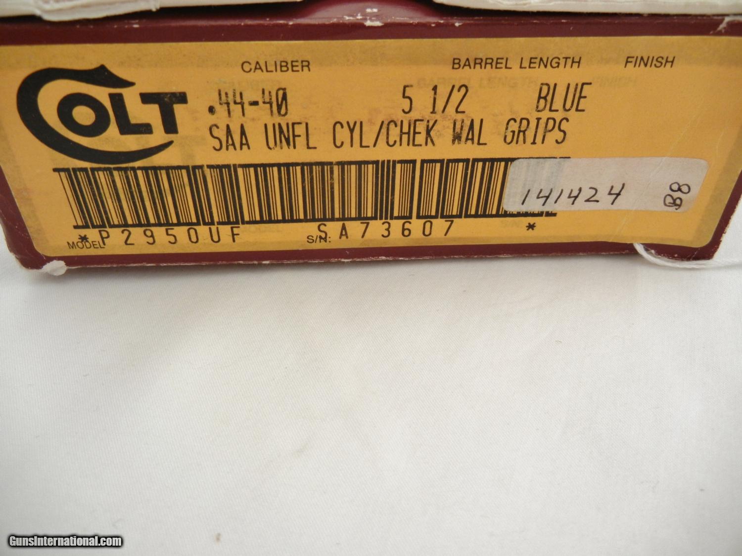 Description: This is a Colt SAA 44-40 with a 5 1/2 inch barrel. This gun is 100% new in the box. Serial # is SA73xxx. Buyer pays 45.00 shipping. Thank you. 33-15-11 "Rare Configuartion SOLD |