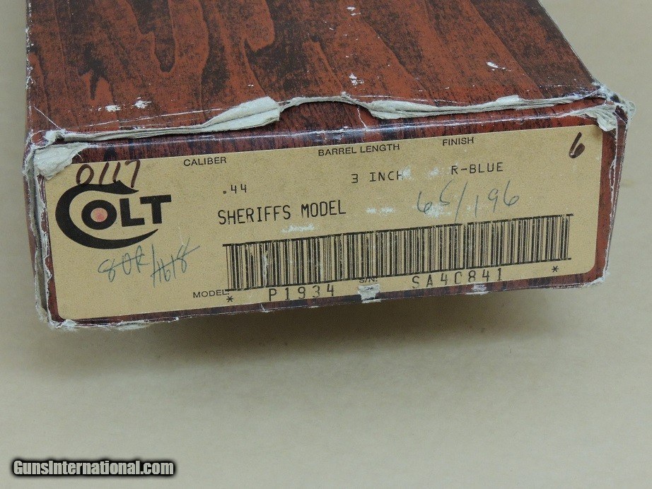 Description: Colt Sheriff 's Model Single Action Army 44-40 & 44 Special , 3" Barrel with mint bore, Blue, Case Color, Wood Stocks, Third Generation, Box, Papers, Display Case, Shipping Box, 99% condition Production Circa 1980' $2750**Please No Random Text Messages**All text must include your Name, Our inventory number and Item description ** ******* (No Sales to California) (PLEASE REFERENCE OUR INVENTORY NUMBER) (PAYMENT OPTIONS) (Postal Money Order) (Cashiers Checks) (Personal Checks (Item held until Check Cleared) ***(Layaway 120 days-(No Interest)-(Pay any way, any time you like over the term) -(Deposit required)*** (Credit Cards Visa or Master Card 3.5% fee added to total sale) (GA residents 7% sales Tax Applies) (BEST PHONE/TEXT 229-424-8450) (SHIPPING $35.00) SOLD |