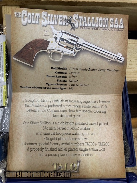 Description: Colt Silver Stallion SAA P1850-TLE 45 LC 1 of 200 TALO Single Action Army - Factory New SOLD |