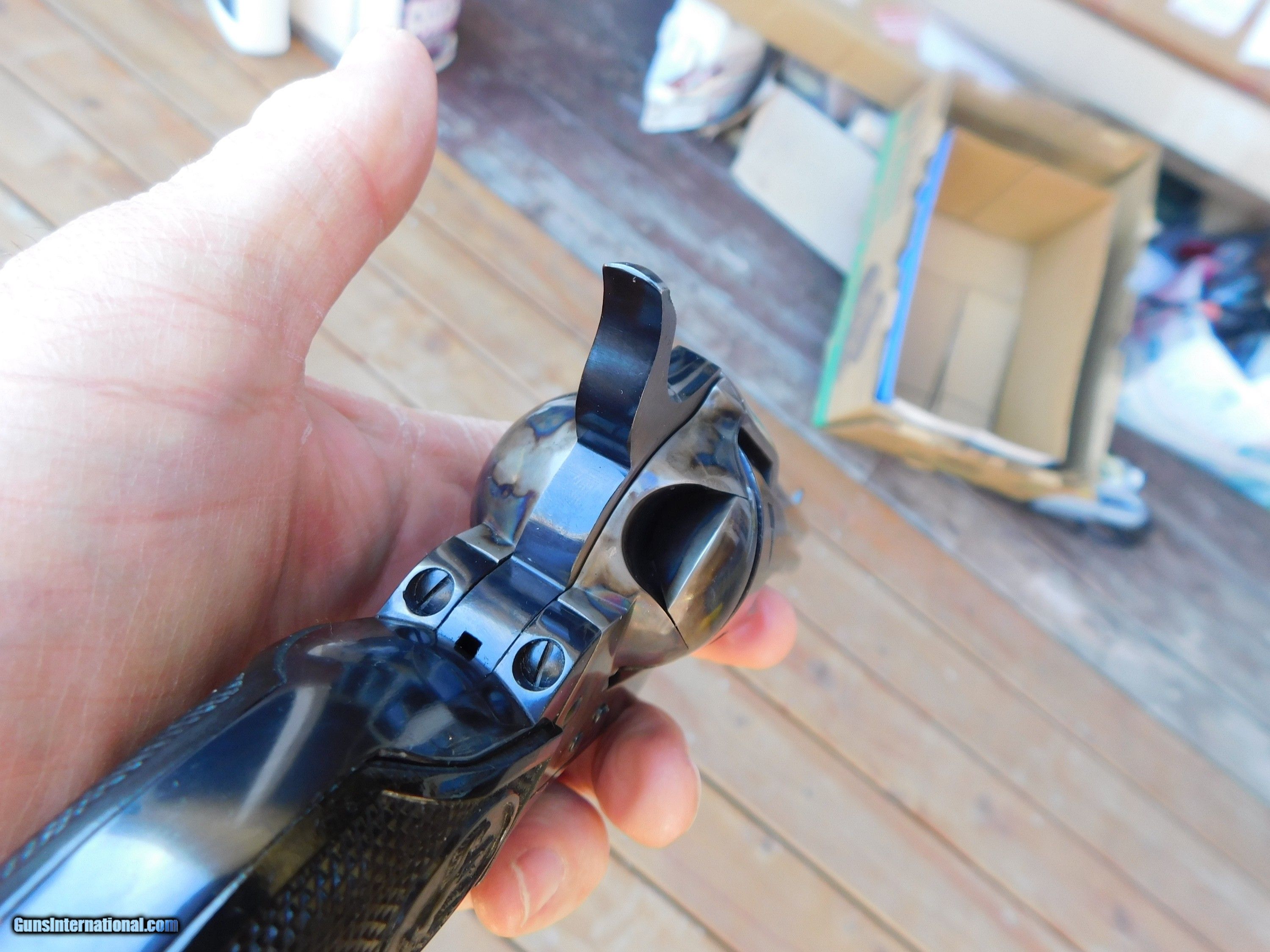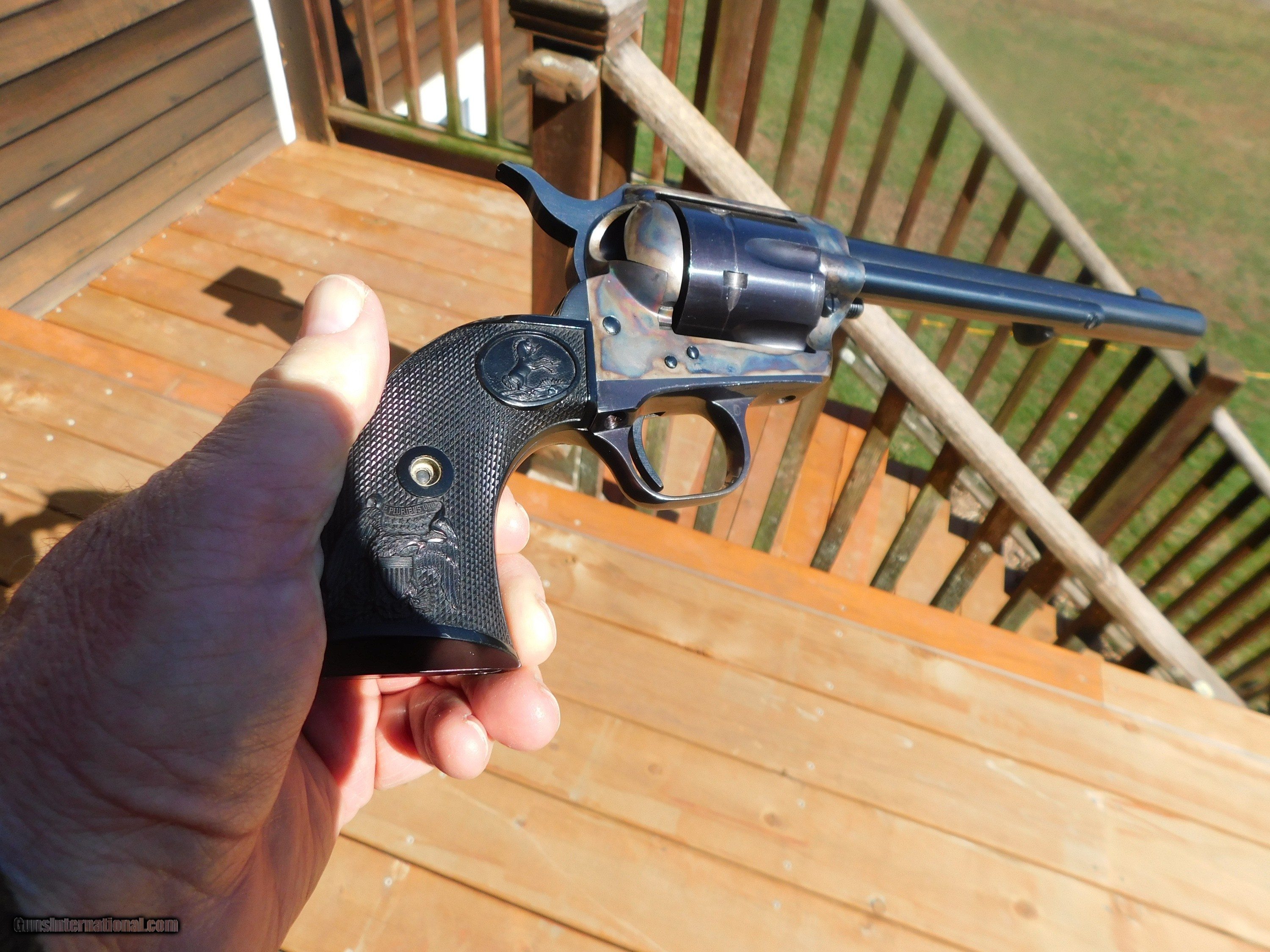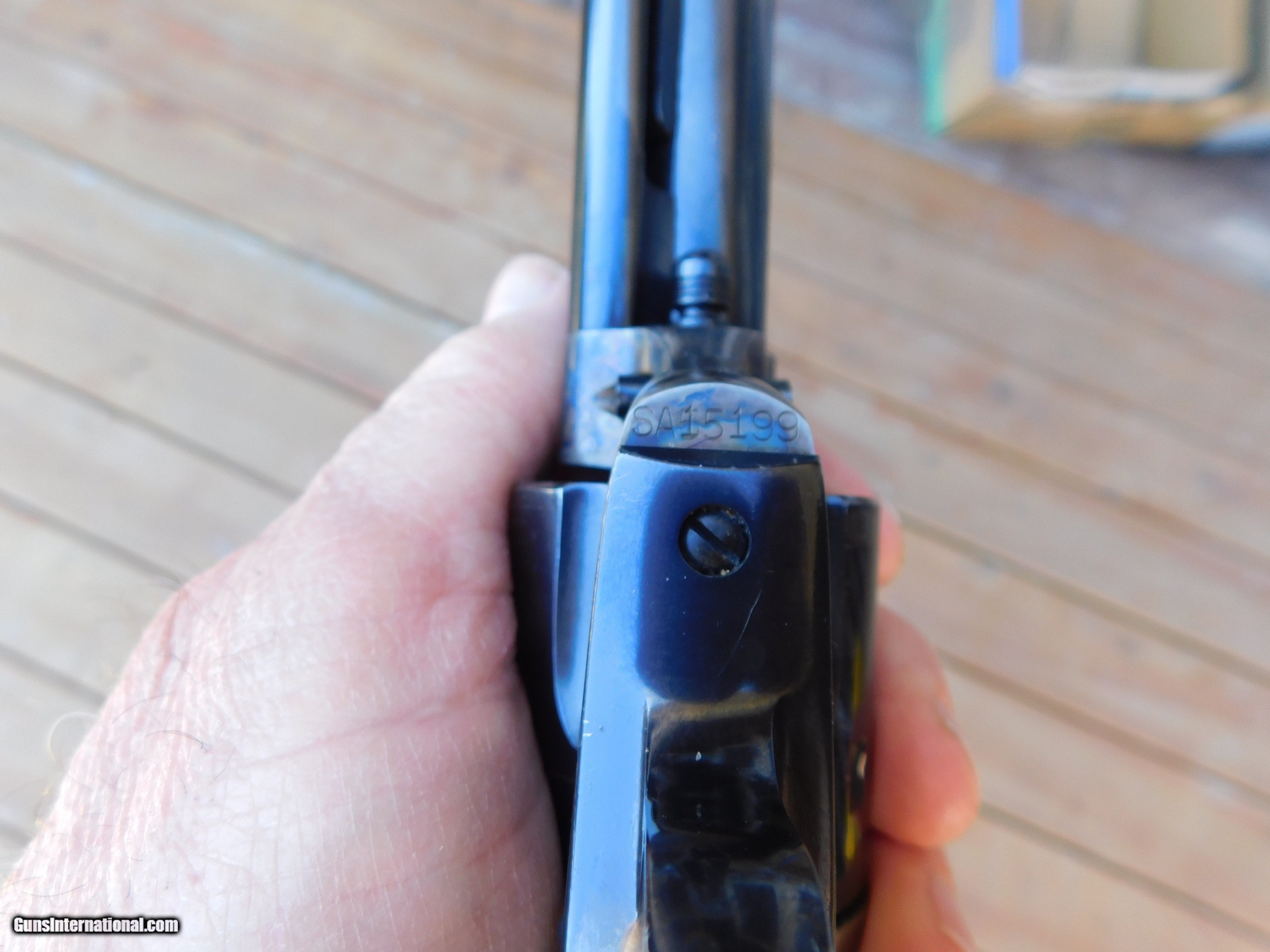 Description: SALE PENDING TERYY. AZ 3/31/23 All SAA's are increasingly hard to get these days esp since this year is the 150th anniversary of the SAA! Somewhat uniqie is the over samped serial # SEE PICS. Correct # is SA15199 however the lst digit 1 has visible underneat it but visible a 5 Most are chambered in the shorter barrel lengths and in 45 LC however in 357 it is a better hunting and defense round and much eaiser to find ammo for and especially cheaper to shoot when plinking with 38 Spl.ammo This one has seen some use with some light scratches on the blued are on barrel and some holster wear at the muzzle and drag line on cyl from use however it has not been abused andthe case colors are very strong. If anyone was sompulive about having it be 100% at some time it might be sent to cold or Turnbull for blue....It does not need to be re cased Comes with the correct original grips and an expensive pair of fitted larger grips. Shipping is $ 49.00 with insurance IF IT DOES NOT SAY ."SALE PENDING, UNDER DEPOSIT or ON HOLD"...IT IS AVAILABLE. WE DO NOT REPLY TO INQUIRIES THAT SAY "INTERESTED IN THIS GUN" OR "IS IT AVAILABLE" IF YOU WOULD LIKE TO BUY THIS OR ANY OF OUR GUNS WE SUGGEST YOU PHONE US; WE ARE OFTEN AVAIALABLE LONG HOURS. IF YOU ARE INTERSTED IN A GUN THAT IS UNDER DEPOSIT AND WOULD LIKE TO BE NOTIFIED IF A SIMILAR GUN COMES IN DROP US A LINE AND WE WILL MAKE EFFORTS TO CONTACT YOU WHEN ONE DOES COME IN. WE HAVE OVER 2000 SALES ON ALL SITES WITH AN A+ RATING ON ALL WE ALSO KEEP AN INVENTORY OF OLDER PERIOD CORRECT SCOPES; CALL WITH NEEDS WE MOSTLY PICK VERY CLEAN AND LIGHLTY USED GUNS. WE ARE HAPPY TO TAKE CONSIGNMENT GUNS AND COLLECTIONS OR WILL BUY YOURS OUTRIGHT. WE SOMETIMES ARE EMPLOYED FOR ESTATE PURPOSES AND VALUATIONS. AT THIS TIME WE ARE ONLY ACCEPTING US POSTAL MONEY ORDERS OR BANK CHECKS FOR PAYMENT IT IS THE BUYERS RESPONSIBILITY TO GET US A COPY OF YOUR RECEIVING FFL'S LIC AND A COPY OF YOUR PHOTO ID BEFORE THE GUN SHIPS YOU MUST CALL OR CONTACT YOUR FFL.WE DO NOT CALL FOR YOU UNLESS THEY RQUIRE IT. LAYAWAY PURCHASES NOT COMPLETED ON ANY RETURNED ITEM UNLESS NOT AS DESCRIBED OR DAMAGED ARE SUBJECT TO A 10% RELISTING/RESTOCKING FEE AND MUST BE RETURNED WITH NO NEW MARKS OR SCRATCHES, SENT BACK INSURED, PRIORITY SIGNATURE REQUIRED. ALL INFORMATION CONTAINED HEREIN IS BELIEVED TO BE ACCURATE BUT IS NOT GUARANTEED. WITH ANY OLDER OR USED GUN IT SHOULD BE INSPECTED BY A GUNSMITH PRIOR TO SHOOTING. SOLD |