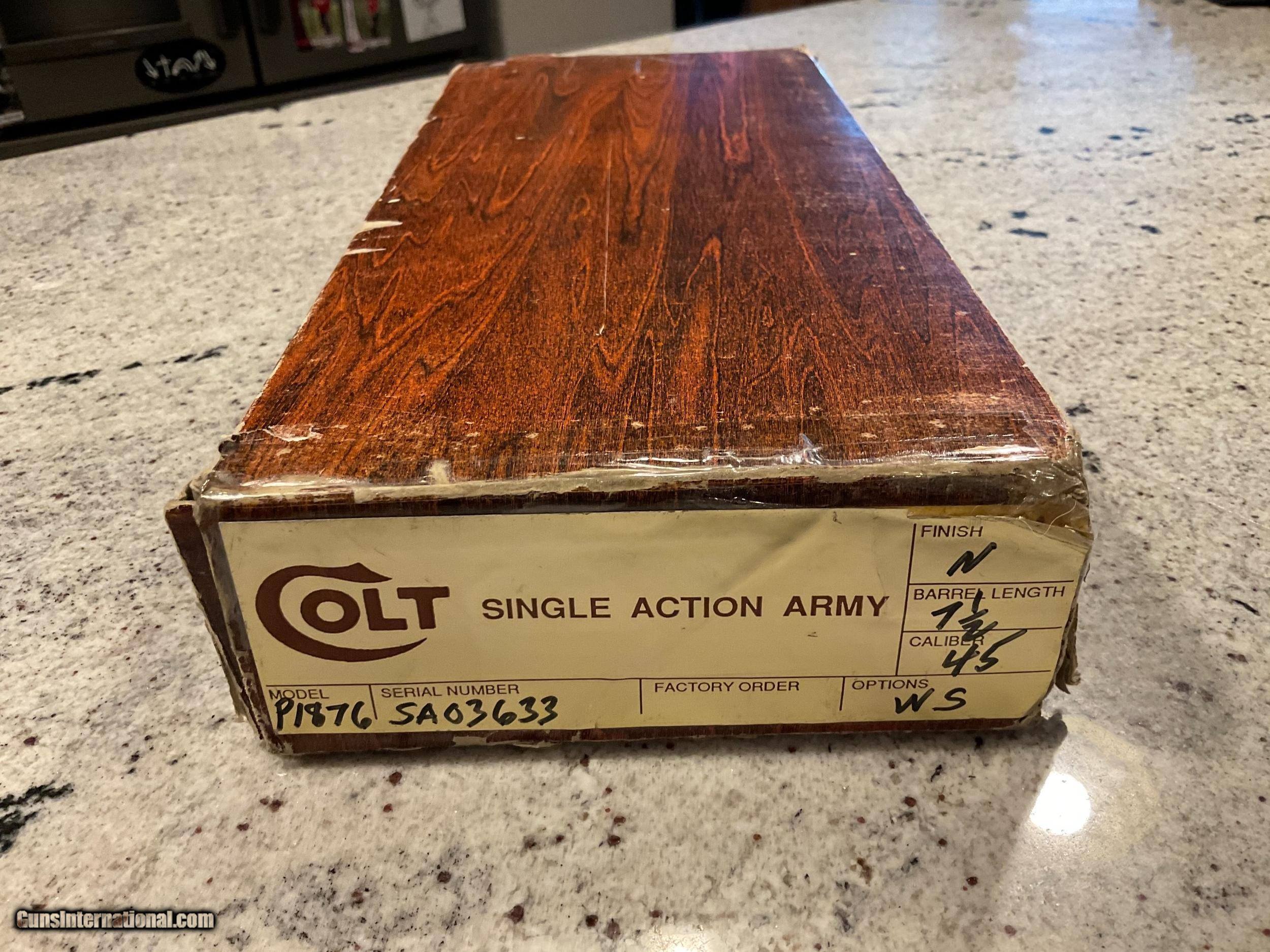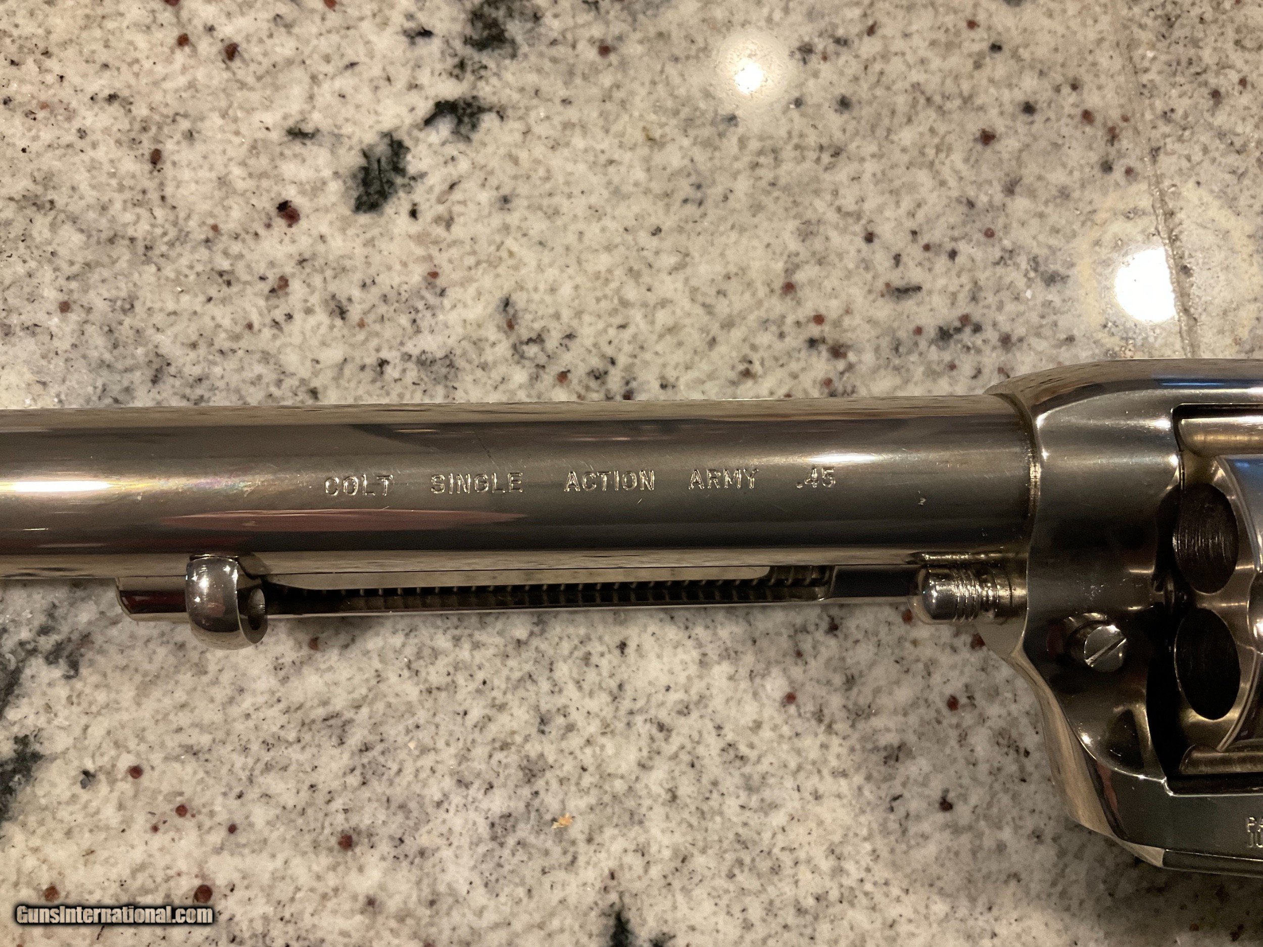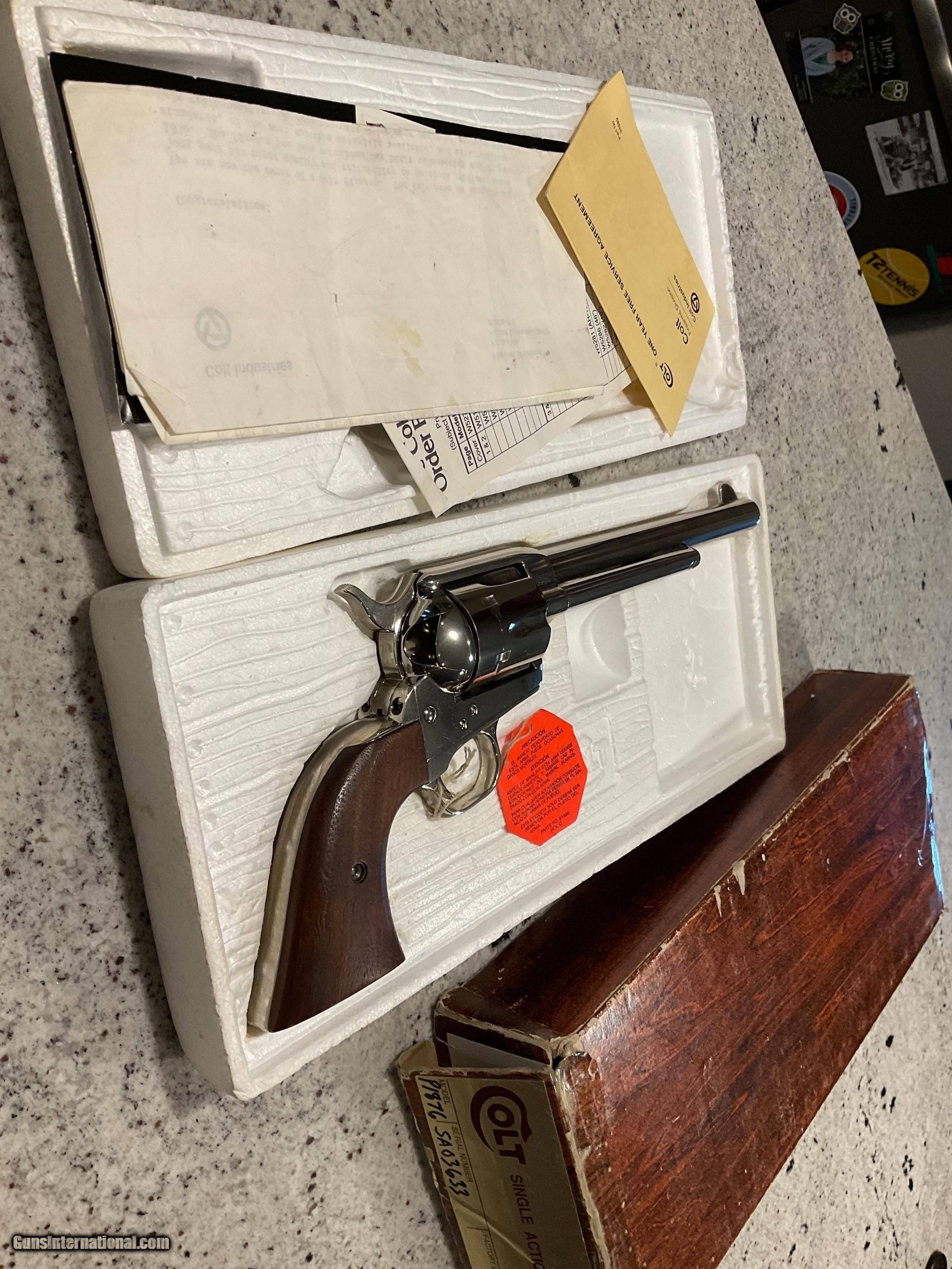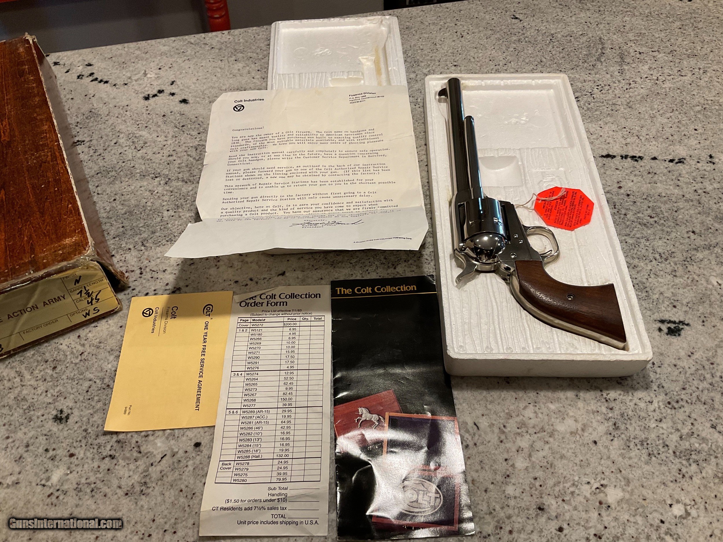 Description: Colt Single Action Army Model # P1876 Serial #SAO 0363* 7 1/2" Barrel Nickel Finish Original box with all accompanying papers. Great metal and grips. Don't see any issues with either. To my knowledge never shot! Can,t say much more. It is a beautiful revolver at a very reasonable price. shipping $30 SOLD Antique: Yes |