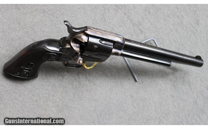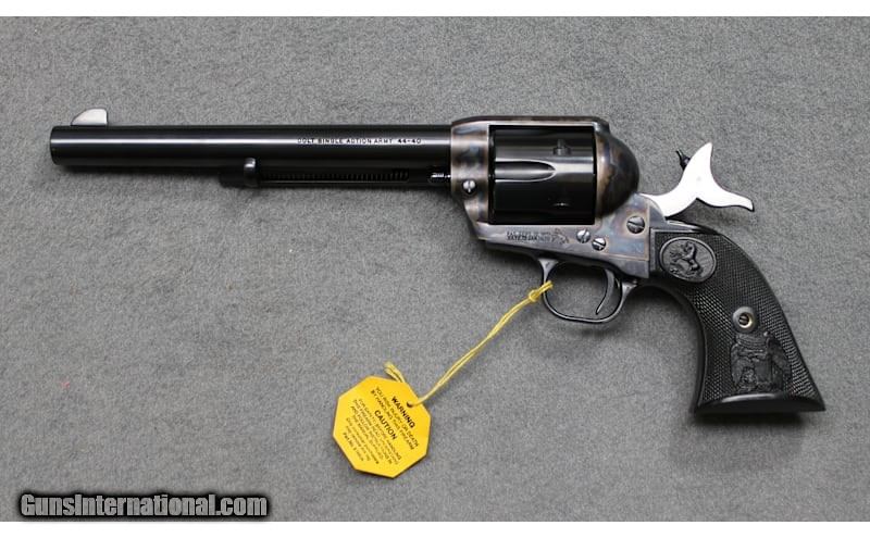 This Colt Single Action Army (3rd Gen) is chambered in .44-40 Cal. Firearm features a 7.5" barrel with hard rubber grips. Includes woodgrain box. Serial number SA59721 .44-40 Winchester