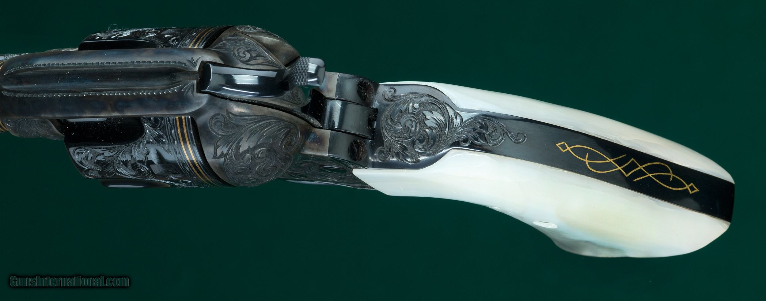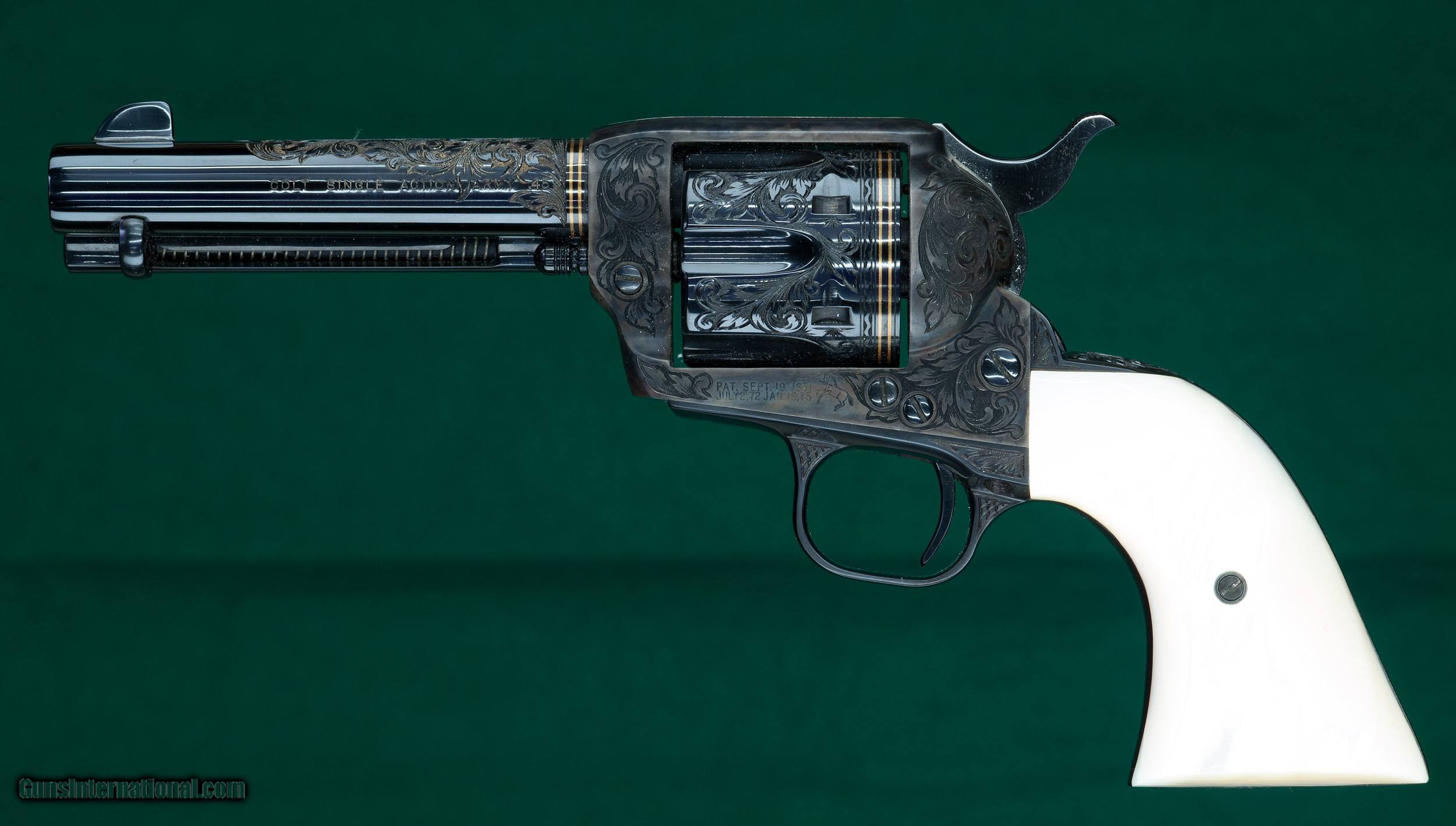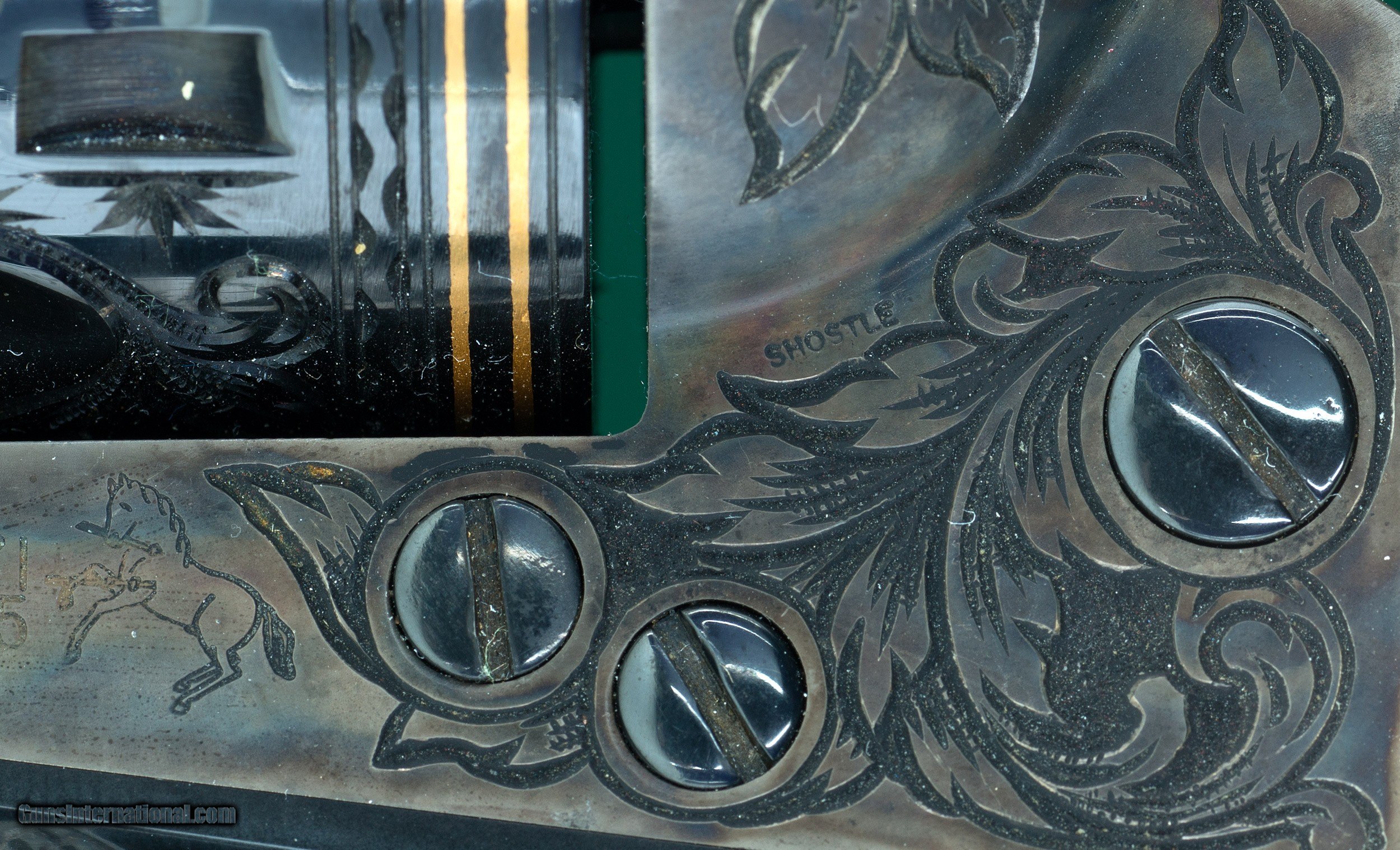 Description: 4 3/4" barrel. Blued and casehardened. Smooth mother-of-pearl grips. Acanthus scroll engraved by Ben Shostle and with double gold lines encircling breech ends of both barrel and cylinder. Shostle's mark below left recoil shield. Mfd 1992. Unfired and unturned. In Blue Colt box. SOLD |
