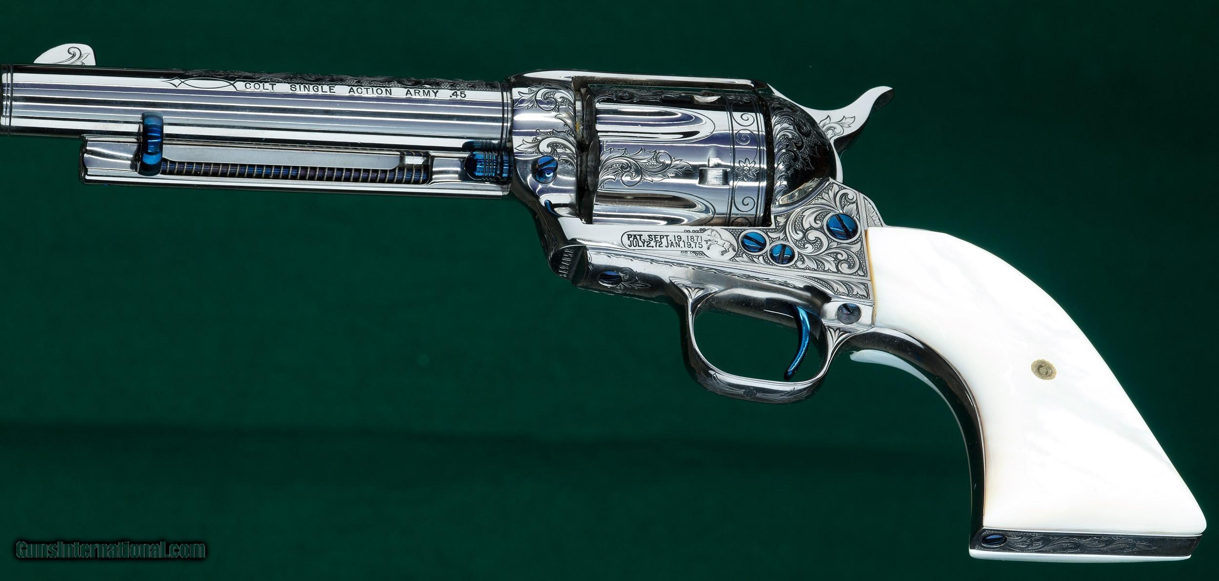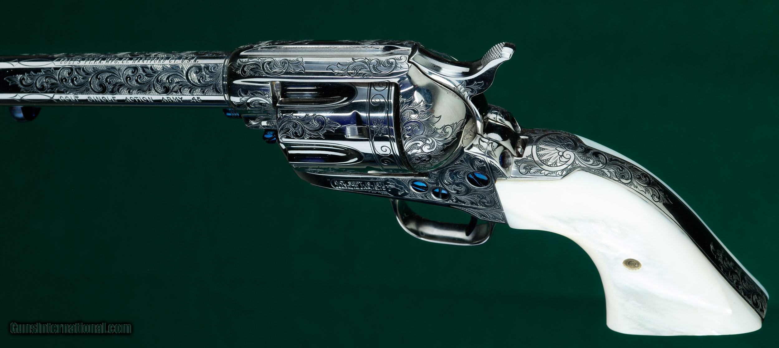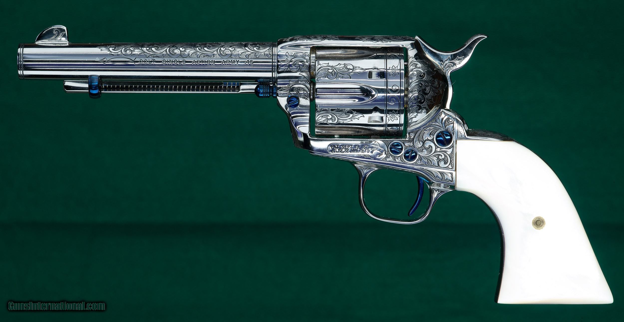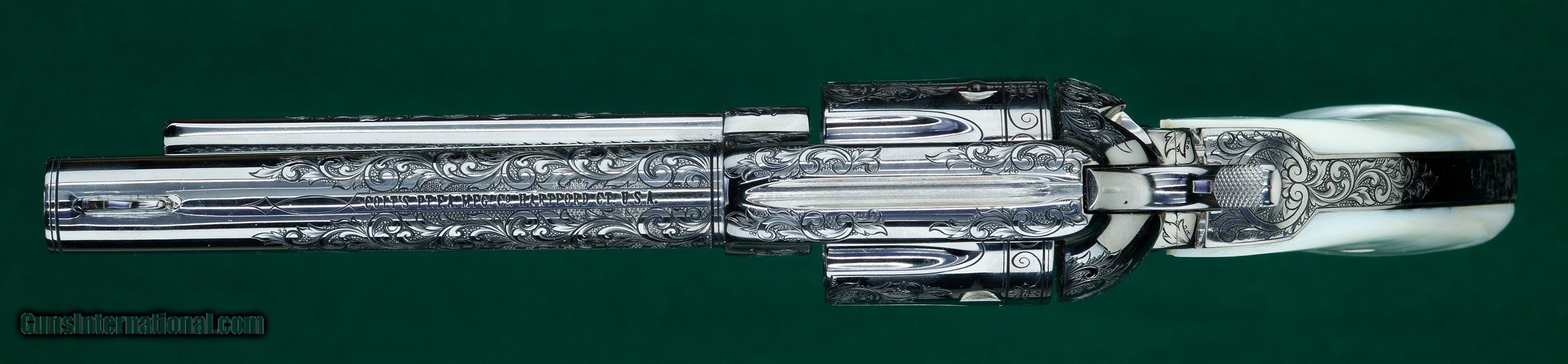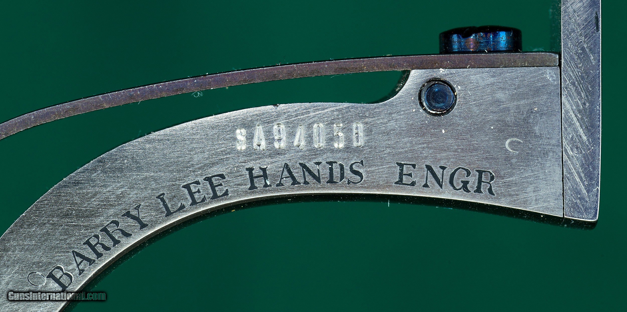 Description: 5 1/2" barrel. All nickel finish with fire-blued small parts. Smooth mother-of-pearl grips. Fine C-coverage factory-style scroll engraving by Barry Lee Hands, whose name is crisply incised in Roman block letters underneath left grip. Mfd 1990. Unfired and unturned. In original brown Colt box. SOLD |