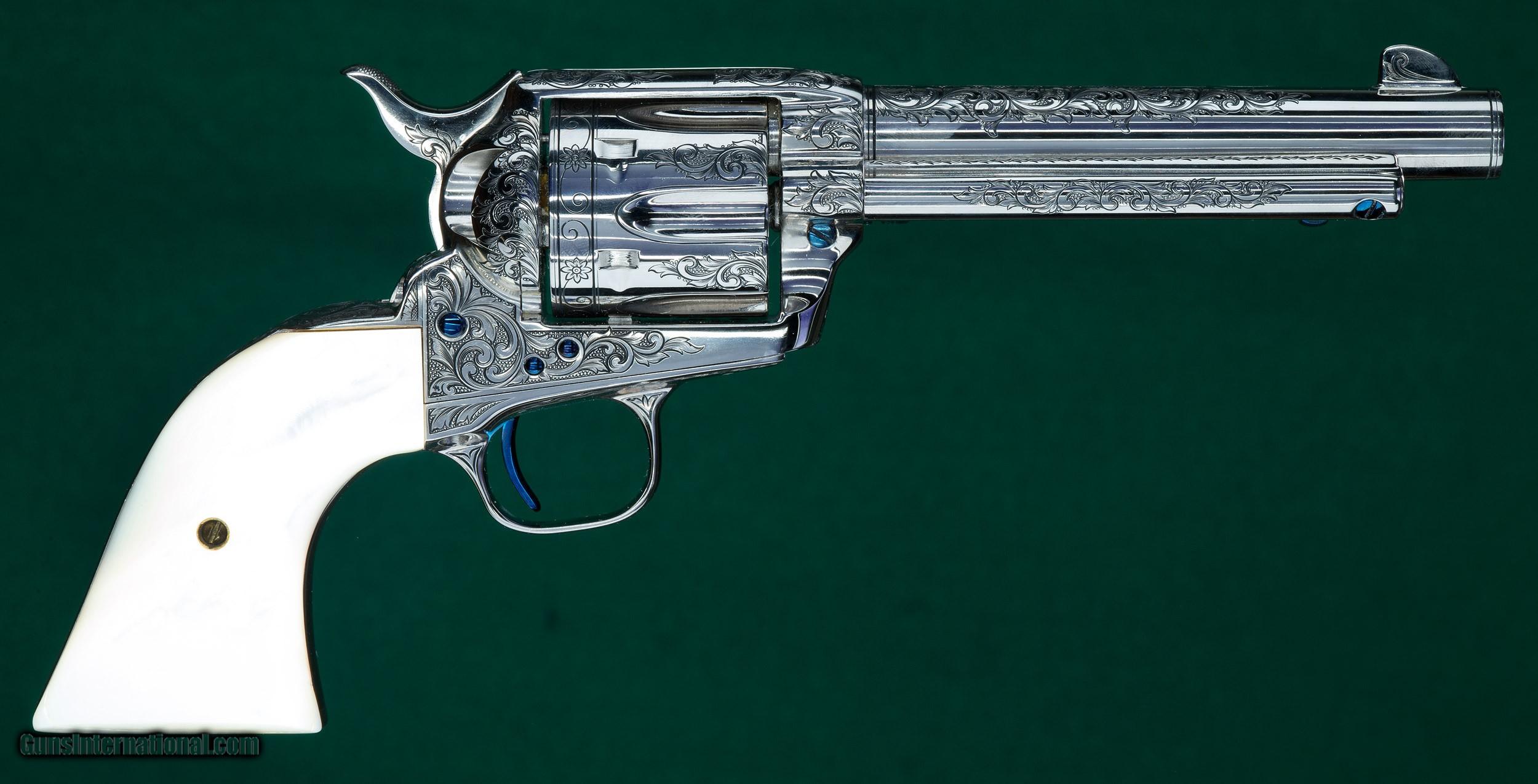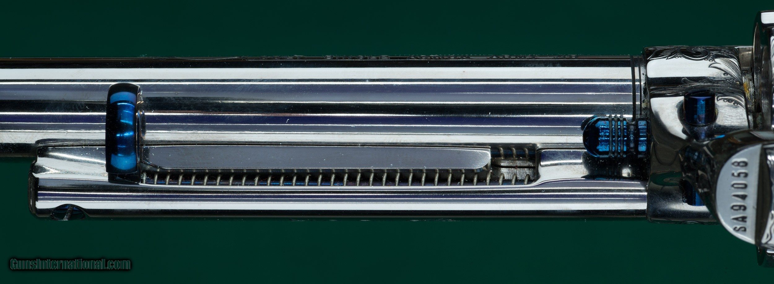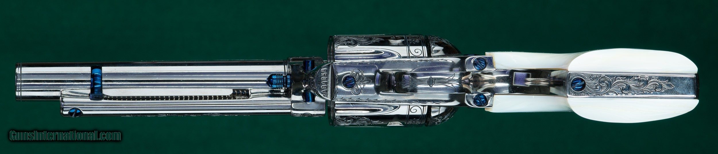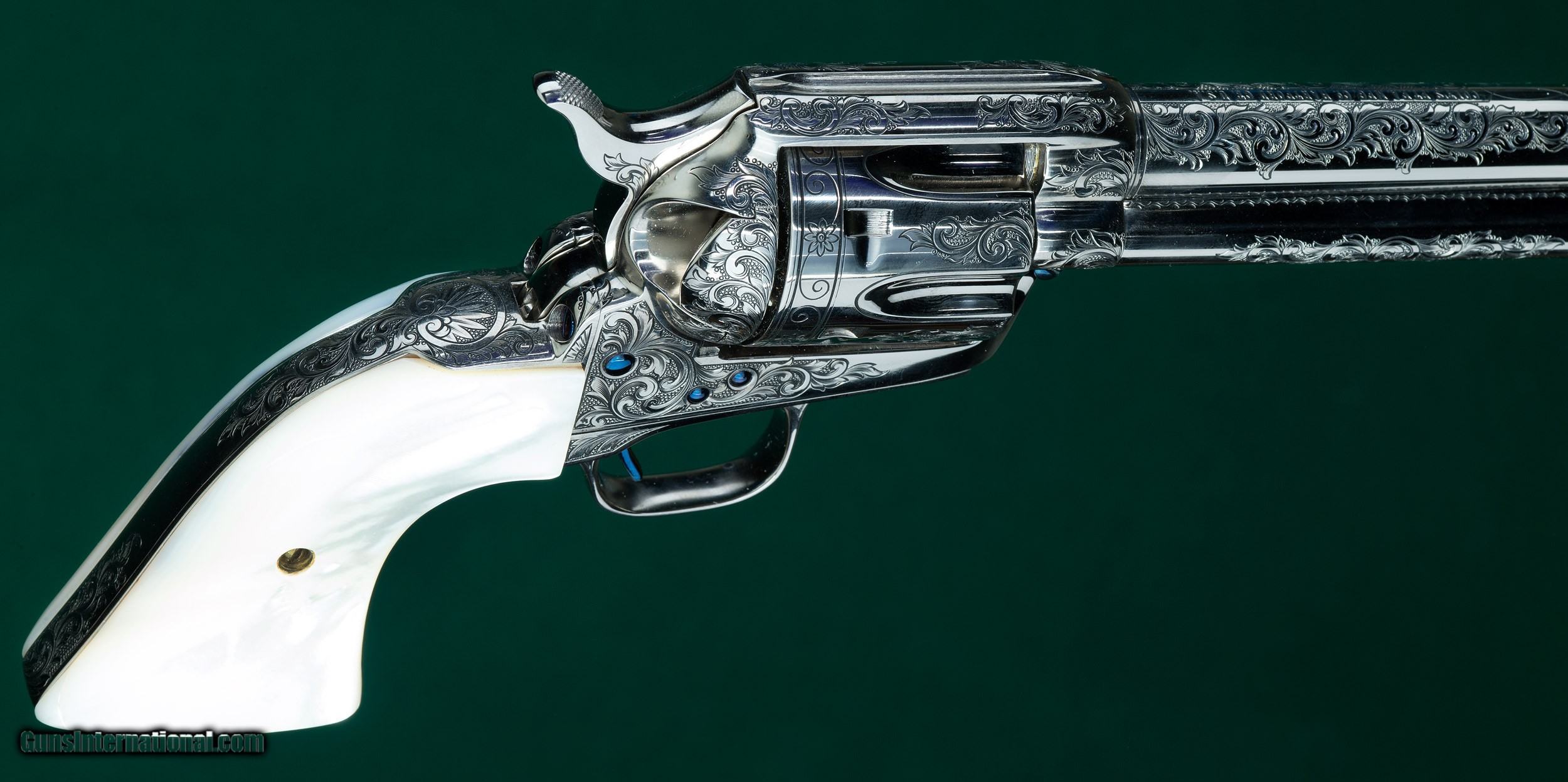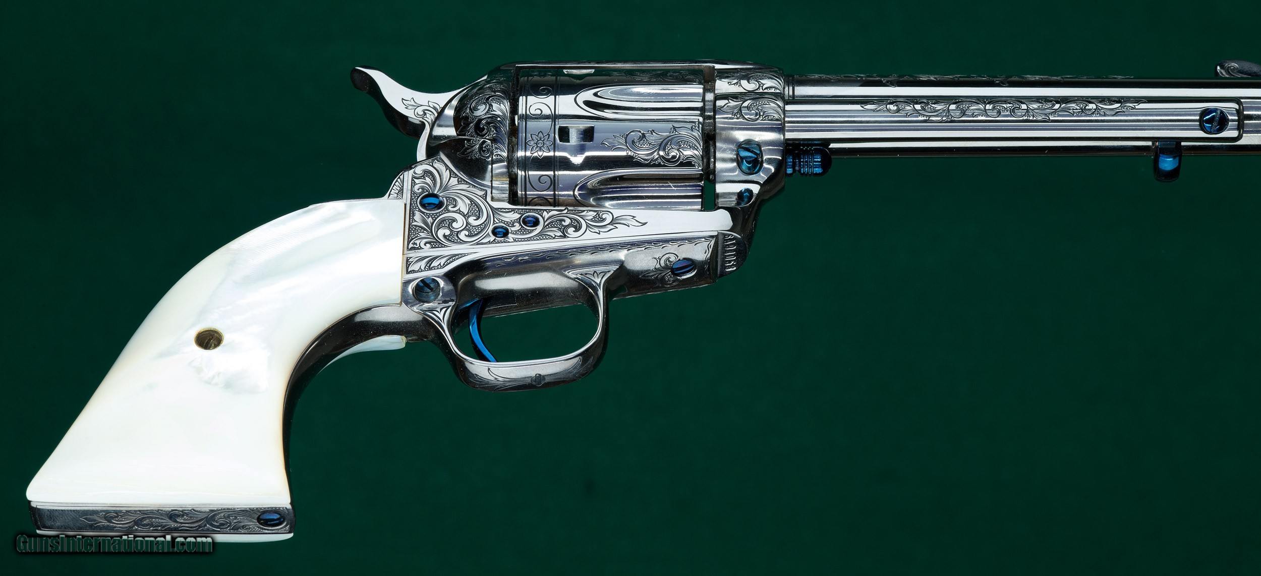 Description: 5 1/2" barrel. All nickel finish with fire-blued small parts. Smooth mother-of-pearl grips. Fine C-coverage factory-style scroll engraving by Barry Lee Hands, whose name is crisply incised in Roman block letters underneath left grip. Mfd 1990. Unfired and unturned. In original brown Colt box. SOLD |