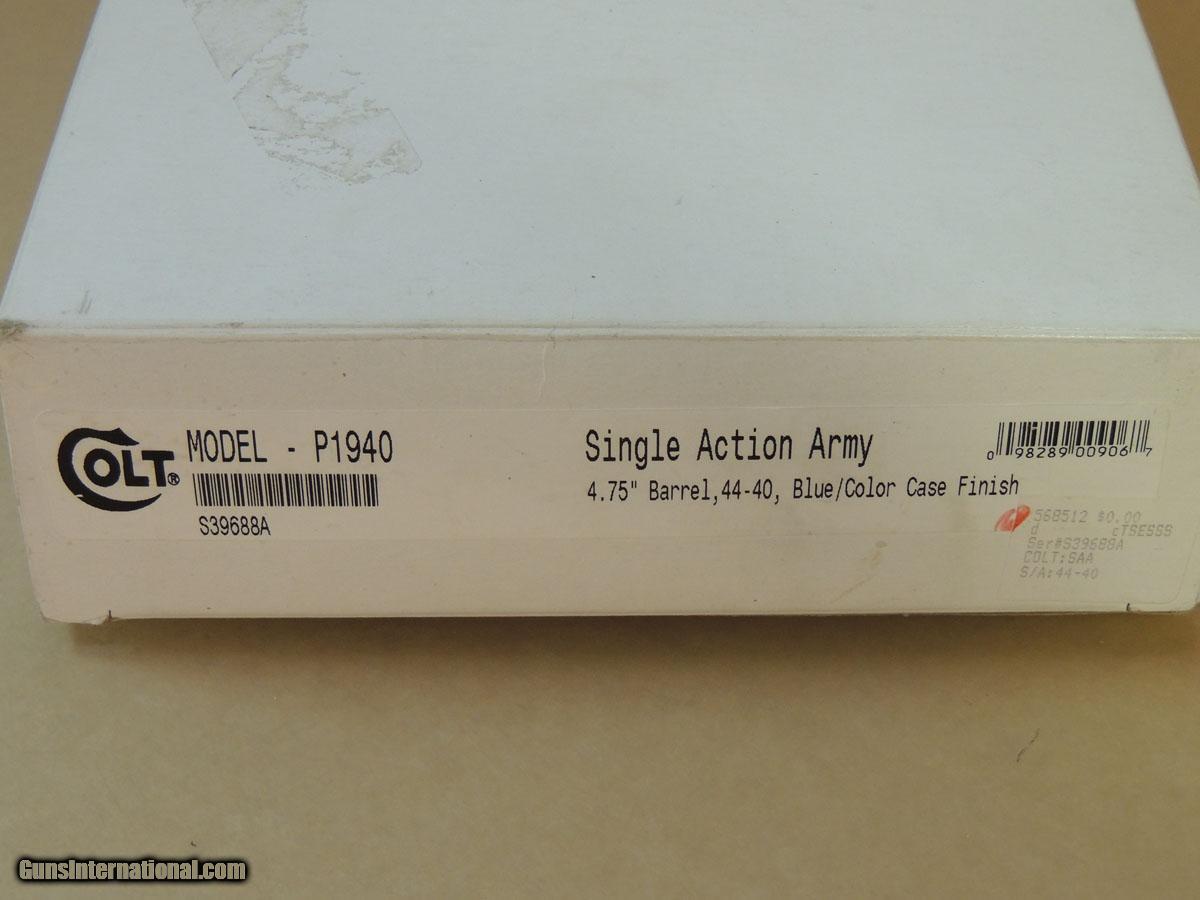 Description: COLT SINGLE ACTION ARMY 44-40 IN BOX, 4 3/4" BARREL, BLUE/ CASE COLOR, EAGLE STOCKS, APPEARS FACTORY TEST FIRED ONLY, IN BOX WITH PAPERS, THIRD GENERATION $2399 ******* (PLEASE REFERENCE OUR INVENTORY NUMBER) (PAYMENT OPTIONS) (Postal Money Order) (Cashiers Checks) (Personal Checks (Item held until Check Cleared) (Layaway 120 days same as cash - Deposit required- Our Terms and Conditions Apply) (Credit Cards Visa or Master Card 4% fee added to total sale) (GA residents 7% sales Tax Applies) (FAX 888-597-1394) (BEST PHONE/TEXT 229-424-8450) (Shipping $35.00) SOLD |