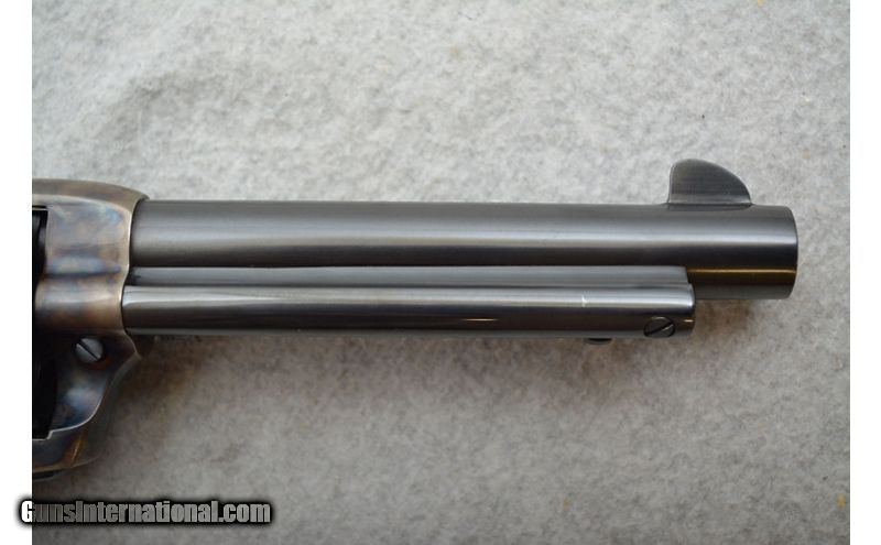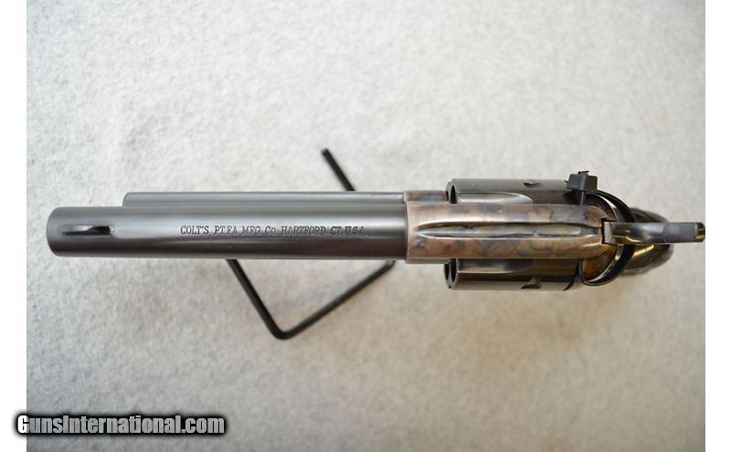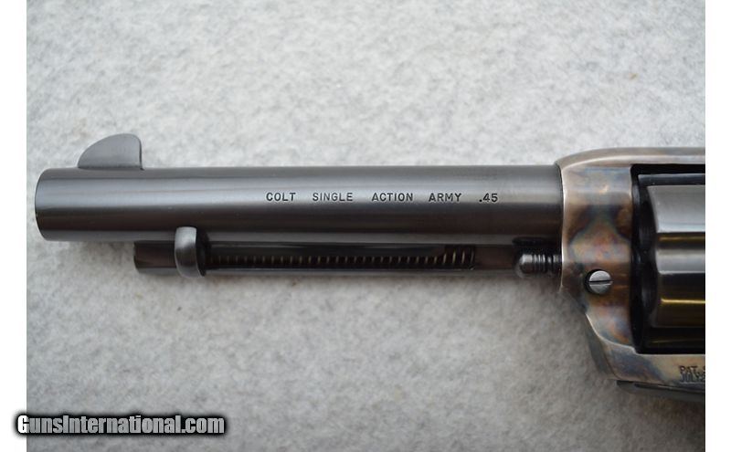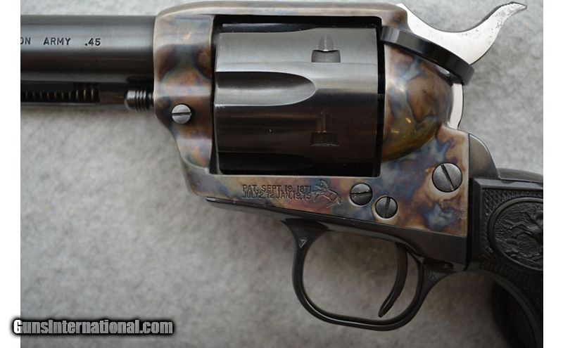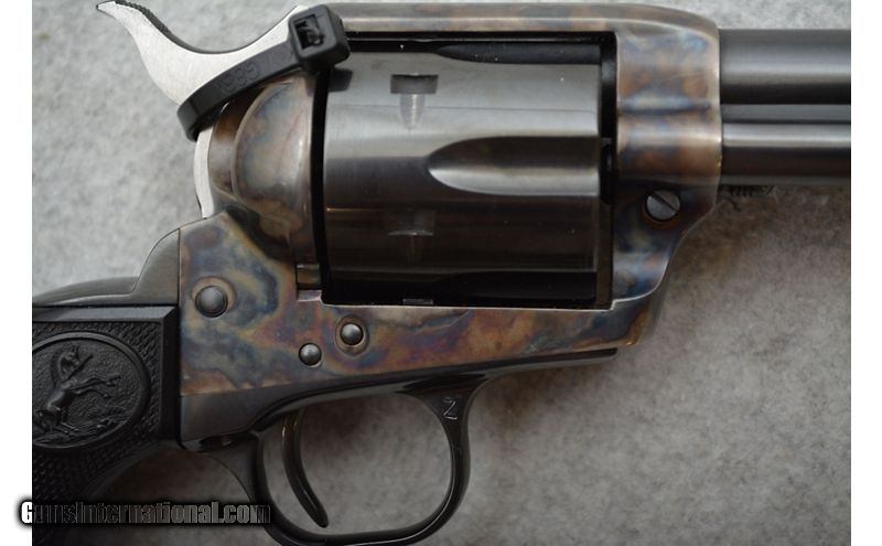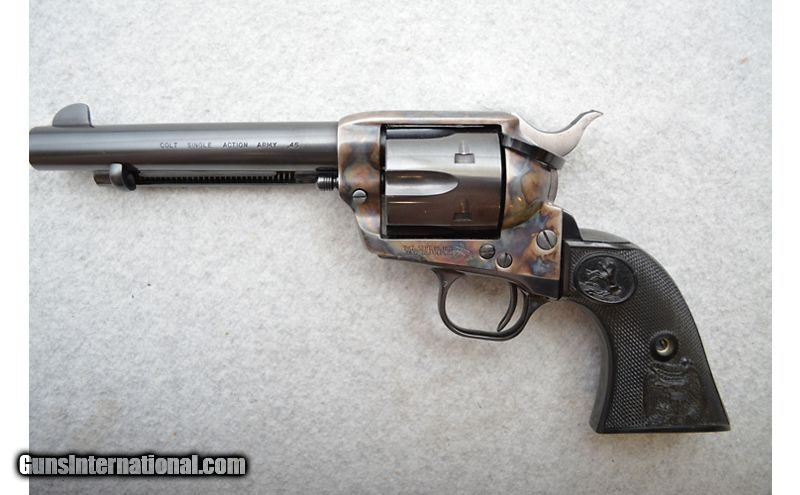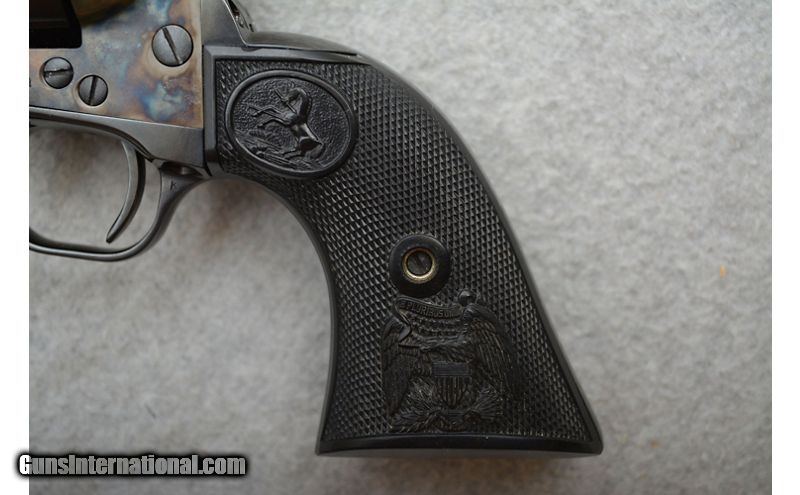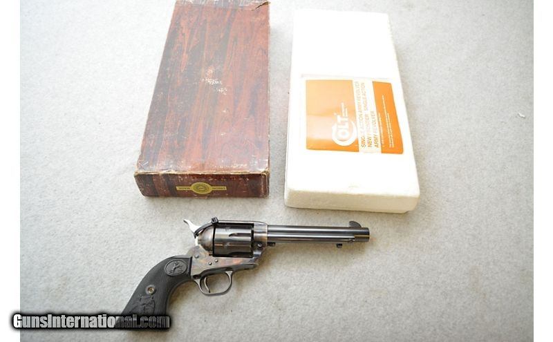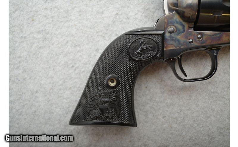 Description: Excellent shape overall. The case-hardening on the frame has a few light marks. The worst mark is found on the right side above the bump for the ejector rod and even this mark is only visible when looking at it when the light is right. Comes with the factory box, owners manual, and a factory letter (which is not pictured). .45 Colt SOLD Chambers: 6-Shot revolving cylinder. Metal Condition: Very good to excellent. Wood Condition: Grips are in excellent condition. Bore Condition: Excellent. Barrels: 5½" Blued. Triggers: Blued metal with smooth surface. Stock Dimensions: N/A Fore End: N/A Butt Pad: Black plastic grip panels with American eagle crests and Colt logo's. Weight: 2lbs 4oz Sights: Fixed front blade and groove on top of the frame. Chokes: N/A Item Location: Green Bay |