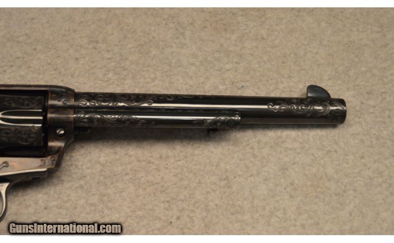 Description: The Colt single action army (also known as the SAA) is a single action revolver holding six rounds of .45 colt ammunition. This colt has engravings on the Barrel, cylinder, and frame. The grip itself has two stamps one is a horse and the other an eagle. SOLD Manufacturer: 1977 Caliber Info: .45 Colt Metal Condition: Barrel, cylinder, and trigger gaurd Blued. Framed Color Case-hardened Wood Condition: None Barrels: 7 Fore End: Engravings Weight: 3lbs Item Location: Fort Worth, TX |