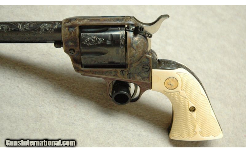 Description: Colt Single Action Army Revolver .45 Colt. Appears as new. Manufactured in 1980, this third generation Colt Single Action Army features class “C” factory engraving from the Colt Custom Shop. The tastefully engraved frame is color cased while the barrel, cylinder, ejector rod housing, and grip frame are blued. Included are ivory grips with the colt medallion and a factory leatherette case. SOLD Manufacturer: 1980 Caliber Info: .45 Colt. Chambers: Revolver. Metal Condition: Appears as new. Wood Condition: Grips appear as new. Bore Condition: Bright. Barrels: 7 1/2" Barrel. Triggers: Single action. Stock: Factory grips. Weight: 44 Ozs. Sights: Fixed rear sight channel, blade front sight. Extras: With case. Item Location: La Vista, NE |