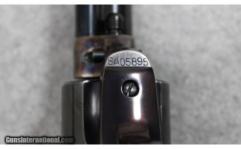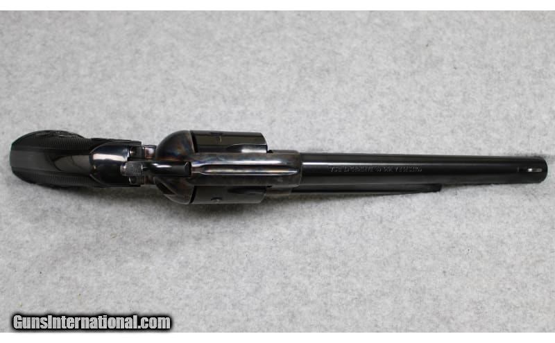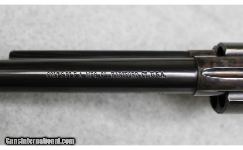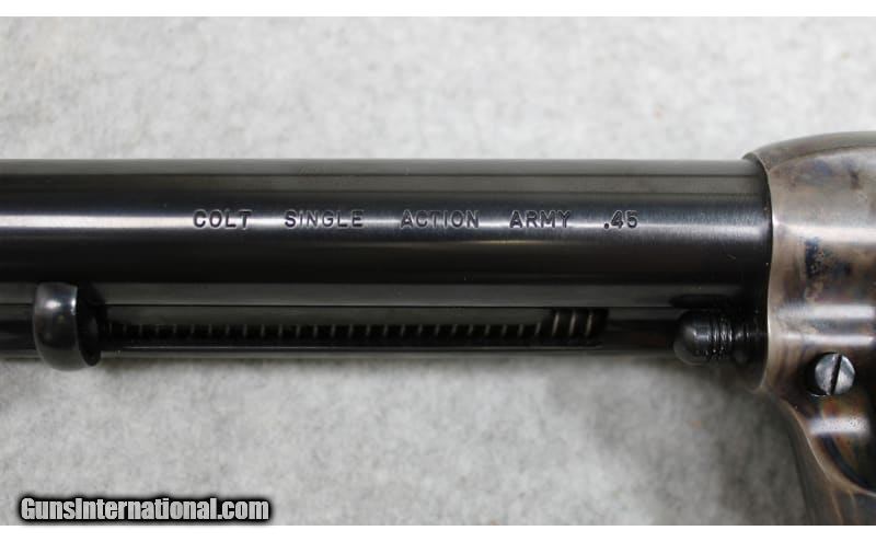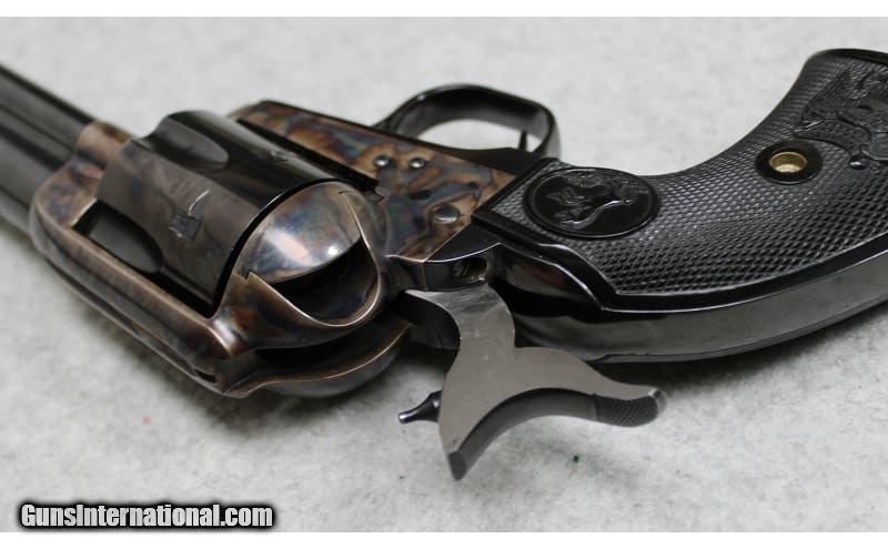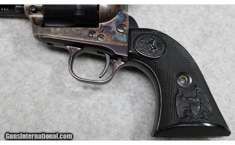 Description: This Colt Single Action Army revolver is chambered in .45 Colt. It features a color case hardened finish and hard plastic grips. There is the faintest hint of a drag line on the cylinder, but otherwise wear is very minimal. Date of manufacture is 1987. .45 Colt SOLD Metal Condition: Very Good with Minor Handling Marks Wood Condition: N/A Bore Condition: Bright and Clear with Good Rifling Barrels: 7.5 inch Triggers: SA Butt Pad: Hard Plastic Weight: 2 lb 8 oz Sights: Front Bladed sight Item Location: Fort Worth, TX |