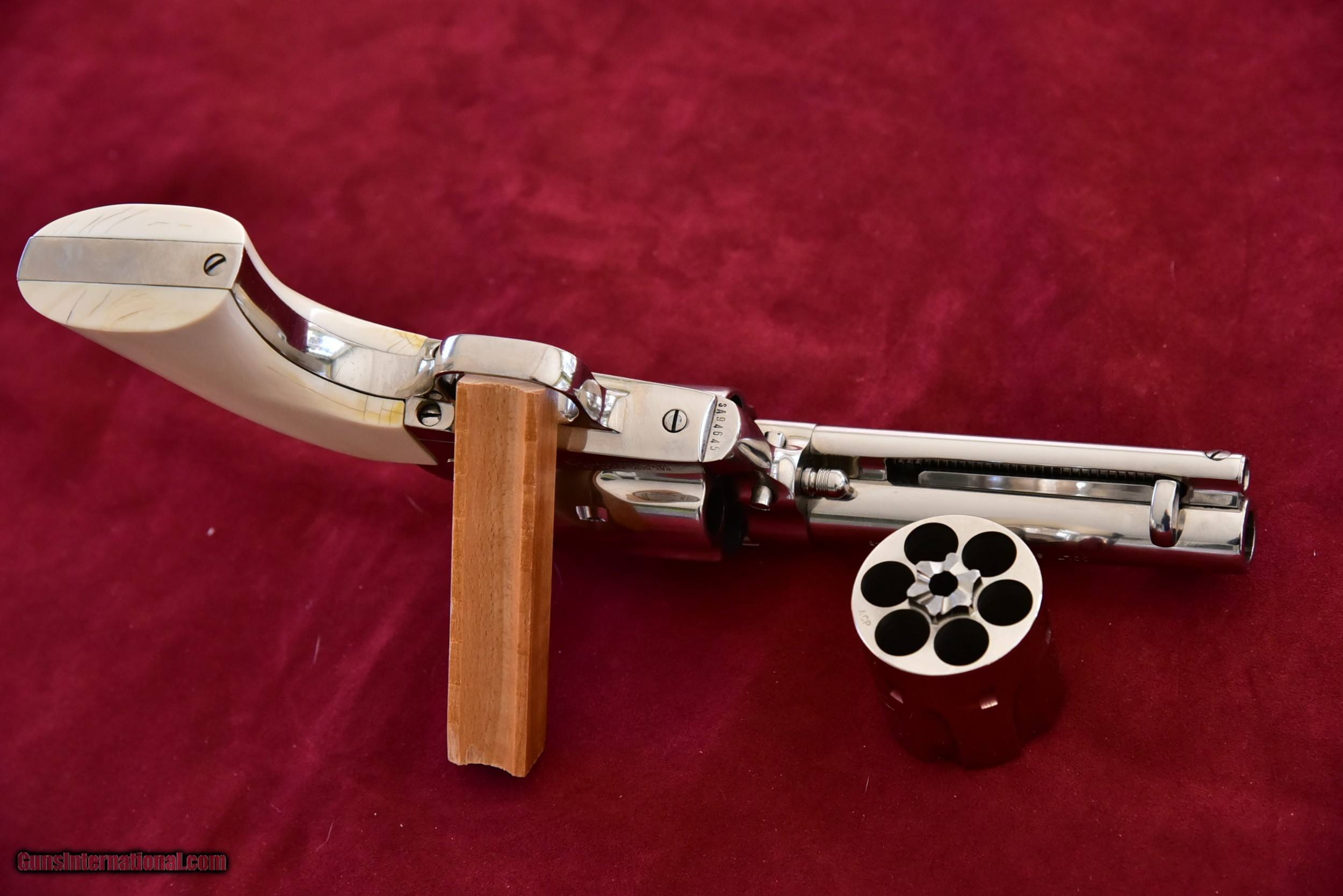 Description: HERE IS A SUPURB EXAMPLE OF A MID THIRD GENERATION UNFIRED COLT SINGLE ACTION ARMY REVOLVER. THE NICKEL FINISH IS BRIGHT AND SHINY WITHOUT ANY SCRATCHES, HANDLING MARKS OR TURN LINES ON THE CYLINDERS. THE SCREWS ARE UNTOUCHED, THE IVORY GRIPS ARE PERFECTLY FIT WITH A NICE GRAIN TO THEM. THE GUN HAS A 4 3/4" BARRELGIVING IT GREAT FEEL AND BALANCE. THE GUN COMES WITH THE ORIGINAL BLUE BOX AND WHITE PAPER SLEEVE. SOLD Handgun Caliber: .45 Colt, .45 ACP (.45 Auto) Manufacturer: COLT Model: SINGLE ACTION ARMY Serial Number: SA94645 Barrel Length: 4 3/4 Bore: EXCELLENT Chambers: EXCELLENT Condition: EXCELLENT Metal Condition: EXCELLENT Barrels: EXCELLENT Action: SINGLE ACTION Finish: NICKEL Manufacture Date: 1991 Extras: EXTRA .45 ACP CYLINDER |