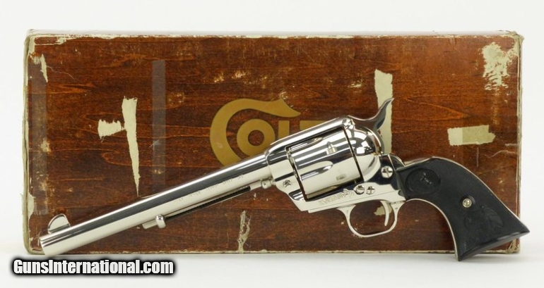 Colt Single Action Army .45 LC caliber revolver. 7½” 3rd generation model with nickel finish. Excellent condition with wood grain box.