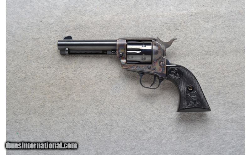 Description: This Colt Model Single Action Army is a 6 shot revolver in .45 Long Colt Cal. It has a 4 5/8 inch barrel. A blade front and integral notch rear sight. The grip is a diamond checkered hard black plastic with the Colt horse and American eagle logo's. It has a case colored receiver. The hammer spur is checkered. Serial Number 68651SA. This Colt model is highly sought after as a shooter or collectible. .45 LC SOLD Chambers: 6 shot fluted cylinder. Metal Condition: Excellent. Bore Condition: Excellent. Barrels: 4 5/8 inch. Triggers: Single Action. Weight: 34 oz. Sights: Blade front. Integral notch rear. Item Location: Richfield, WI |