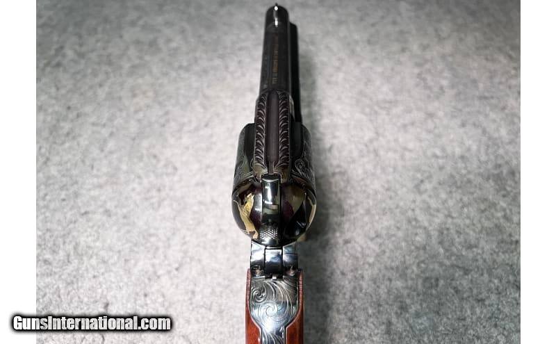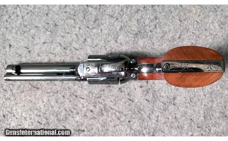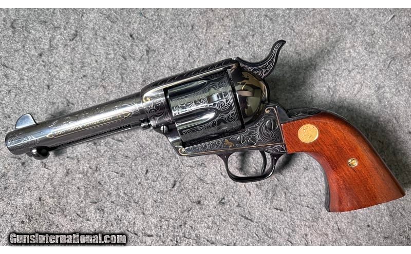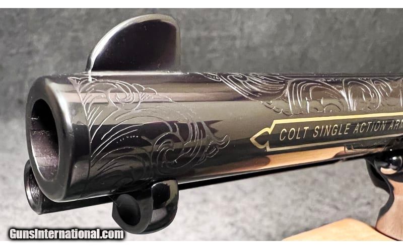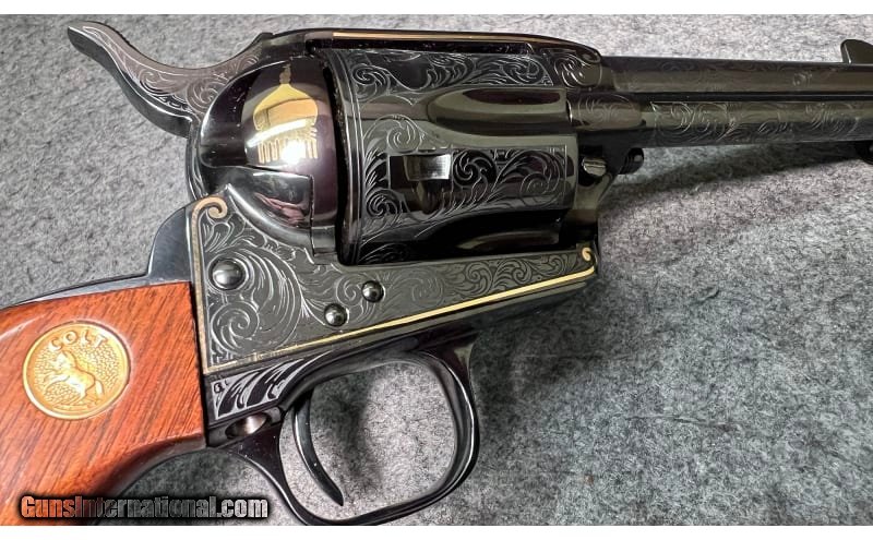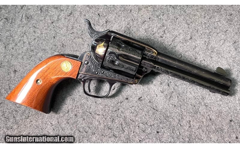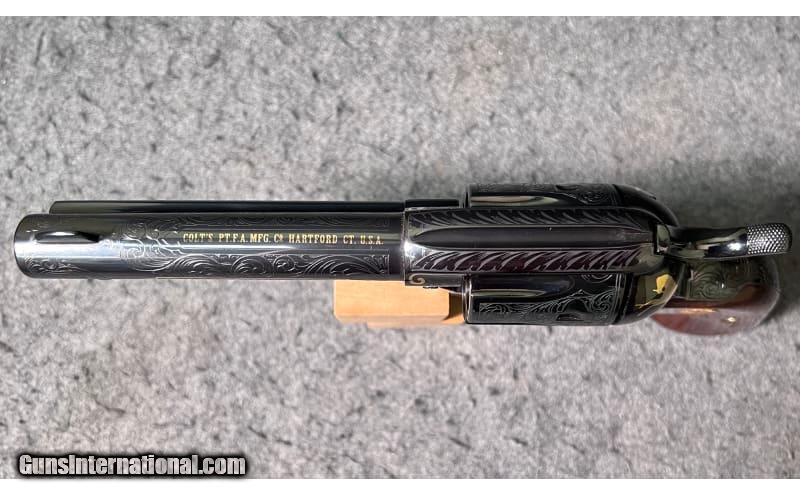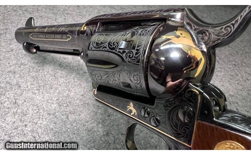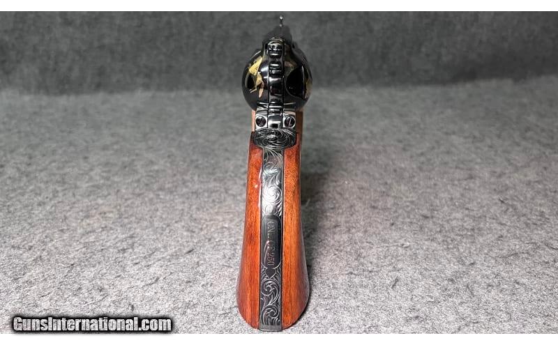 Description: This 1995 revolver is a Colt Single Action Army chambered in .45 Long Colt. It has gold accents throughout. The bluing and engraving is in excellent condition, as are the grip panels. This piece is number 200 of 250 manufactured. .45 Long Colt SOLD Chambers: 6-round cylinder Metal Condition: Bluing and engraving is in excellent condition Wood Condition: Wood grips are in excellent condition Bore Condition: Bore is bright and shiny with strong rifling Barrels: 4¾" barrel Stock Dimensions: 10¼" overall length Weight: 2 Lbs 1 oz Sights: "Fixed blade front sight, grooved top frame rear sight Item Location: Wichita, KS |