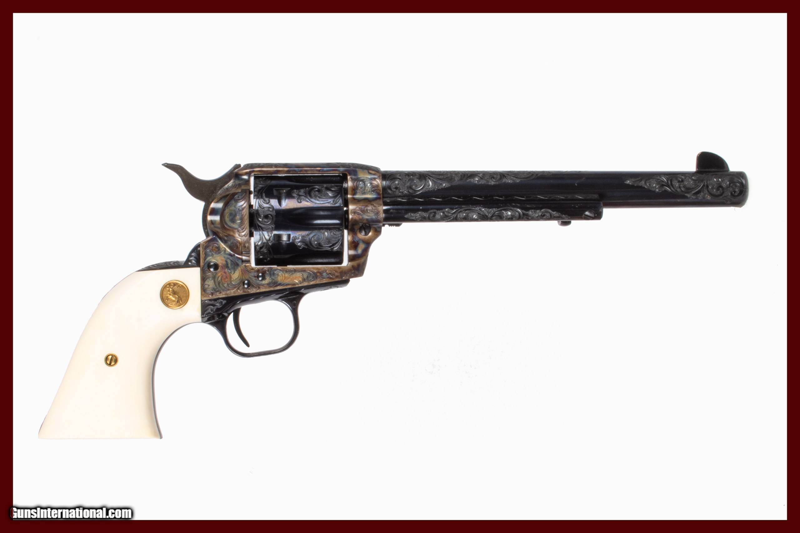 Description: Colt Single Action Army, third generation revolver chambered for 45 Long Colt - factory engraved with 7.5-inch barrel, blued steel, case-colored receiver, six-shot fluted cylinder, stainless-walled hammer, and Ivory handles with Colt medallions. Includes letter. The NRA grading condition for this USED firearm is Very Good. We ship domestically in the United States. Additional shipping rates apply to Alaska and Hawaii. Dury’s Lifetime Warranty: All firearms purchased from Dury’s Gun Shop, NEW or USED, are covered by a lifetime warranty. We will repair or replace, at our discretion, any firearm purchased from Dury’s Gun Shop, Inc. for as long as it is owned by the purchaser. This warranty is not transferable. WE BUY GUNS! NO COLLECTION TOO BIG OR SMALL FOR OUR GUNS INTERNATIONAL CUSTOMERS ALL OF OUR FIREARMS CAN BE PURCHASED DIRECTLY FROM OUR DURY’S GUNS SITE ! SOLD Manufacturer: Colt Model: Single Action Army Caliber Info: 45 LC Barrels: 8inches |
