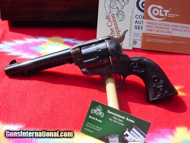 Description: SOLD ! Colt Single Action Army,45 Colt, 5 1/2 ", with factory numbered box, papers, like new. Excellent condtion 99.9% Bluing and case color.,looks like it was never fired after it left Hartford. S/N SA461xx born 1980, 3rd year of the 3rd Gen's. Nice vibrant case color,great edition to a collection,have been getting harder to find,especailly in this condition. Offered at $1895 plus shipping/insurance should be $45 insured to your FFL Be sure to look over my other listings, have a couple more Colt Saa's and a USFA as well as many other fine guns listed here on G/I/ Please email your phone number so I can call back if I miss the call-do not have text sorry, thanks. Be sure to look at my other offerings for more guns,Merkel'sMannlicher Schoenauer's, Drillings, Combo's, Colt Saa's, Colt’s, Ruger’s, Browning’s,Kimber’s, Les Baer, Uberti's by both Taylor and Cimarron, and Ferlib, Merkel G&H-Arrieta,Grulla,Beretta,Parker Repro shotguns and other fine guns. Inventory always changing be sure to check with us for any needs. Local New Hampshire Buyer can view/purchase gun in person-after 4473/ NICS check, at Investment Arms business premise in New Hampshire Country Store, Rt 16 Chocorua NH. Please email/call 603.848.6184 Business or (603.323.8200 ) first to be sure its not sold. We also Buy and Consign Guns Payment by bank check, UPS money order-personal check held until clear 10 days. Buyer must provide dealers signed 01 FFL-email or hard copy, I will include a copy of my FFL with shipment. 3 day non firing inspection period(gun must be in same condition if returned)-starts when gun arrives at your dealer, on used guns only-not new guns sorry-they are under factory warranty, buyer pays shipping and insurance both ways if returned. SAFETY NOTICE: Buyer is solely responsible for determining that a used gun is safe to shoot. The firearms offered has been given a visual inspection for collection purpose only. It is a requirement that any used firearm be inspected by a qualified gunsmith before firing. By purchasing the firearm, the buyer agrees to hold seller harmless against damages, injury, or death caused by defective merchandise. SOLD |