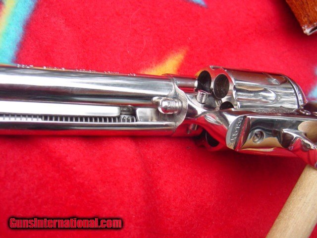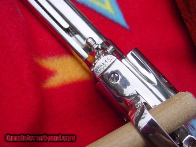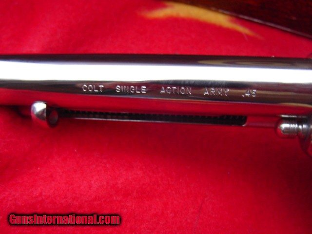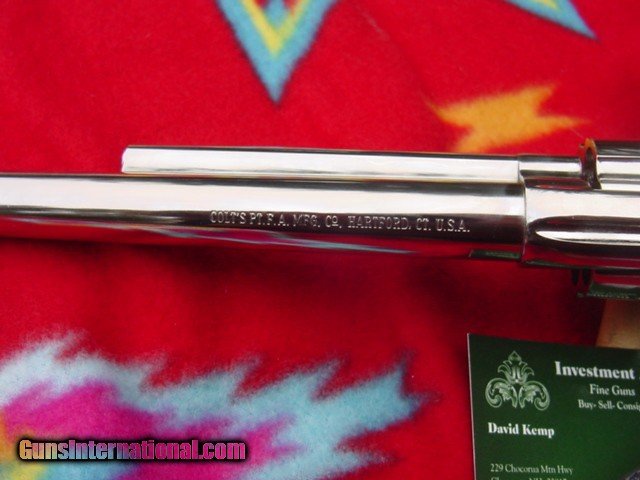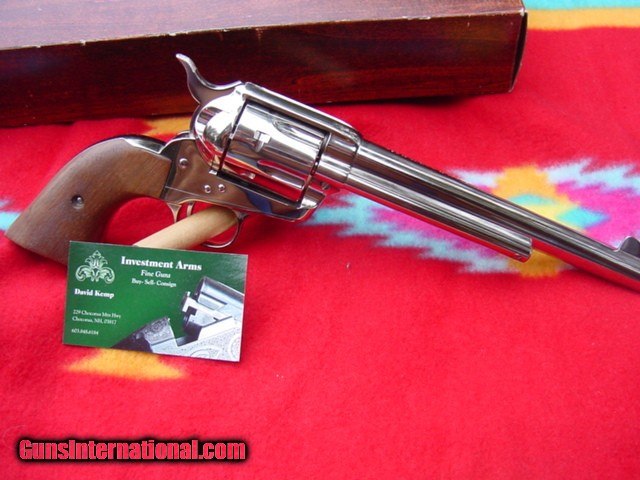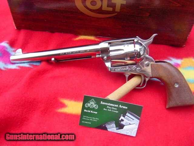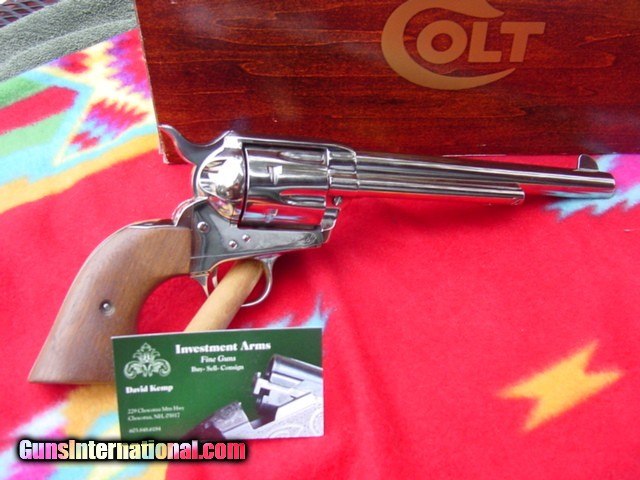 Description: SOLD Colt Single Action Army,7 1/2 45lc Nickel. Like new in box numbred to gun. Excellent Nickel Single action army in 45 Lc,manufacturd in 1978 and looks like it it did when it came out of Hartford. Shows on evidence of consumer firing, no turn line,no scratches all the nickel is bright. Offered at $2895 plus shipping-$45 USPS Priority to your FFL Happy to send along more pic’s, answer questions over phone or email. Please email your phone number so I can call back if I miss the call-do not have text sorry, thanks. Be sure to look at my other offerings for more guns,Merkel'sMannlicher Schoenauer's, Drillings, Combo's, Colt Saa's, Colt’s, Ruger’s, Browning’s,Kimber’s, Les Baer, Uberti'sby both Taylor and Cimarron, and Ferlib, Merkel G&H-Arrieta,Beretta,Parker Repro shotguns and other fine guns. Inventory always changing be sure to check with us for any needs. Local New Hampshire Buyer can view/purchase gun in person-after 4473/ NICS check, at Investment Arms business premise in New Hampshire Country Store, Rt 16 Chocorua NH. Please email/call 603.848.6184 Business or (603.323.8200 ) first to be sure its not sold. We also Buy and Consign Guns Payment by bank check, UPS money order-personal check held until clear 10 days. Buyer must provide dealers signed 01 FFL-email or hard copy, I will include a copy of my FFL with shipment. 3 day non firing inspection period(gun must be in same condition if returned)-starts when gun arrives at your dealer, on used guns only-not new guns sorry-they are under factory warranty, buyer pays shipping and insurance both ways if returned. SAFETY NOTICE: Buyer is solely responsible for determining that a used gun is safe to shoot. The firearms offered has been given a visual inspection for collection purpose only. It is a requirement that any used firearm be inspected by a qualified gunsmith before firing. By purchasing the firearm, the buyer agrees to hold seller harmless against damages, injury, or death caused by defective merchandise. SOLD |