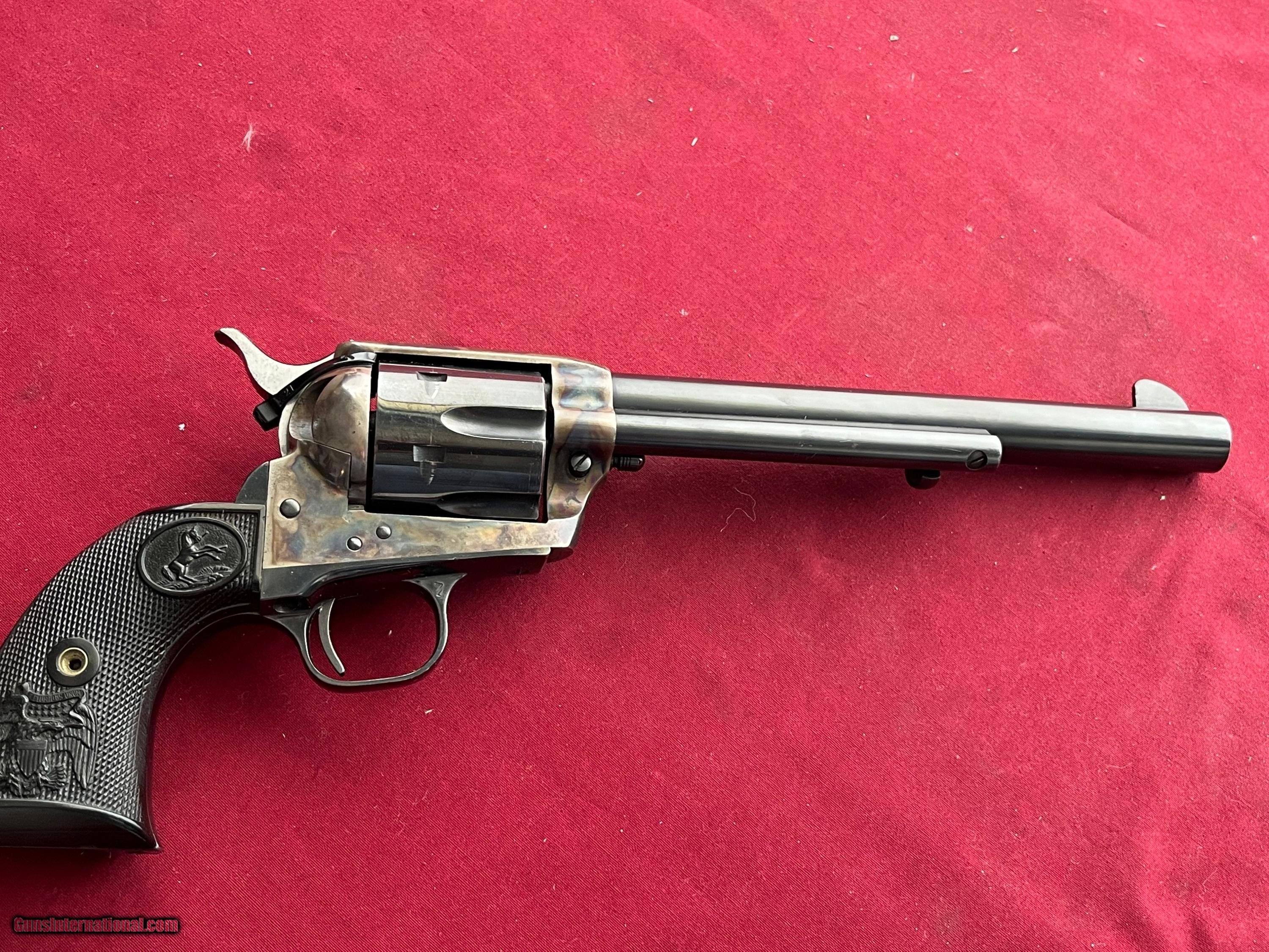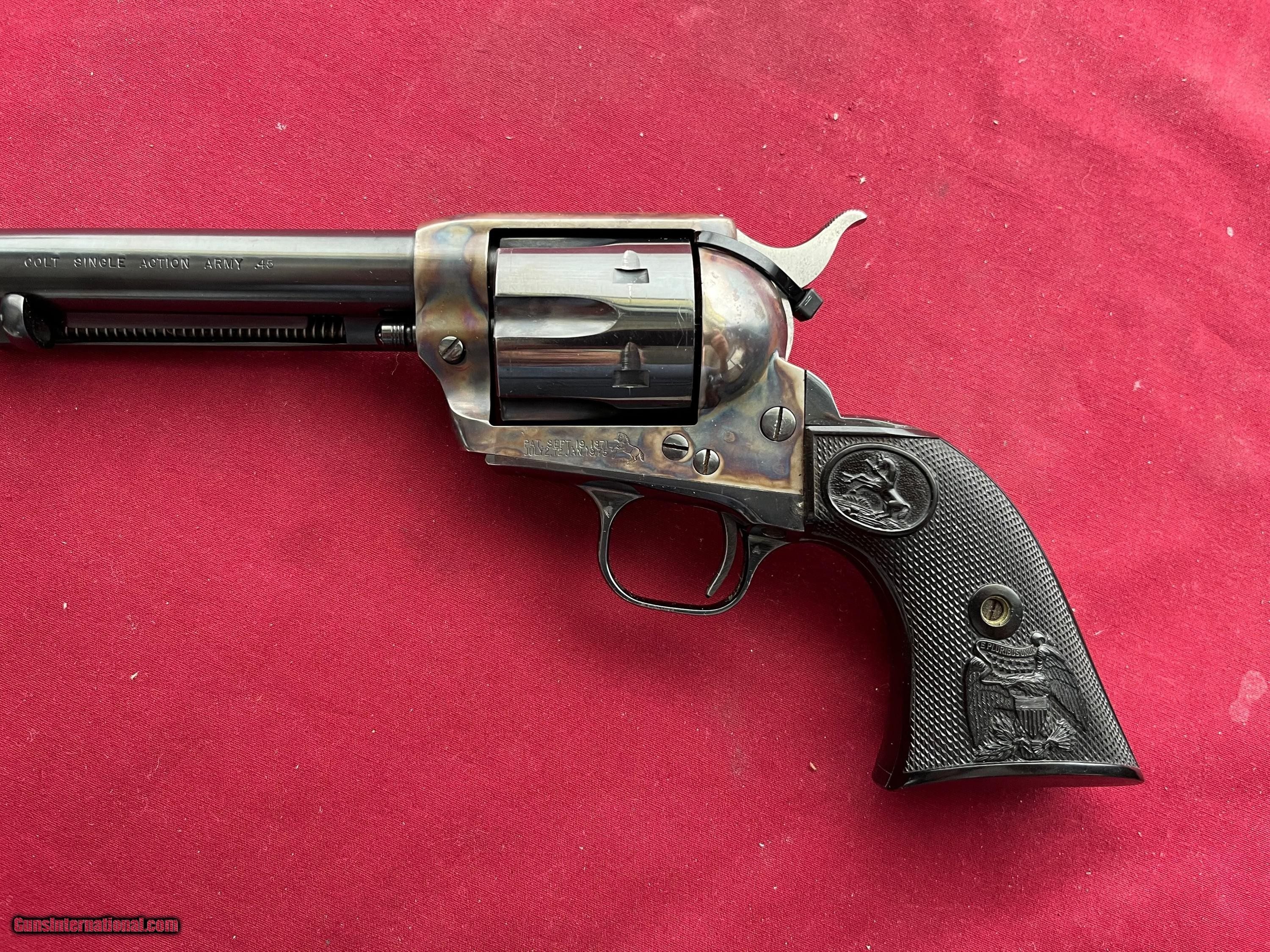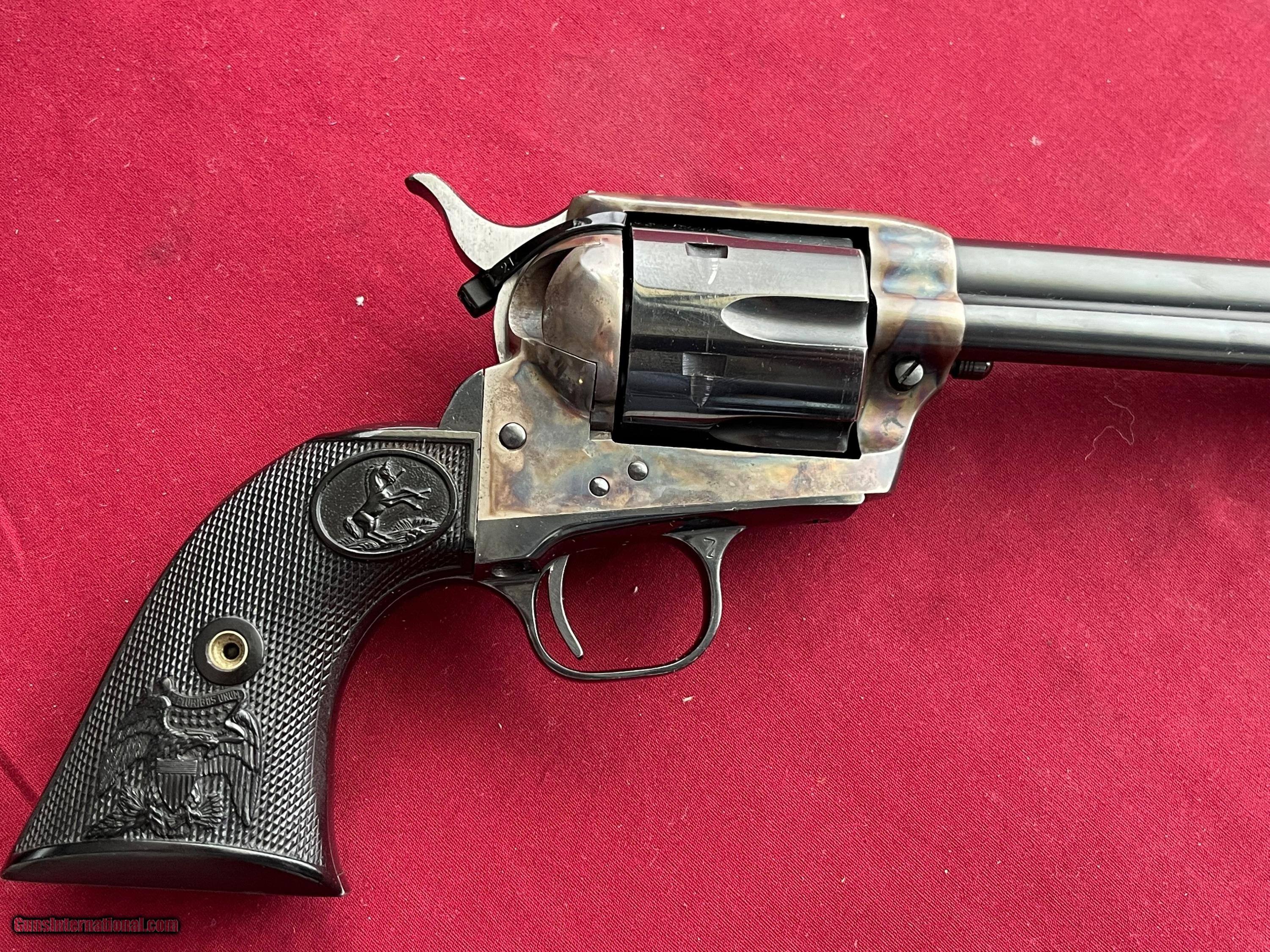 Description: COLT SINGLE ACTION ARMY 3ND GENERATION REVOLVER . SER# 80280SA MADE IN 1976, CALIBER 45 COLT . 71/2 INCH BARREL WITH AN EXCELLENT BRIGHT BORE. CASE COLORED FRAME. GUN MAY OF BEEN FIRED . IF SO IT WAS VERY VERY LITTLE. CYLINDER HAS A LIGHT TURN LINE. VERY NICE SOLID GRIPS. EASTERN BRANCH FIREARMS ADD 40.00 SHIPPING – NEXT DAY AIR SHIPPING ADD 50.00 SHIPPING – LONG GUNS GROUND OPTIONAL INSURANCE IS AVAILABLE AT 1.25 PER 100.00 Questions e-mail or call Glen at Eastern Branch Firearms 207-215-5021 TERMS – PLEASE READ BEFORE I DO NOT HAVE A LAYAWAY OPTION ( WE ACCEPT CREDIT CARDS ) -- I GET ALOT OF REQUEST FOR TRADES, I WOULD PERFER NOT TO DO TRADES ON MY INTERNET LISTINGS PAYMENT OPTIONS- We accept money orders, cashier’s checks , bank checks. sorry no personal checks. We accept all major credit cards please add 3% to the ’s cash discount price.(Shipping within the state of Florida - Florida Residents must pay sales tax) .Handguns and long guns do need to be shipped separate. PLEASE do not send payment via FED EX . USPS & UPS are fine. Thank you. We include a signed copy of our FFL with each firearm shipped. SAFTY NOTICE- Buyer is solely responsible for determining that a used gun is safe to shoot. The firearms offered have not been test fired but have been given a visual inspection only for purposes. It is a requirement that every used firearm is inspected by a qualified gunsmith before firing. By , the buyer agrees to hold seller harmless against damages, injury, or death caused by defective merchandise. RETURN POLICY- All firearms come with a 3-day non firing , non messing with ( turning srews ,taking apart,removing parts, scoping. firing, cleaning or messing with in anyway) inspection/return privilege.Inspection is based on a visual review of the gun to confirm the gun is in the condition stated. In the case of a return, buyer pays all shipping charges & if paid for with a credit card buyer absorbs the 3% credit card charges . So please ask questions BEFORE you bid. Thanks for Looking and Good Luck!! U.S. sales only, no exports…this includes antiques. I will ship to third party for exporting SOLD |