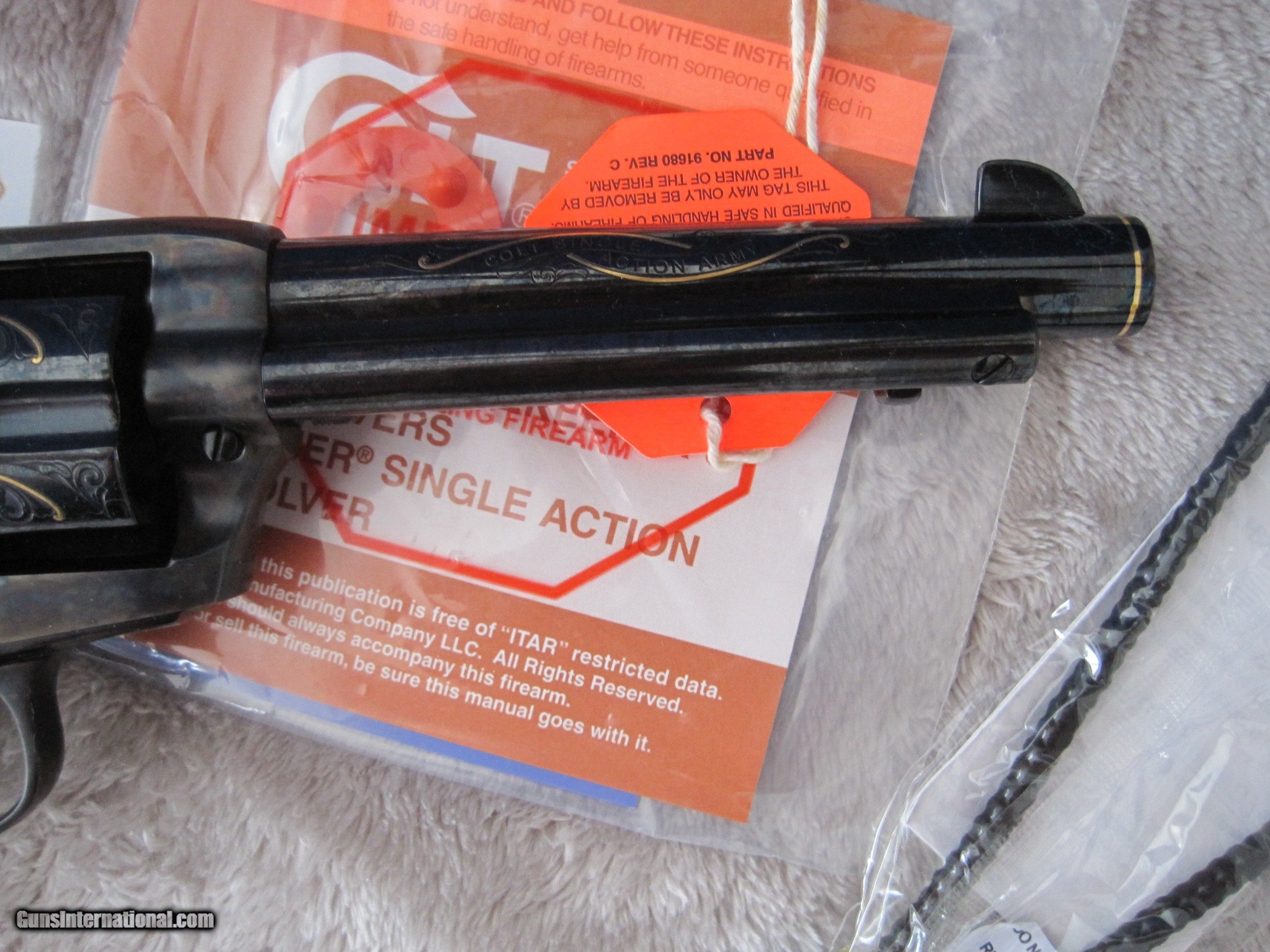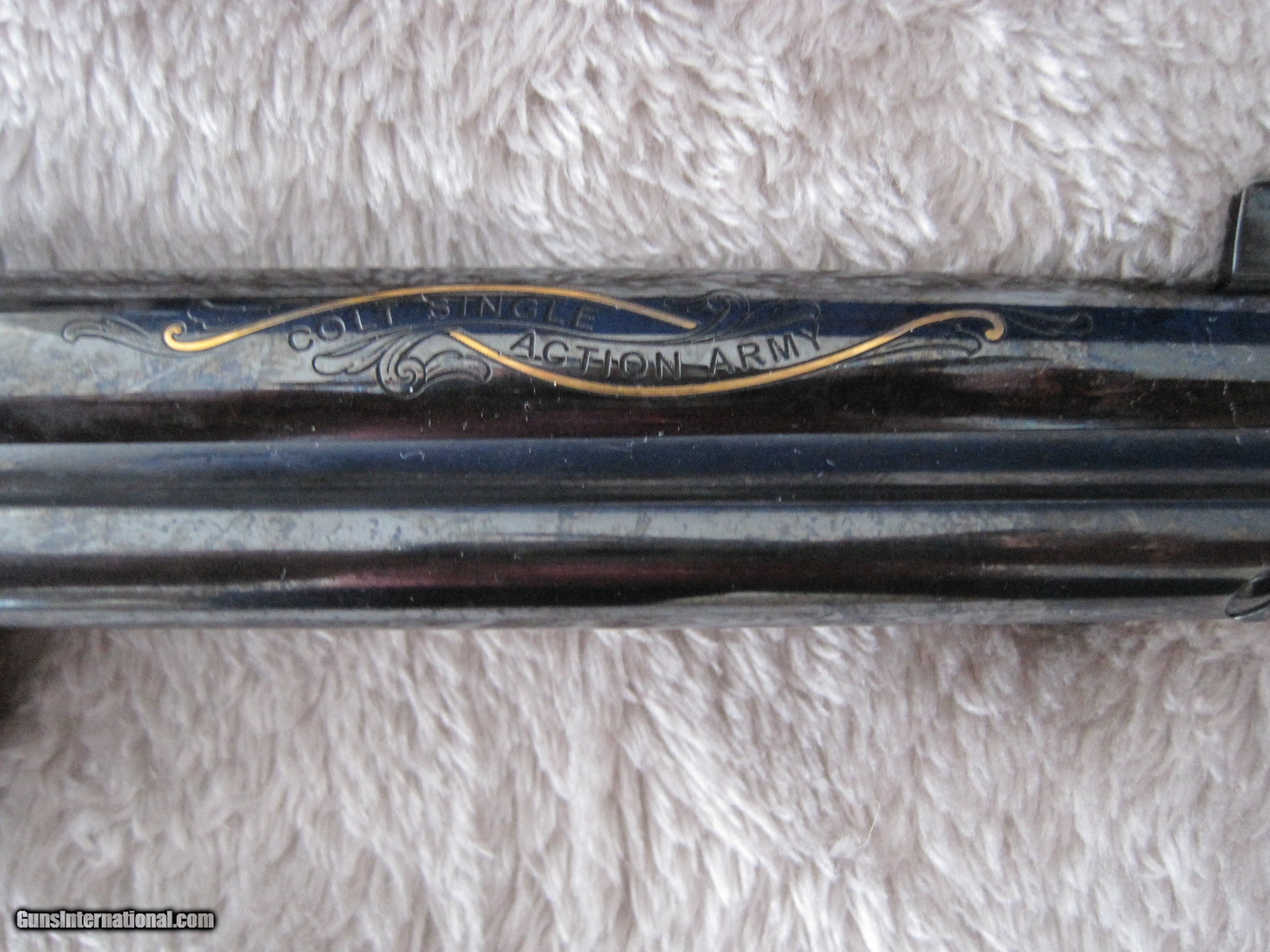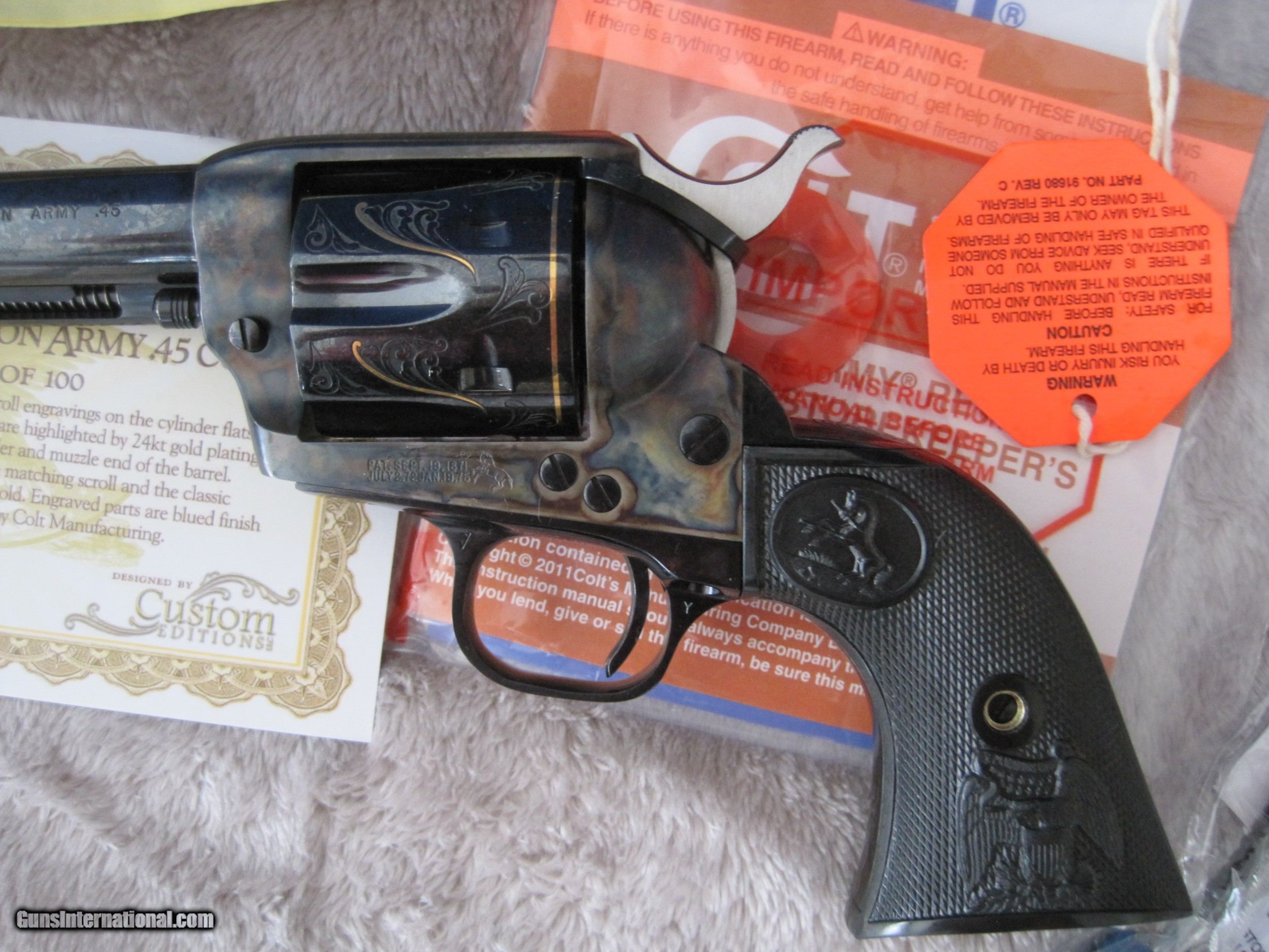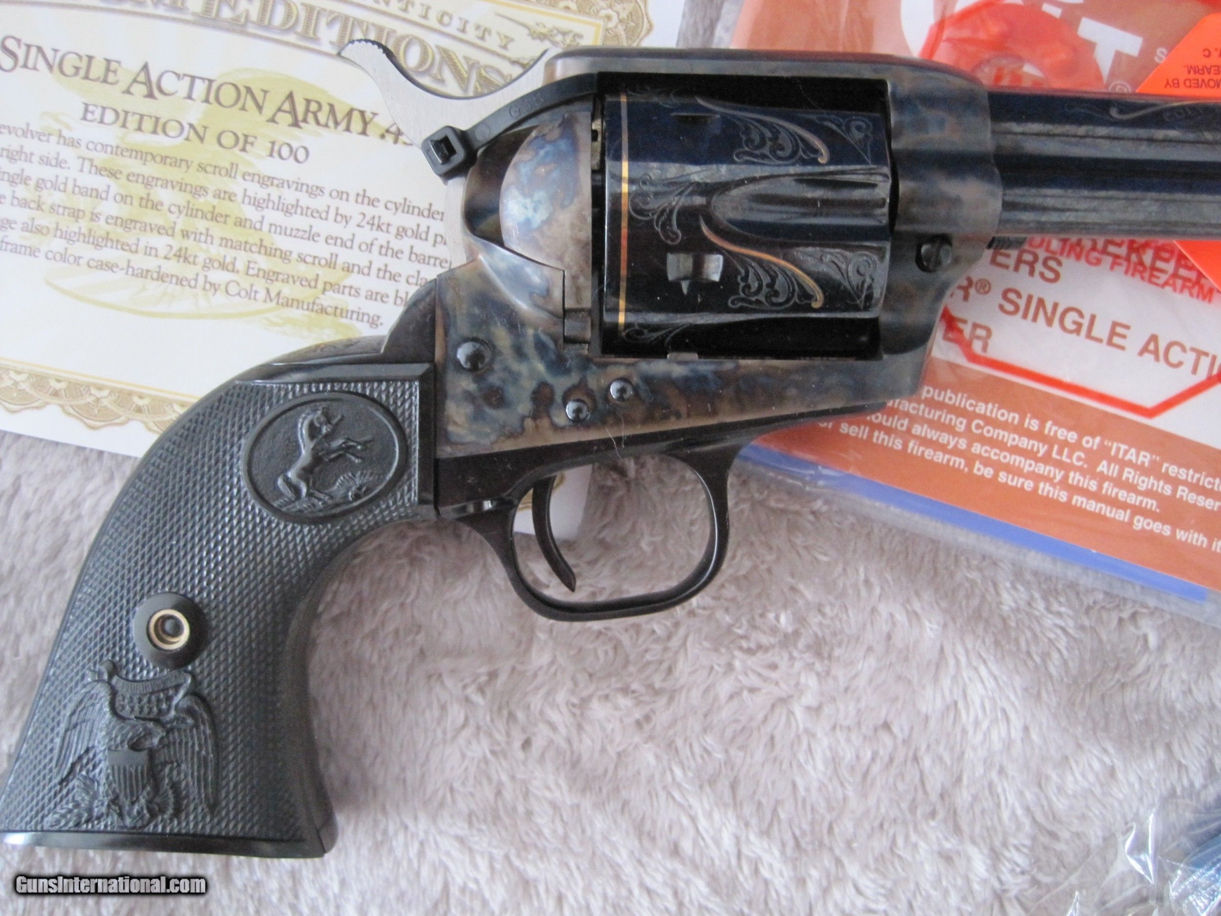 Description: SALE PENDING Colt Single Action Army 45 Colt with 5.5" barrel. Very tasteful scroll engraving highlighted by 24kt gold inlay on the cylinder and muzzle end of the barrel. The top of the backstrap is engraved with matching scroll and the classic Rampant Colt image also highlighted in 24 kt gold. Engraved parts are blue finish, the frame is case-hardened with beautiful brilliant colors. This is a 1 of 100 edition from Colt. This revolver is new old stock from the Colt Custom Shop manufactured in 2014. The revolver still has the original factory grease on it, any marks you see are either the grease or lint, or a smudge on the grease. No turn line and unfired. Includes the original shipping box, paperwork, lock, and white outer sleeve numbered to the revolver. It doesn't get much better than this if you are looking for an all original new old stock Colt Single Action Army revolver. This is a beautiful revolver. No sales to CA. Must ship to an FFL Shipping is $60, not including HI or AK. SOLD |