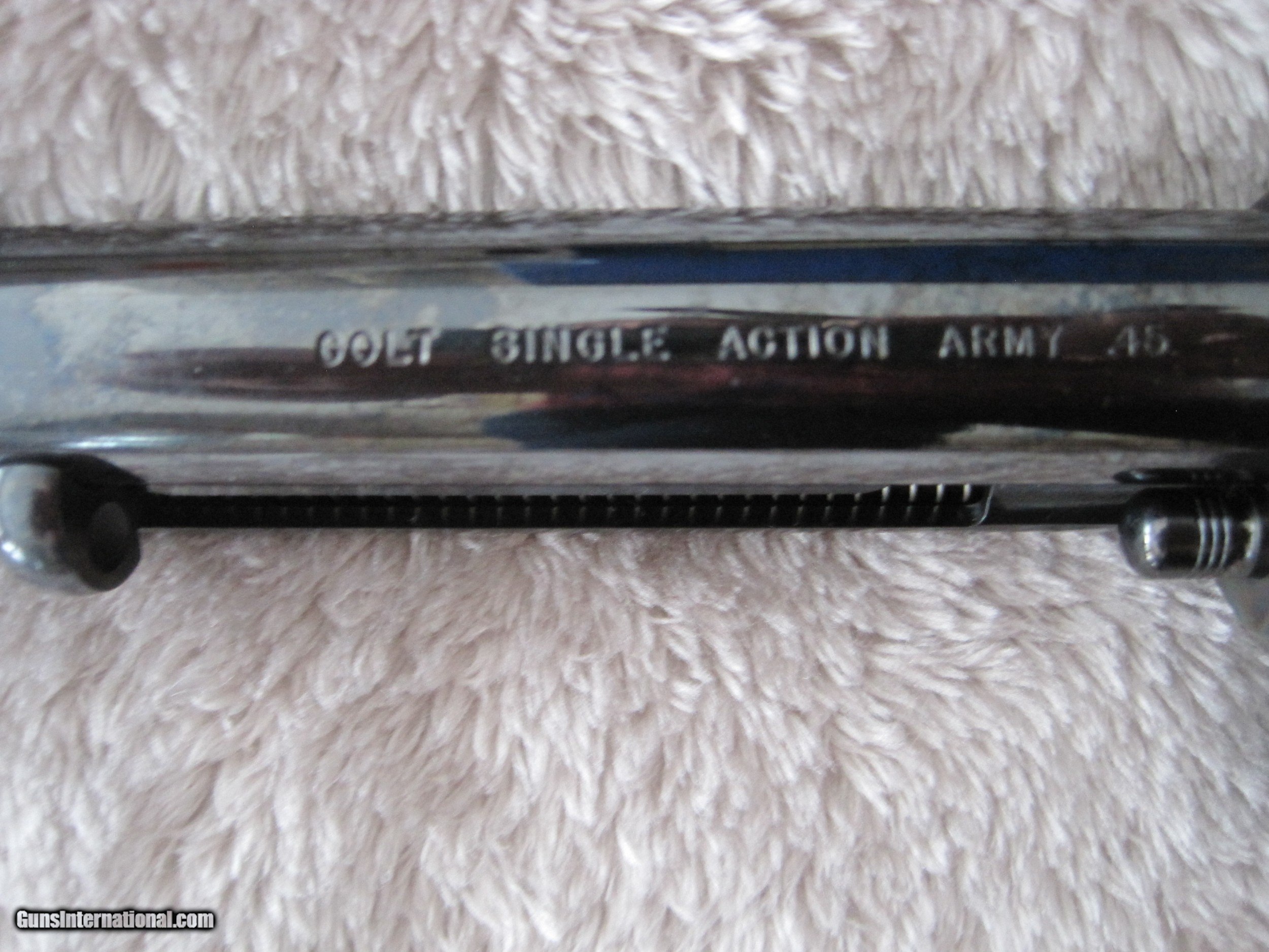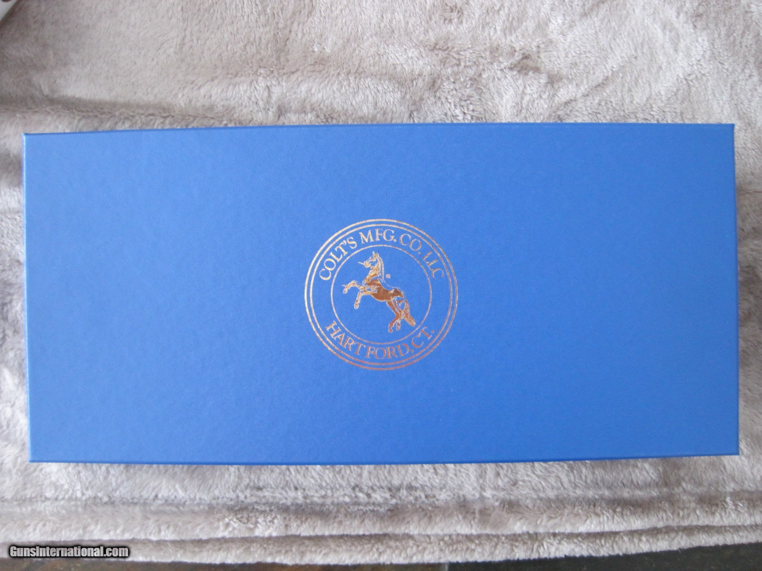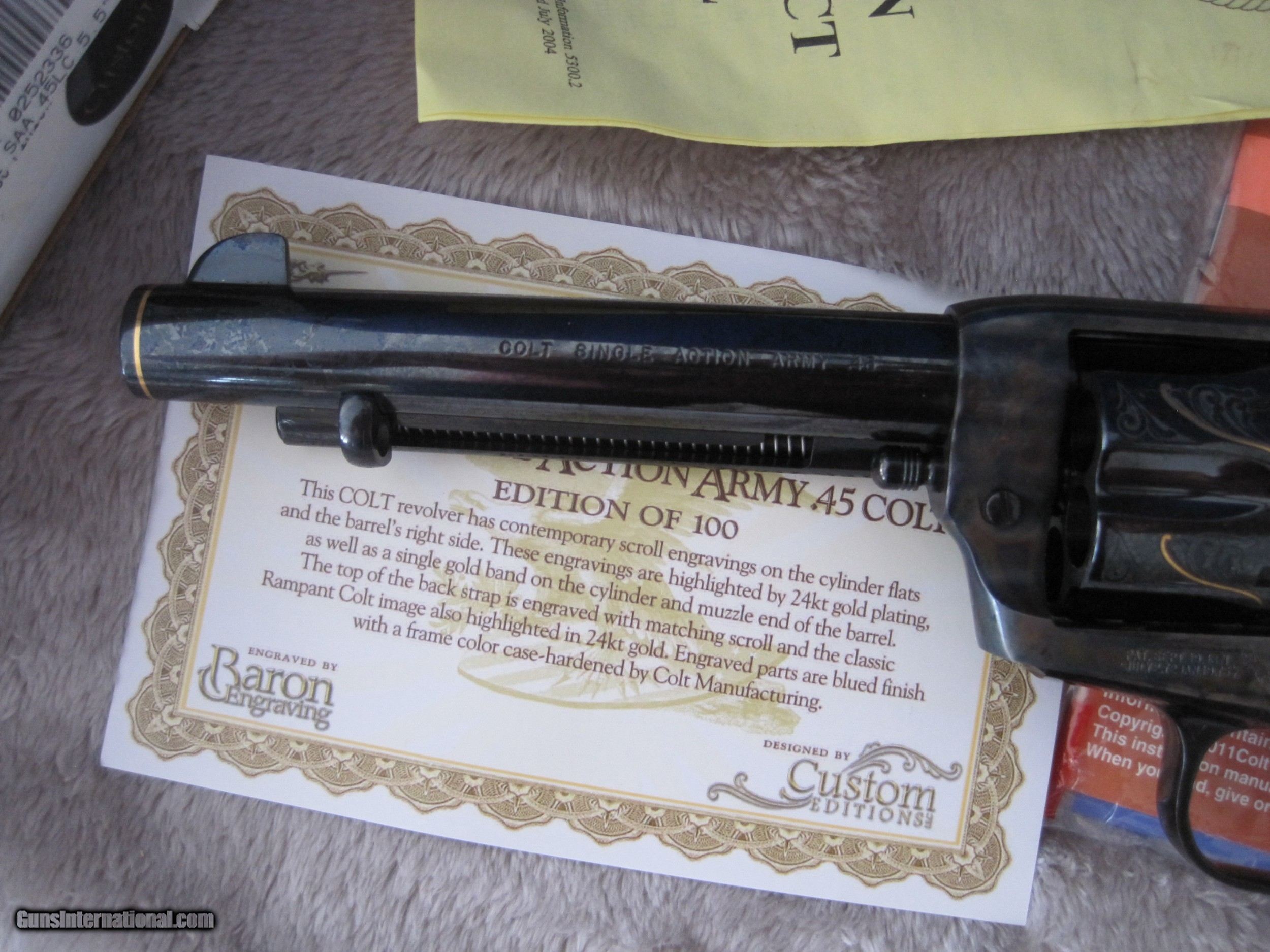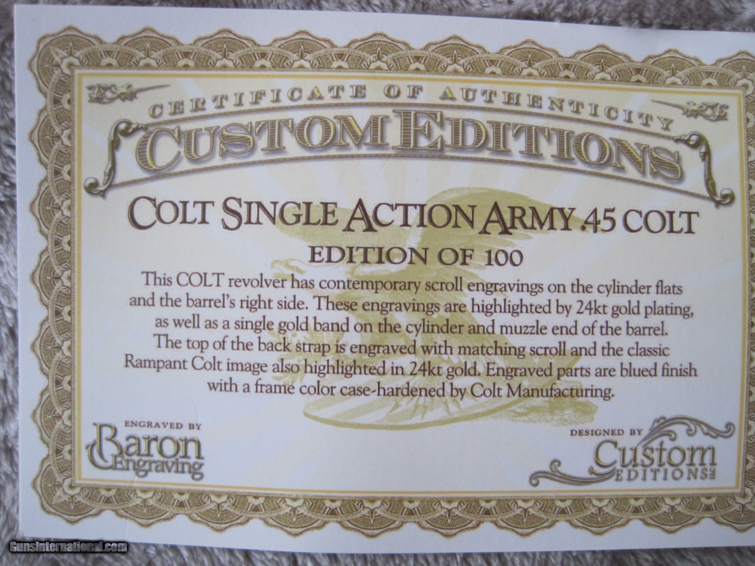 Description: SALE PENDING Colt Single Action Army 45 Colt with 5.5" barrel. Very tasteful scroll engraving highlighted by 24kt gold inlay on the cylinder and muzzle end of the barrel. The top of the backstrap is engraved with matching scroll and the classic Rampant Colt image also highlighted in 24 kt gold. Engraved parts are blue finish, the frame is case-hardened with beautiful brilliant colors. This is a 1 of 100 edition from Colt. This revolver is new old stock from the Colt Custom Shop manufactured in 2014. The revolver still has the original factory grease on it, any marks you see are either the grease or lint, or a smudge on the grease. No turn line and unfired. Includes the original shipping box, paperwork, lock, and white outer sleeve numbered to the revolver. It doesn't get much better than this if you are looking for an all original new old stock Colt Single Action Army revolver. This is a beautiful revolver. No sales to CA. Must ship to an FFL Shipping is $60, not including HI or AK. SOLD |