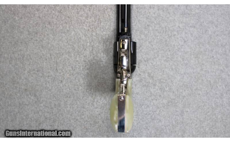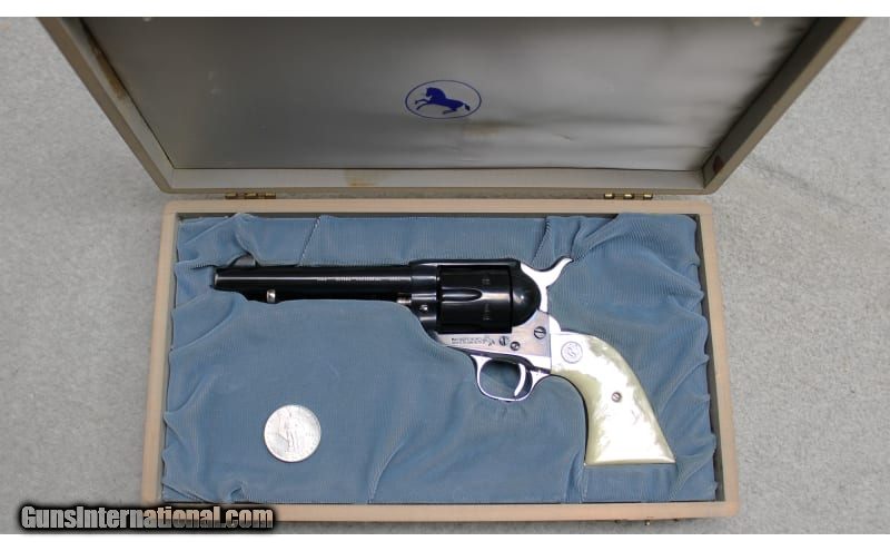 Description: Colt Single Action Army revolver Nevada Centennial chambered in .45 Colt. Produced in 1964 to commemorate the Nevada state centennial. Features include a 5-1/2 inch barrel and matching serial numbers. Comes in a fabric-lined presentation case with commemorative coin. .45 Colt SOLD Metal Condition: Very Good with Minor Handling Marks Wood Condition: Very Good with Minor Handling Marks Bore Condition: Bright And Clear with No Pitting Barrels: 5.5 inch Butt Pad: Pearl with Colt Medallion Weight: 2 lbs 4 oz Item Location: Fort Worth, TX |