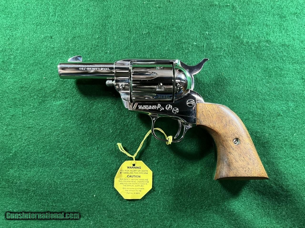 Description: Colt Single Action Army Sheriffs model nickle finish. .44 special and .44-40, two cylinders. New in box. SALE PENDING SOLD Handgun Caliber: .44-40 Winchester (.44 WCF), .44 Manufacturer: Colt Model: Single Action Army Condition: New Finish: Nickle |