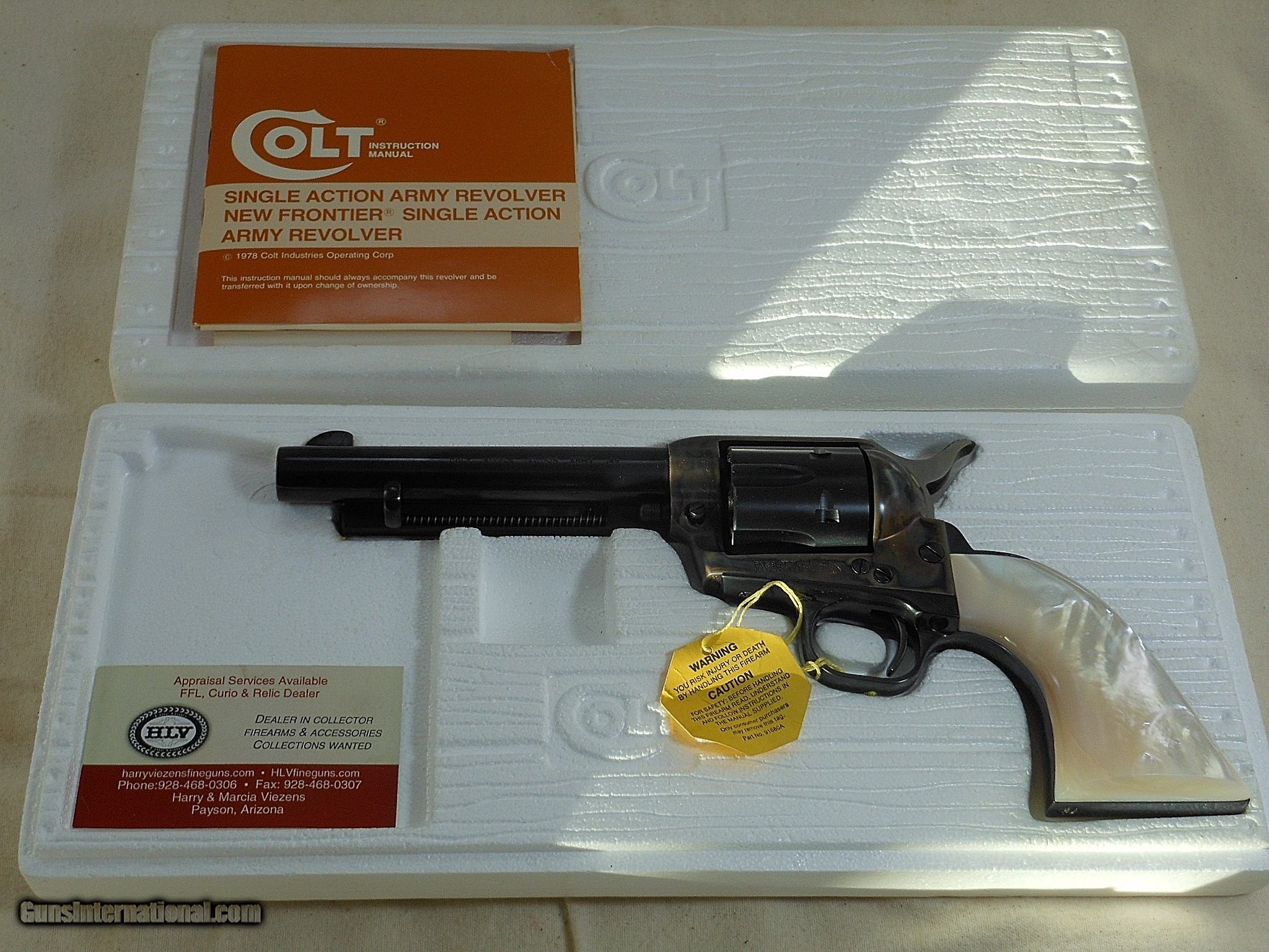 Description: SOLD This Colt was produced in 1980. The pistol's serial number is SA 31518. It has the 5 1/2 Inch barrel chambered for the 45 Colt cartridge. This pistol is new in it's original box! The Colt has the color cased frame with beautiful color case! The bluing is deep and strong. The action has not been cocked or worked. The Mother Of Pearl grips are one piece stocks. These grips appear to be real pearl! They are heavy and cool to the touch. These grips are really stunning looking! It is really rare to see pearl grips now! This Colt really stands out with these amazing grips! The end label also mentions these grips. The box sleeve is in fine condition The end label is intact. The pamphlet is in the box with other papers. This Colt has the "WOW" factor and would be a standout in any collection! Modern LAEE (6) F. No. 606 -22 SOLD Handgun Caliber: .45 Colt Manufacturer: Colt Model: Single Action Army Serial Number: SA 31518 Barrel Length: 5 1/2 Inch Chambers: AS New Condition: New Metal Condition: As New Bore Condition: As New Barrels: 5 1/2 Inch Barrel Type: Round Action: Single Action Finish: Blued Color Cased Sights: Standard Manufacture Date: 1980 Extras: Original Box And Accessories |